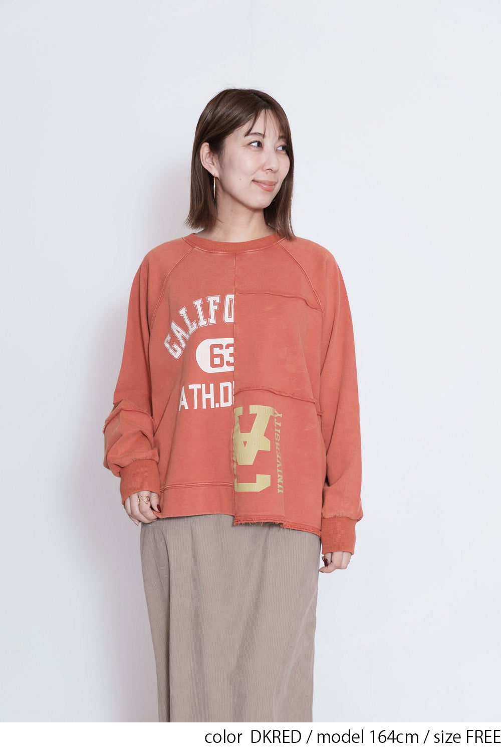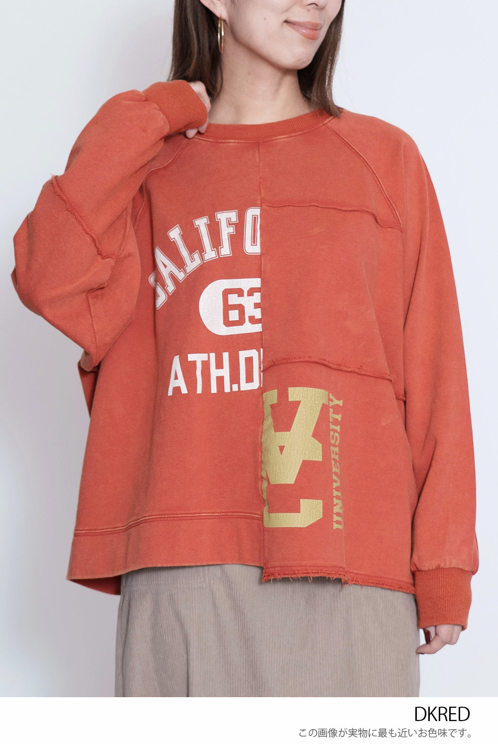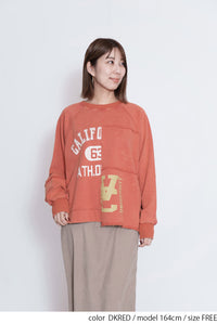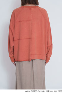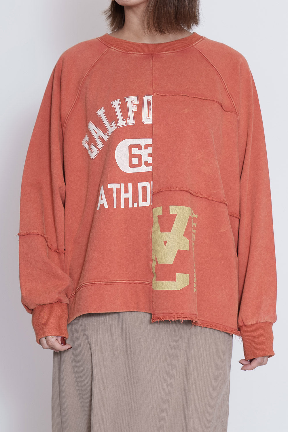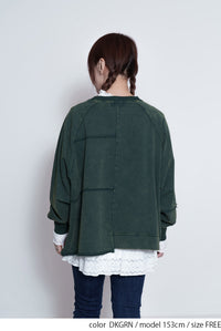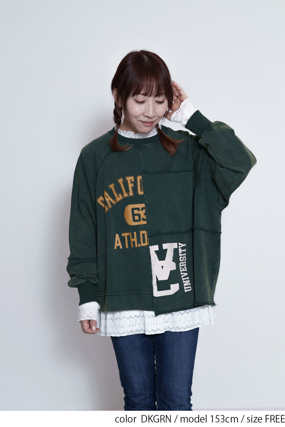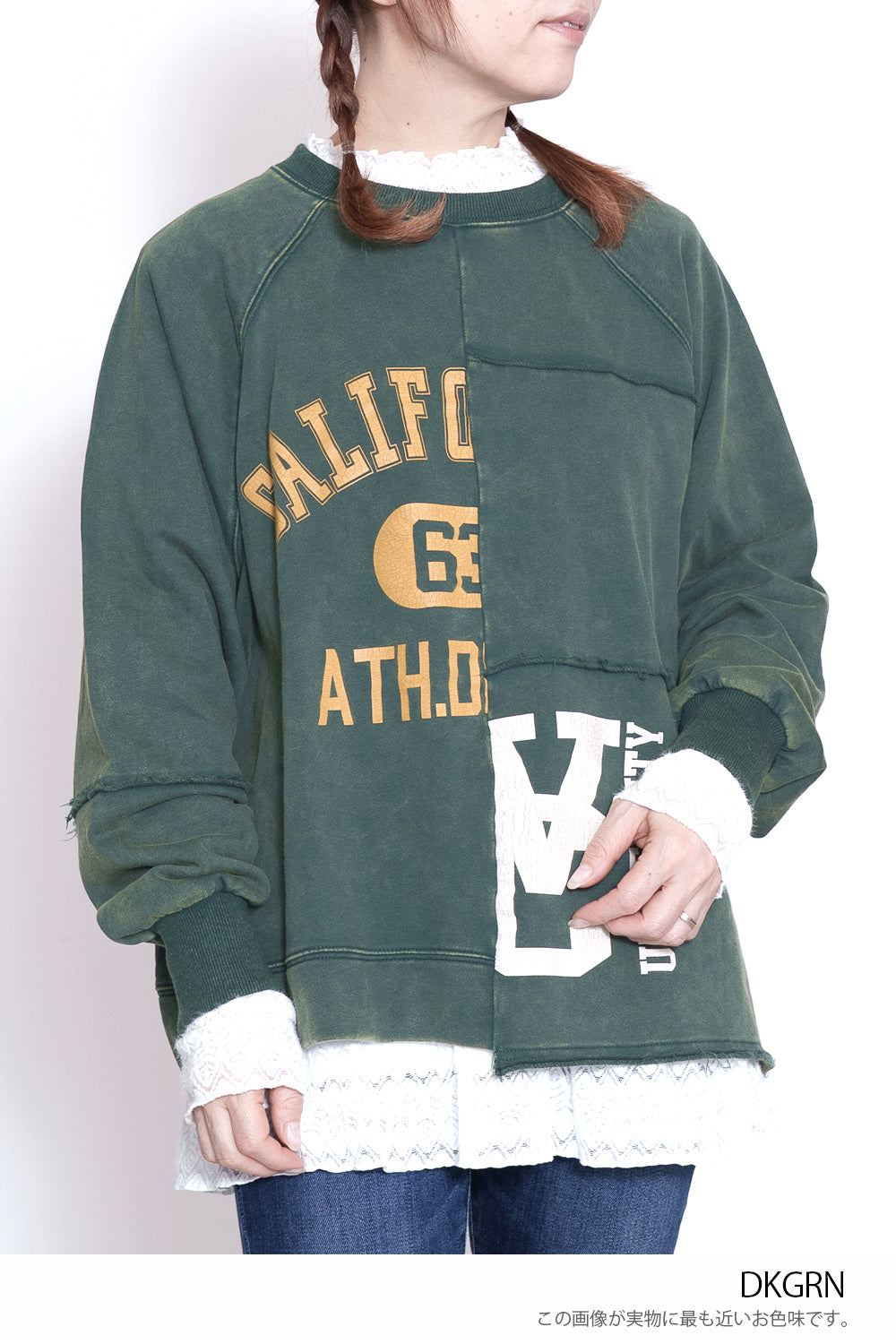 裏面を活かしたようなパッチワーク風の切替デザインが印象的で、1枚でスタイリングが決まる存在感のあるアイテム。