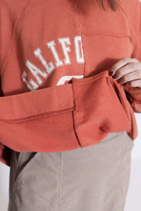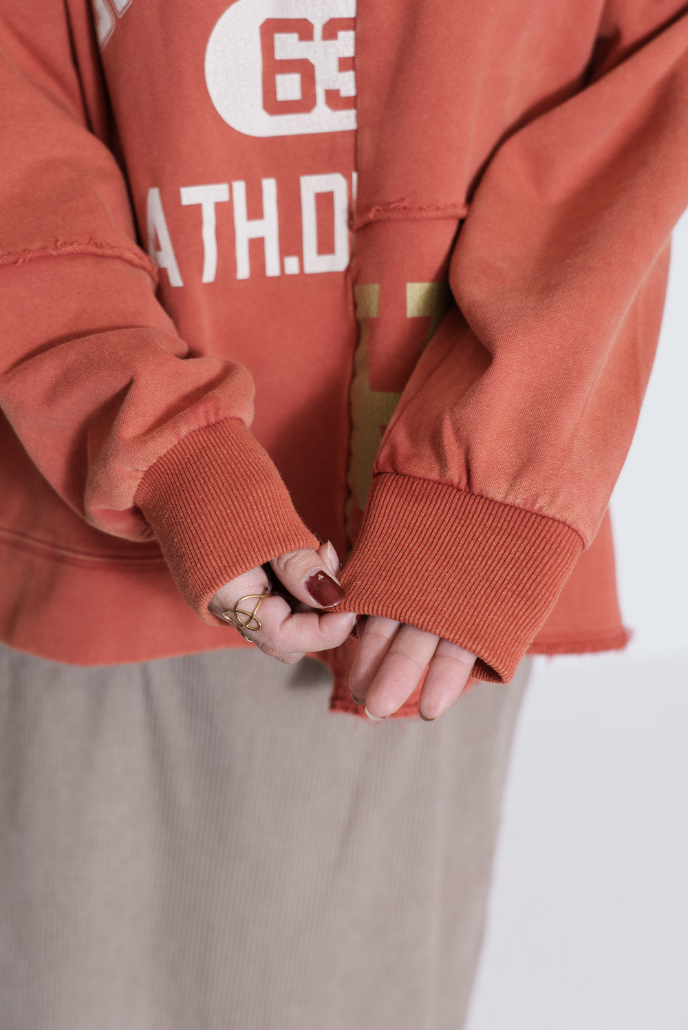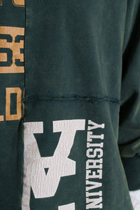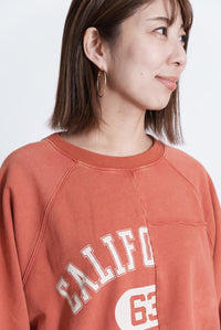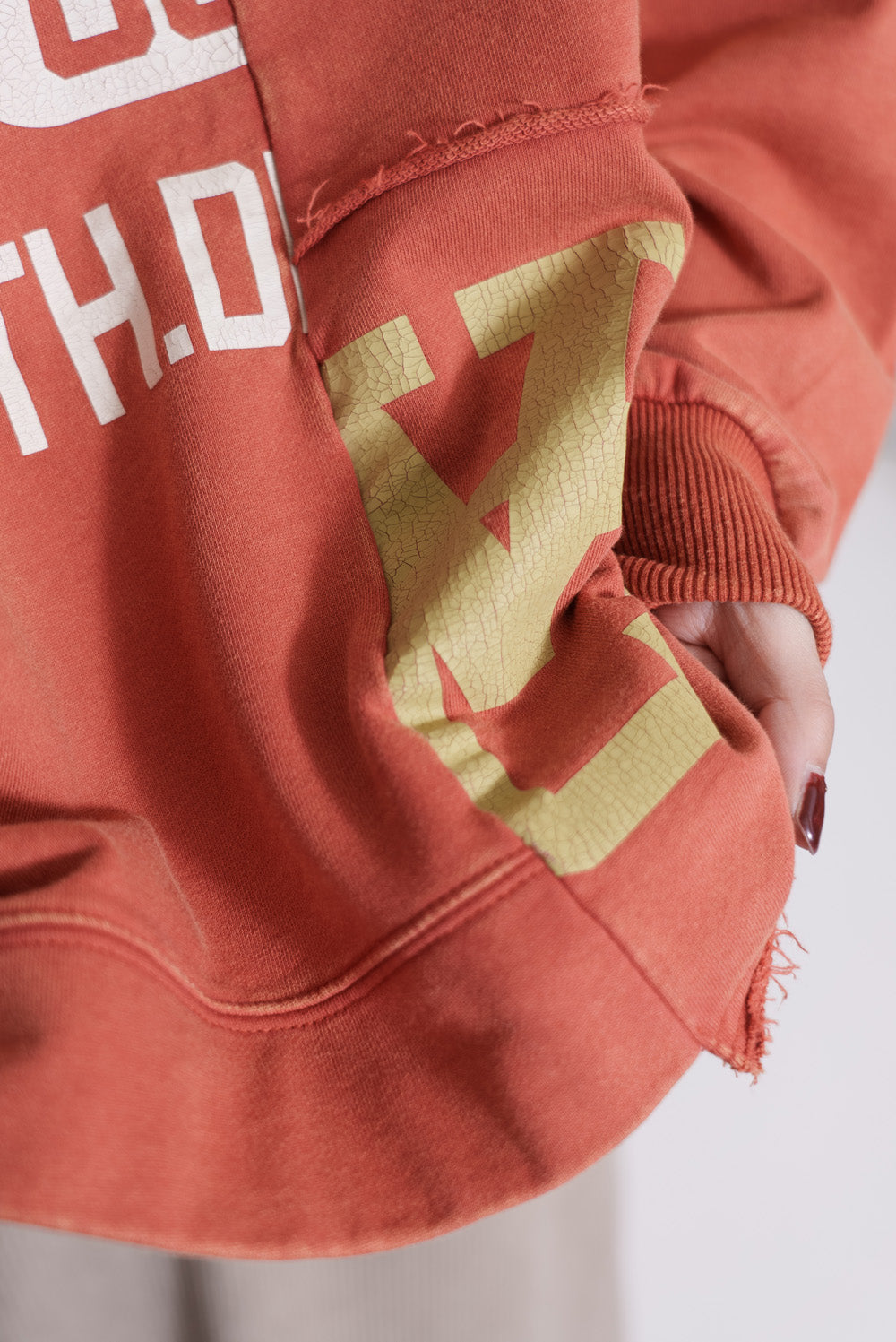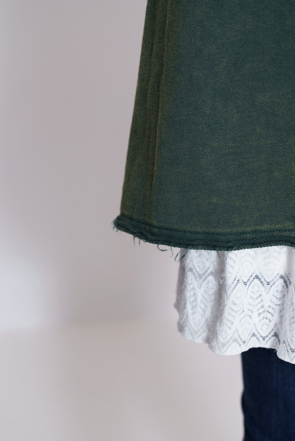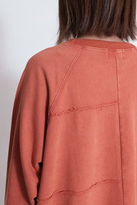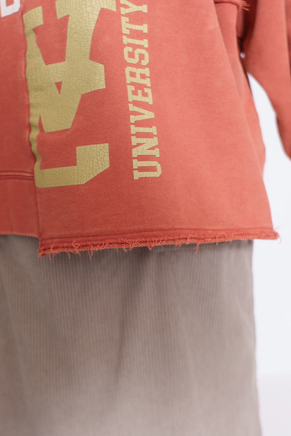 裏面を活かしたようなパッチワーク風の切替デザインが印象的で、1枚でスタイリングが決まる存在感のあるアイテム。