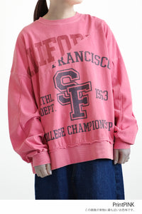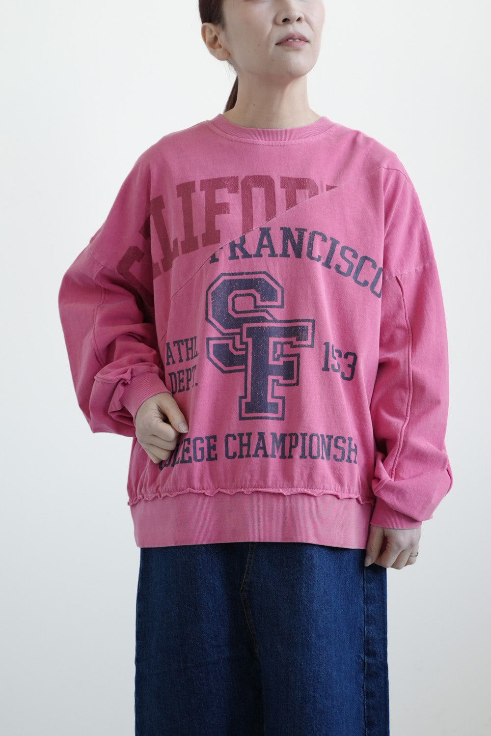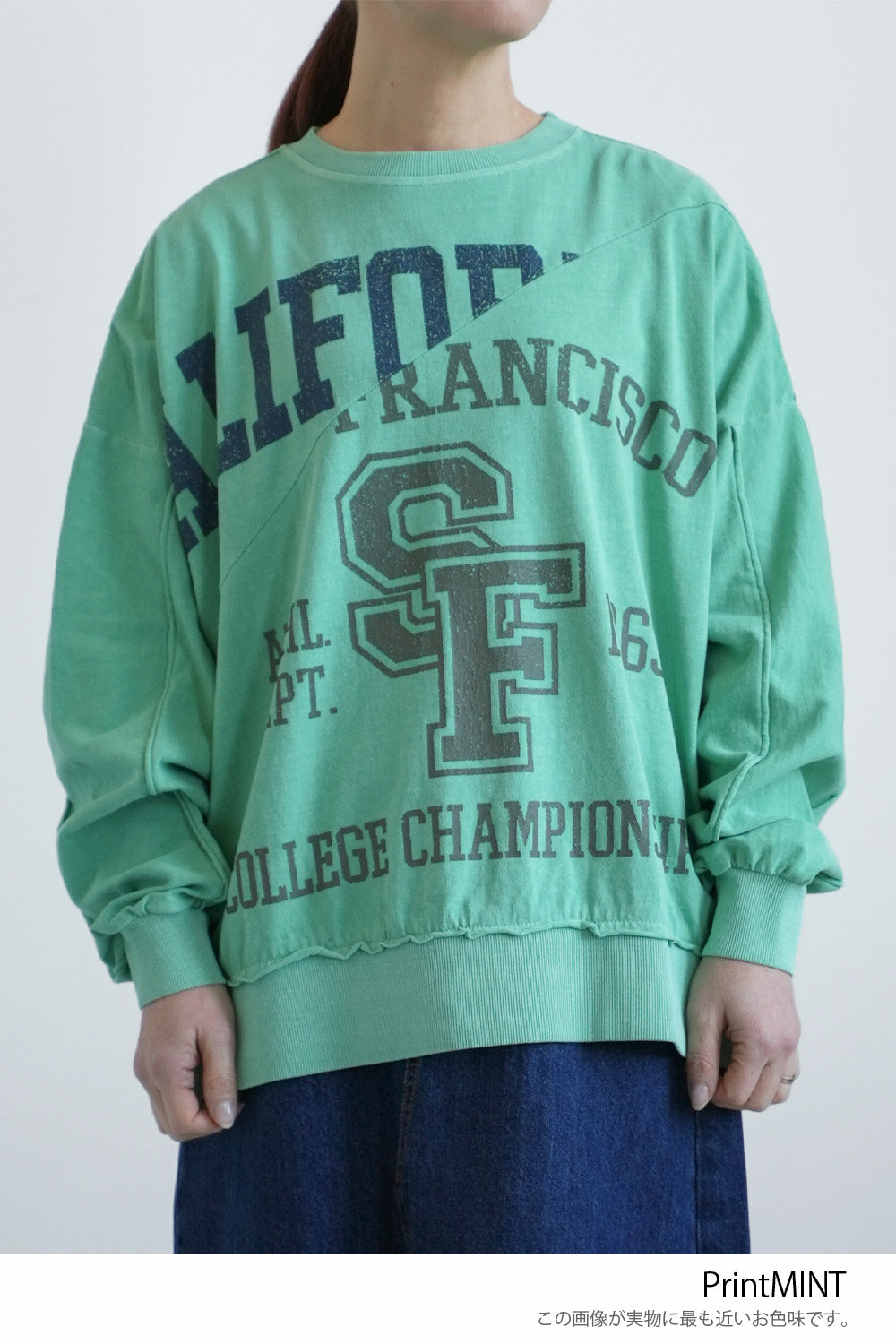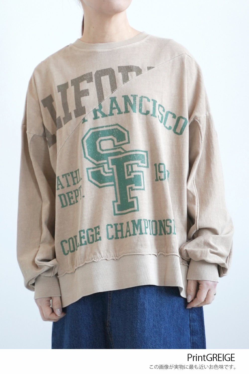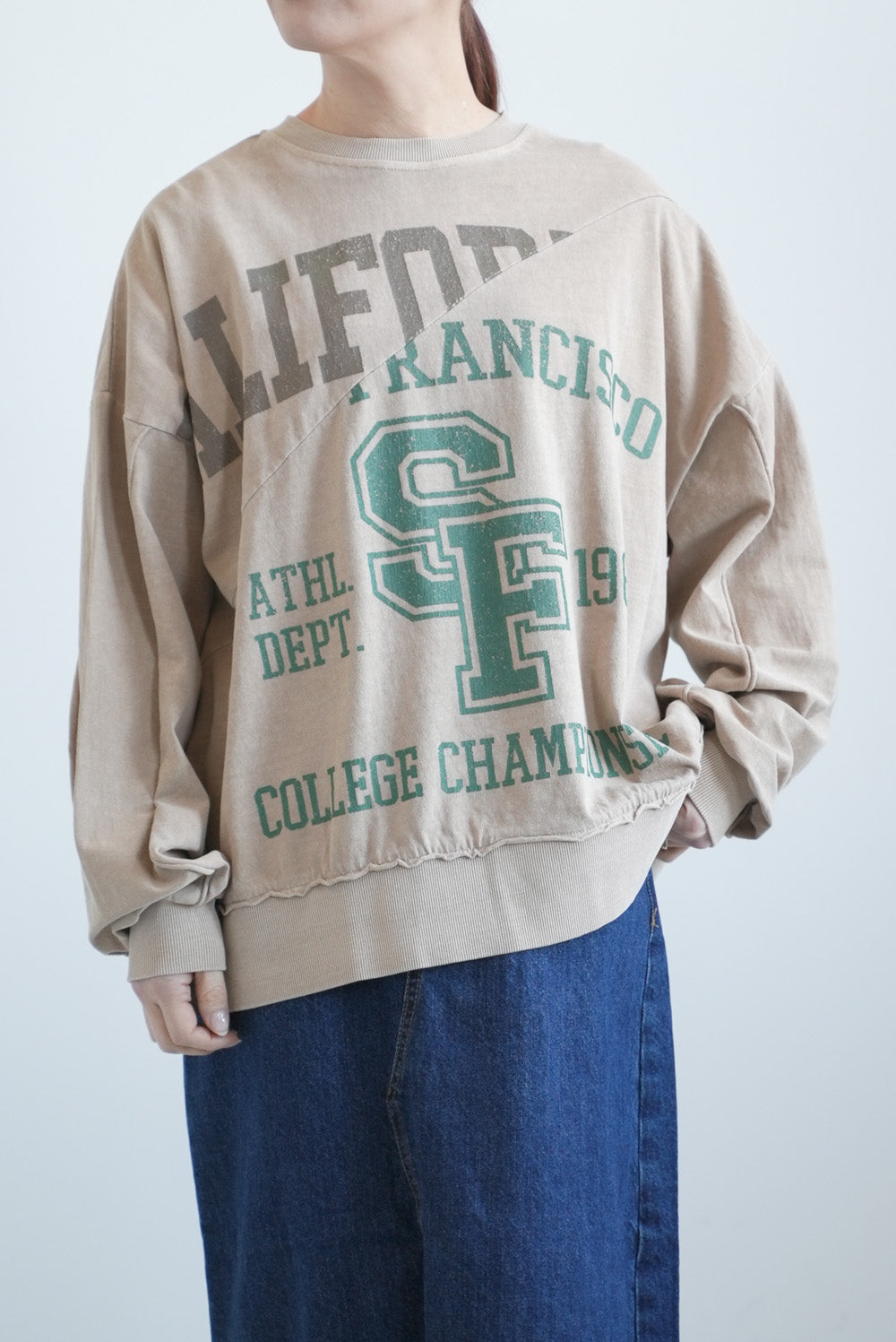 大胆に入ったカレッジ風ロゴと、斜めの切り替えデザインがコーデの主役に。