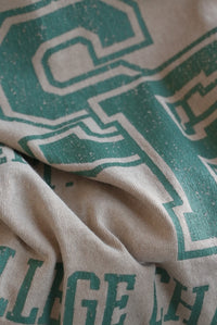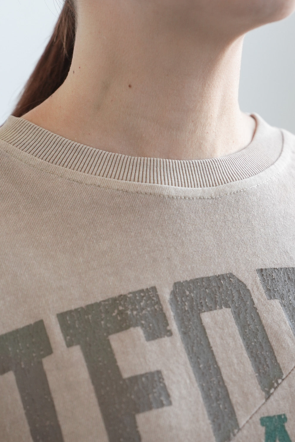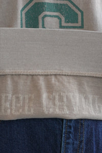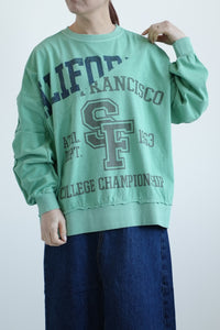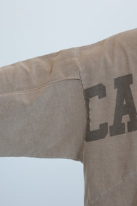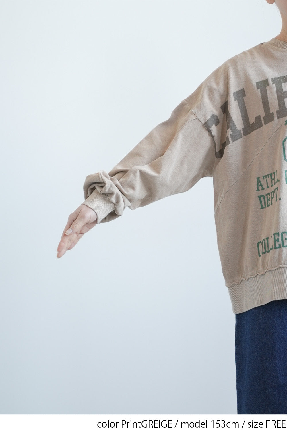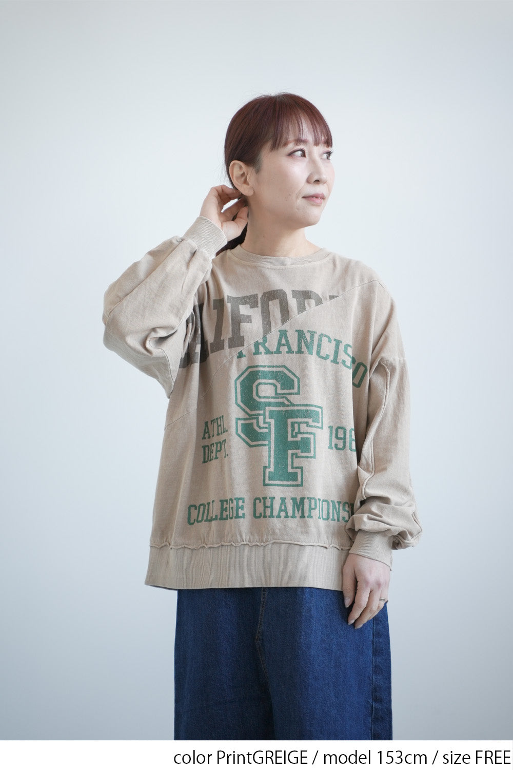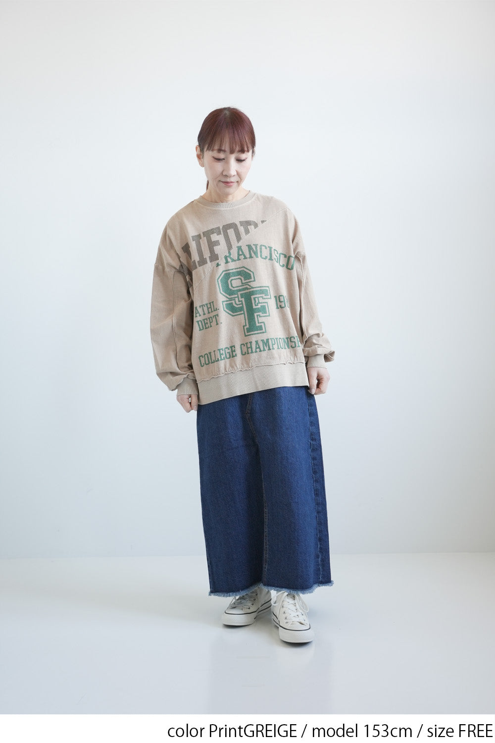 大胆に入ったカレッジ風ロゴと、斜めの切り替えデザインがコーデの主役に。