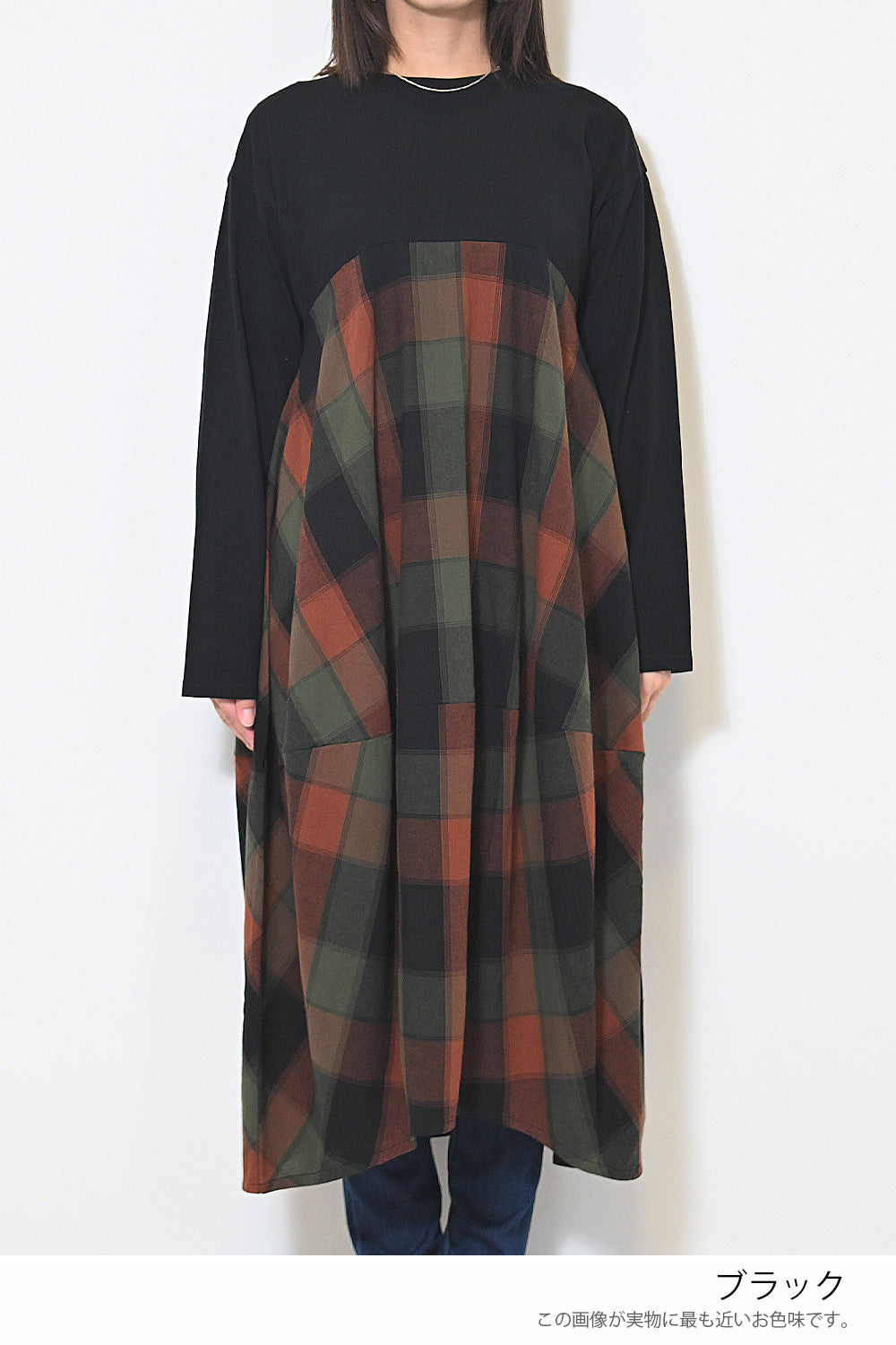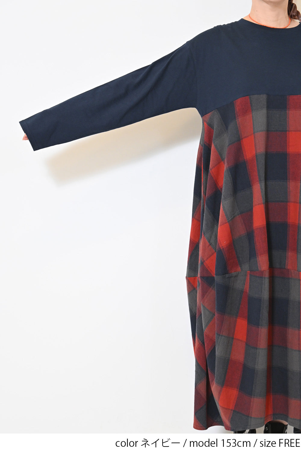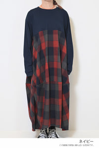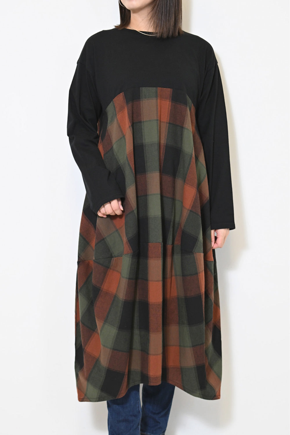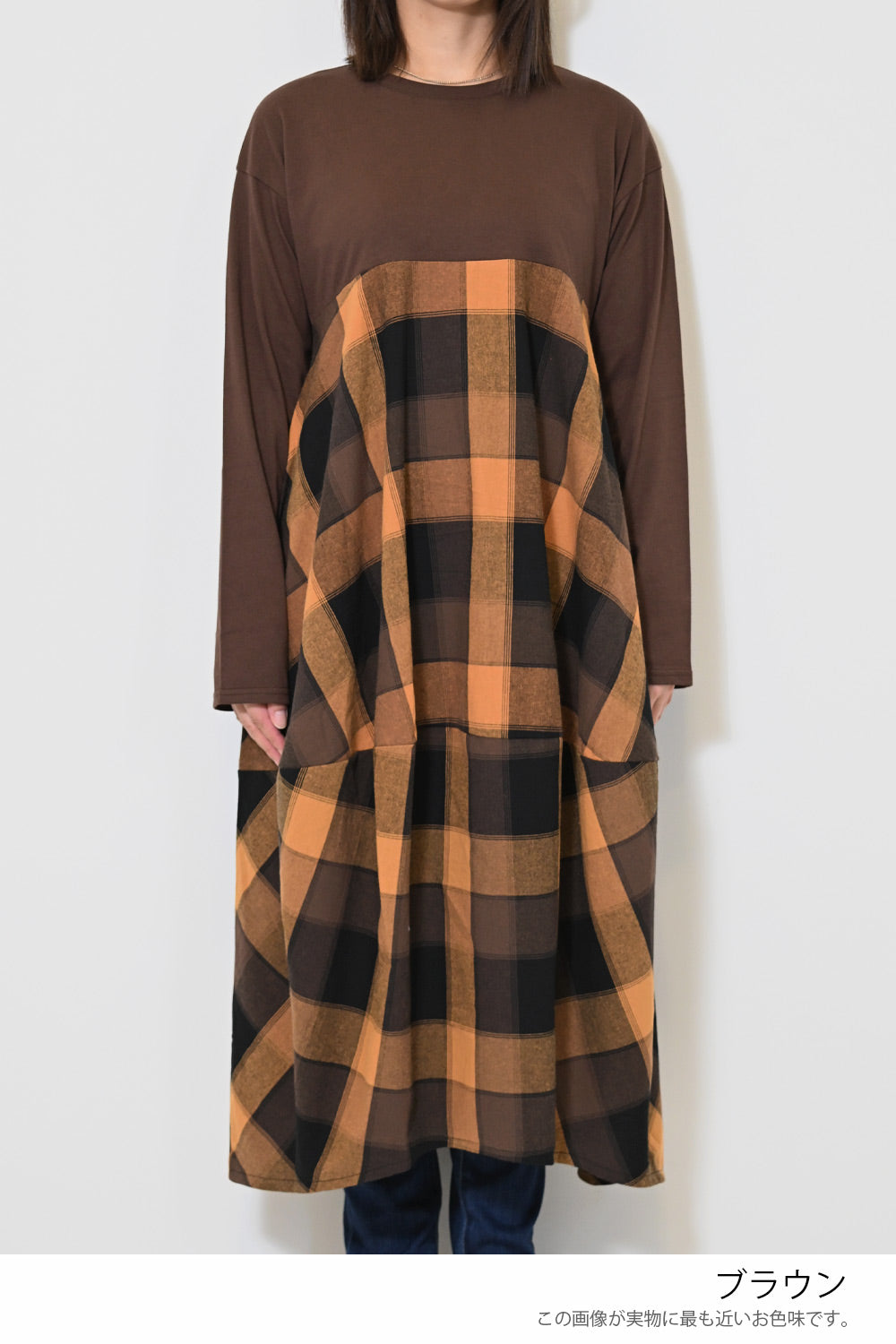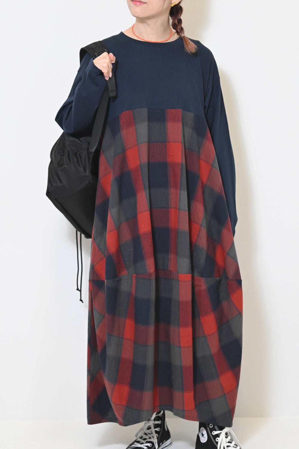 シンプルな無地カットソーに、胸下からふんわり広がるチェック柄のコクーンスカートをドッキングした、1枚でサマになるワンピース。