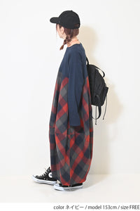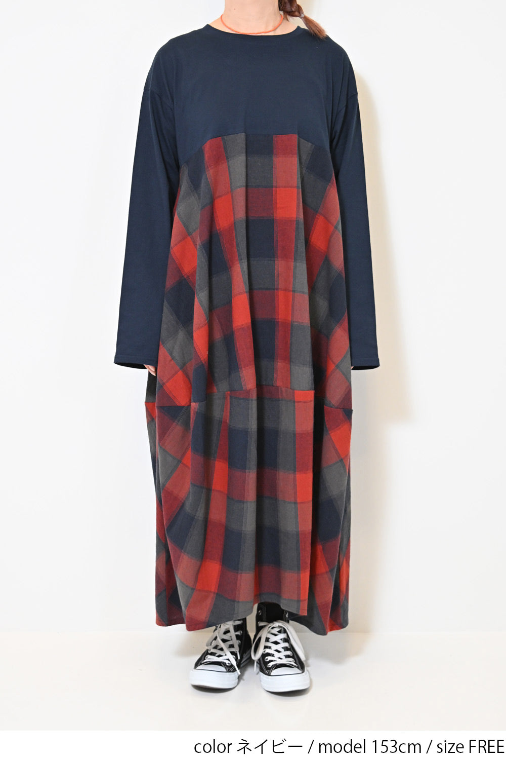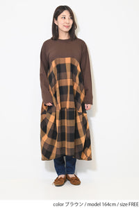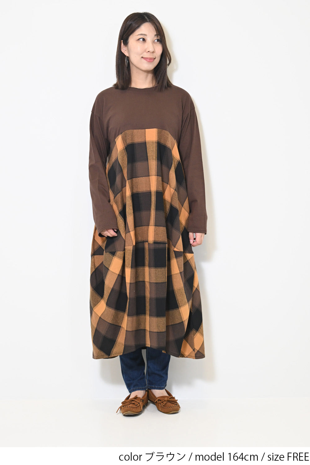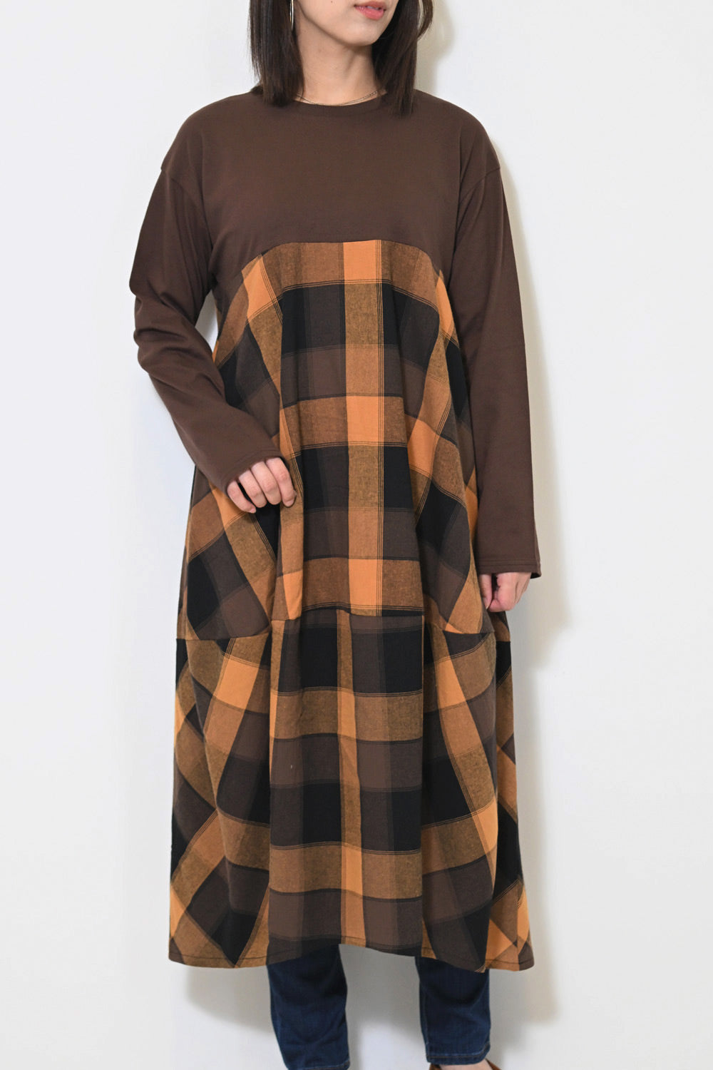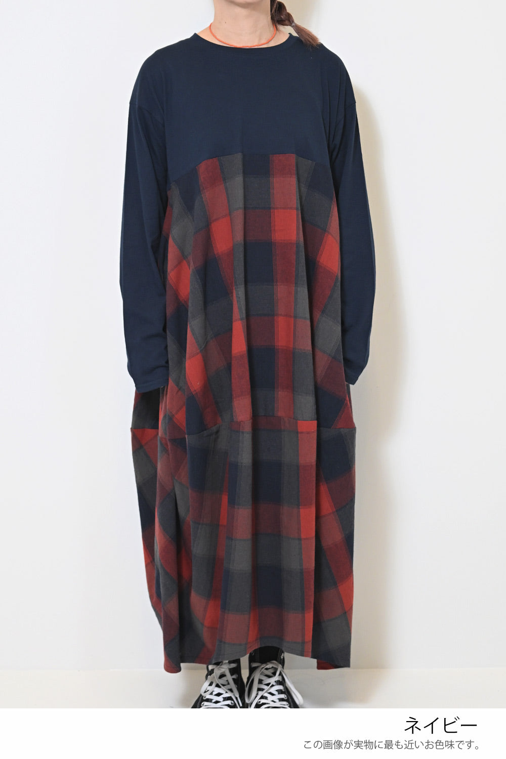 シンプルな無地カットソーに、胸下からふんわり広がるチェック柄のコクーンスカートをドッキングした、1枚でサマになるワンピース。