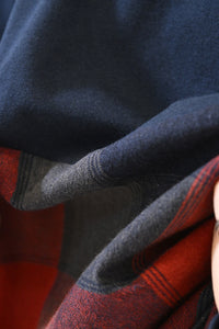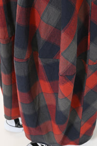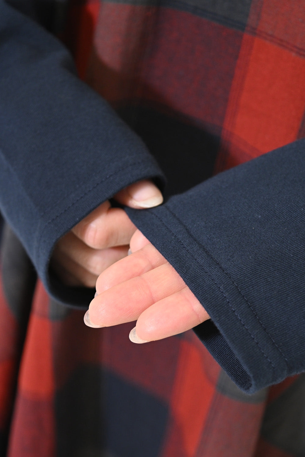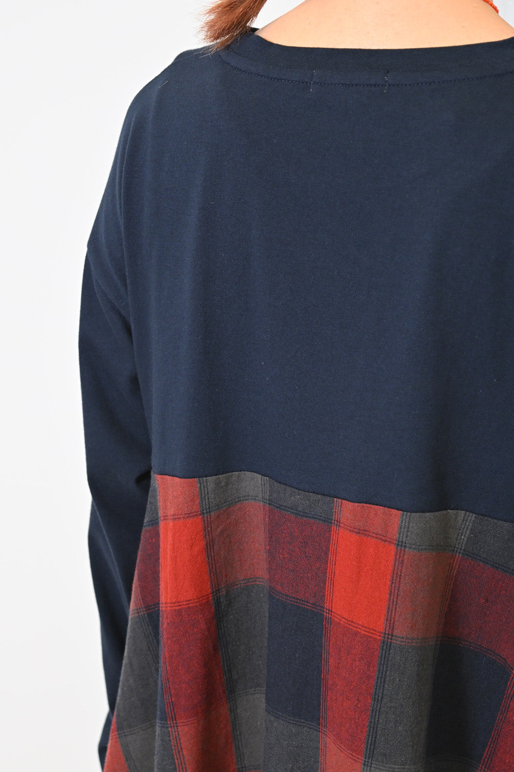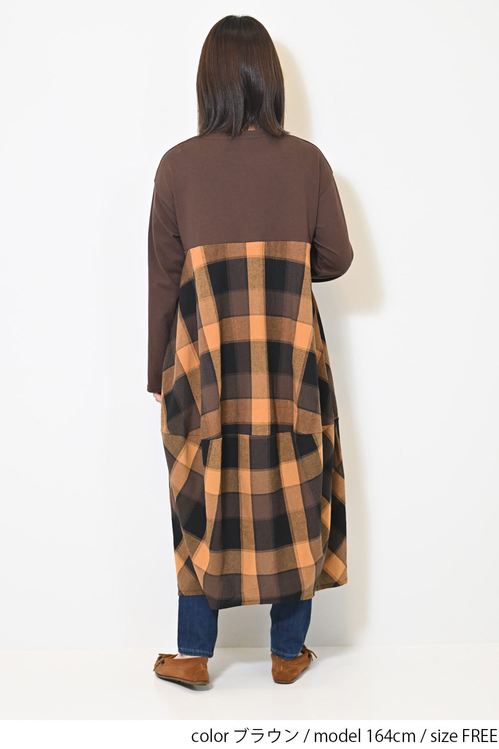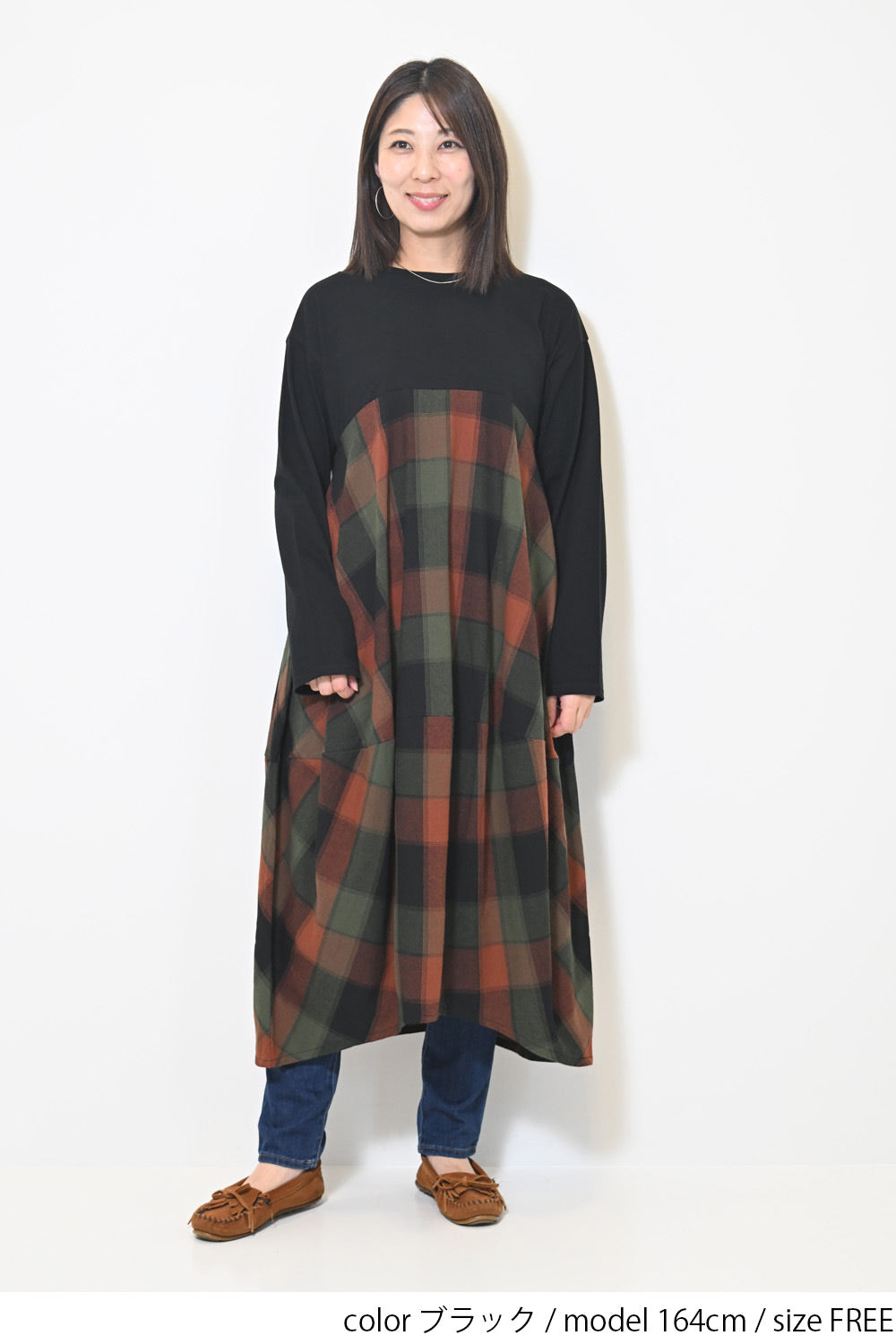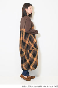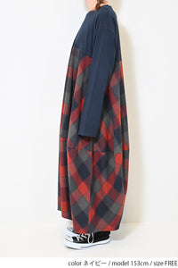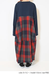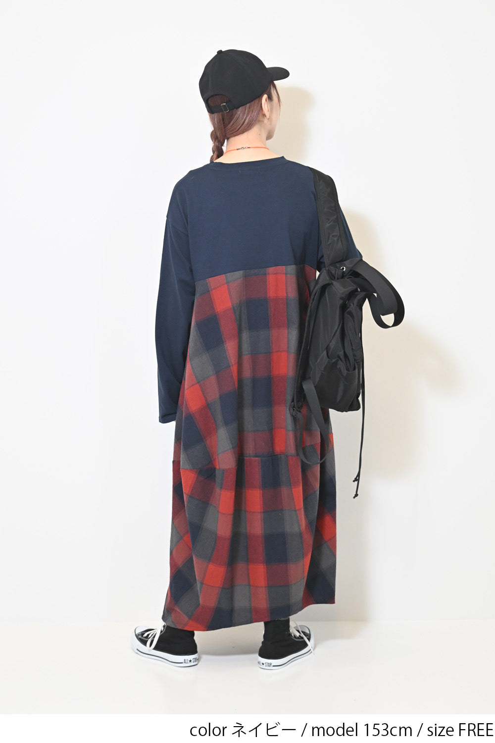シンプルな無地カットソーに、胸下からふんわり広がるチェック柄のコクーンスカートをドッキングした、1枚でサマになるワンピース。