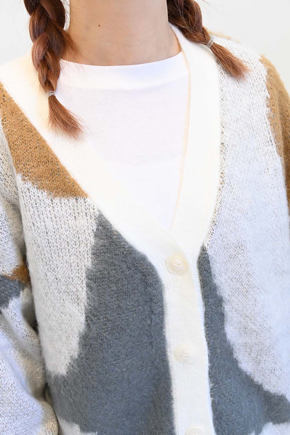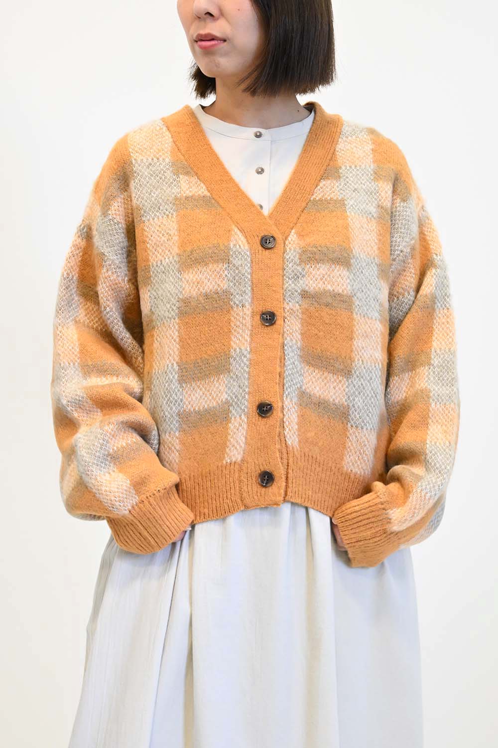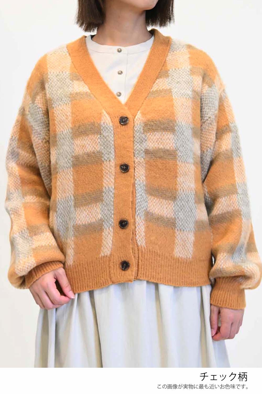 温かみのある色味が秋冬の装いにぴったりな、Vネックのボタンカーディガンです。