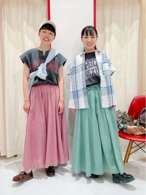 デニムやワイドパンツ、カーゴパンツなどを合わせてカジュアルに、スカートと合わせたレディライクな着こなしも。