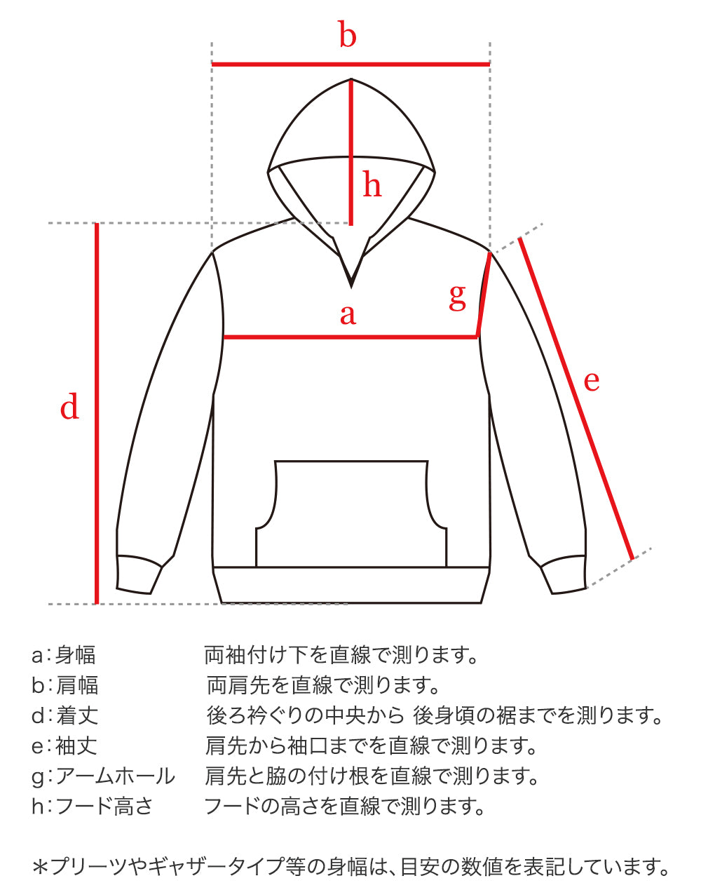 サイズ | 身幅 | 肩幅 | 着丈 | 袖丈 | アームホール | フードの高さ |