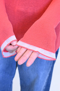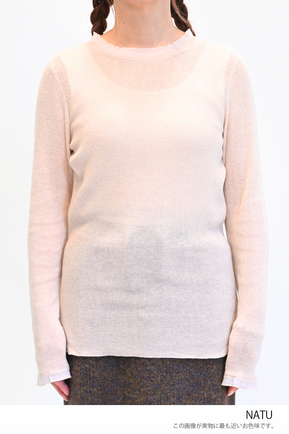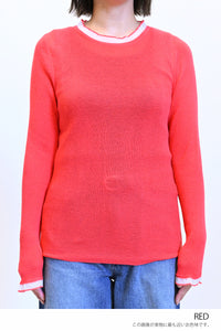 襟元と袖口に透明な糸でさりげなくフリルをあしらったニットプルオーバー。