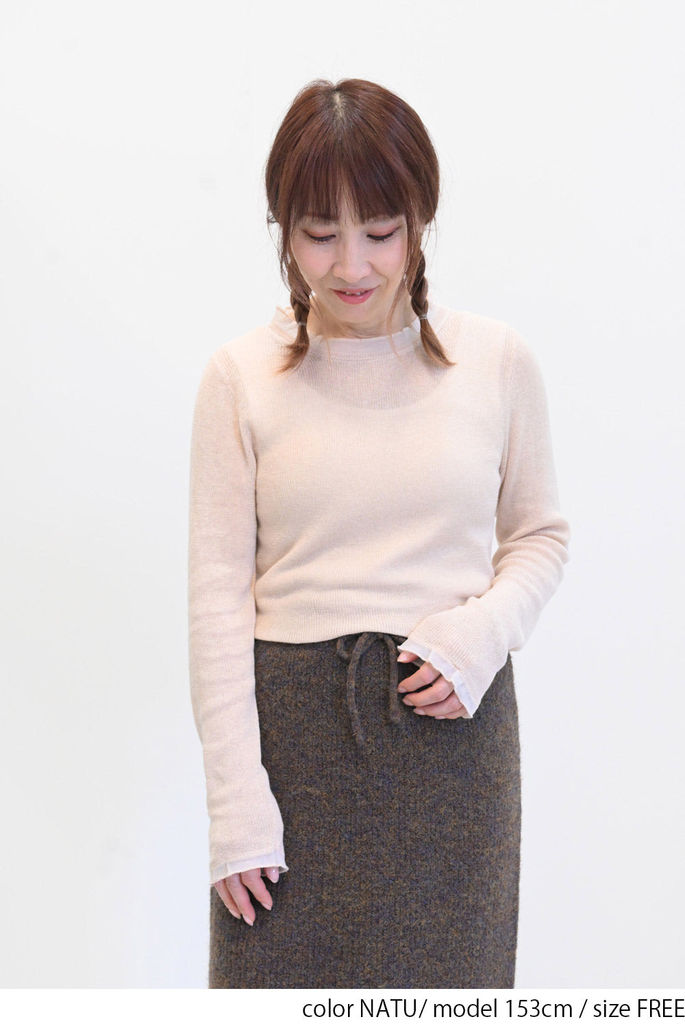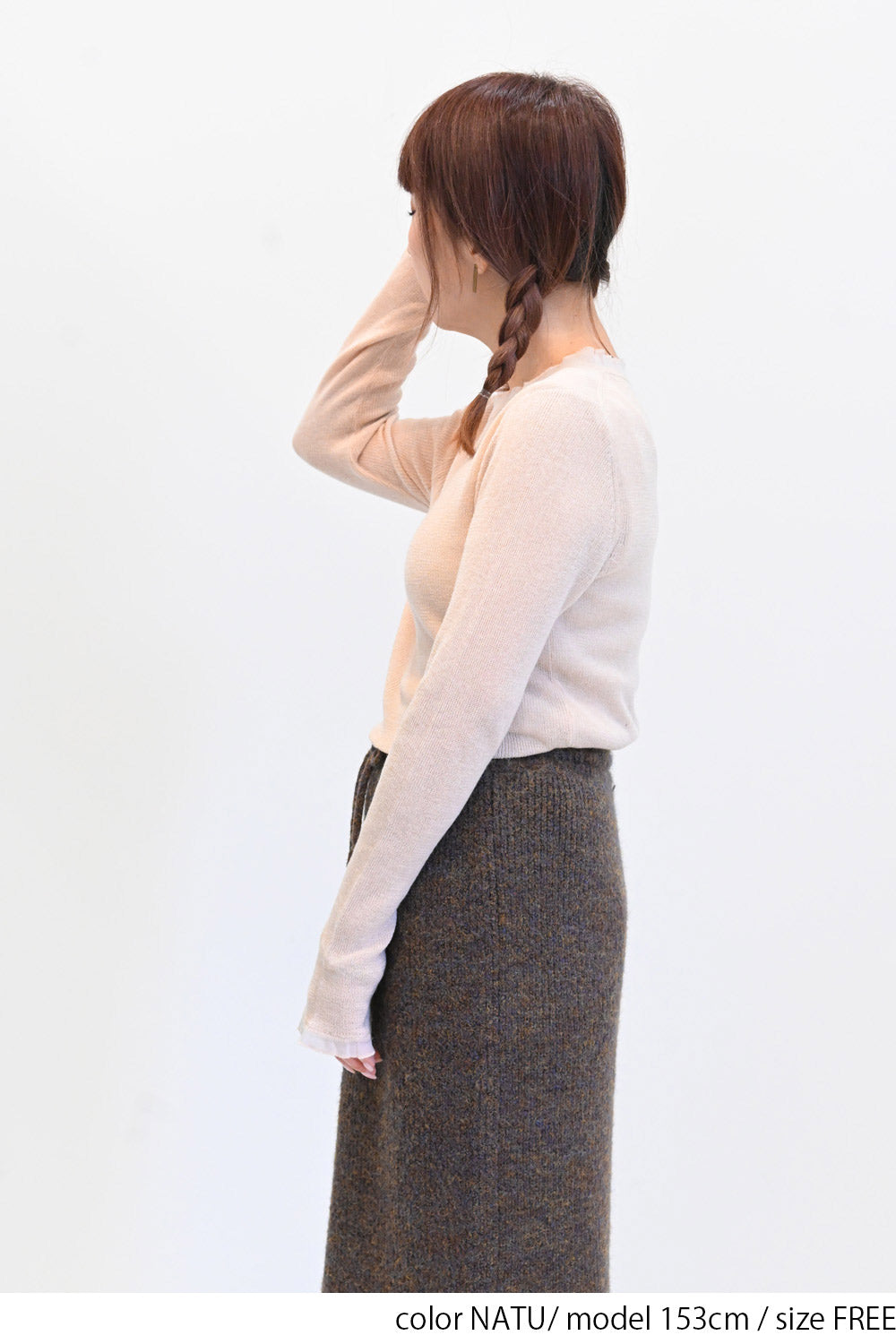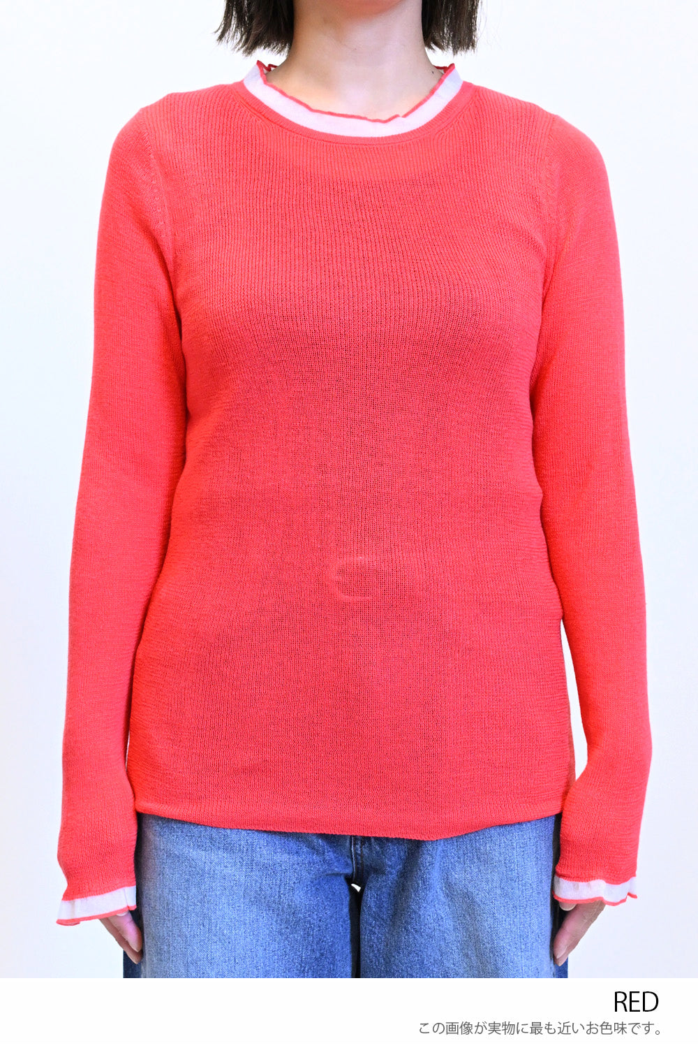 控えめなフリルが首元や手元に上品なニュアンスを添え、シンプルなボトムやデニムとも好相性。