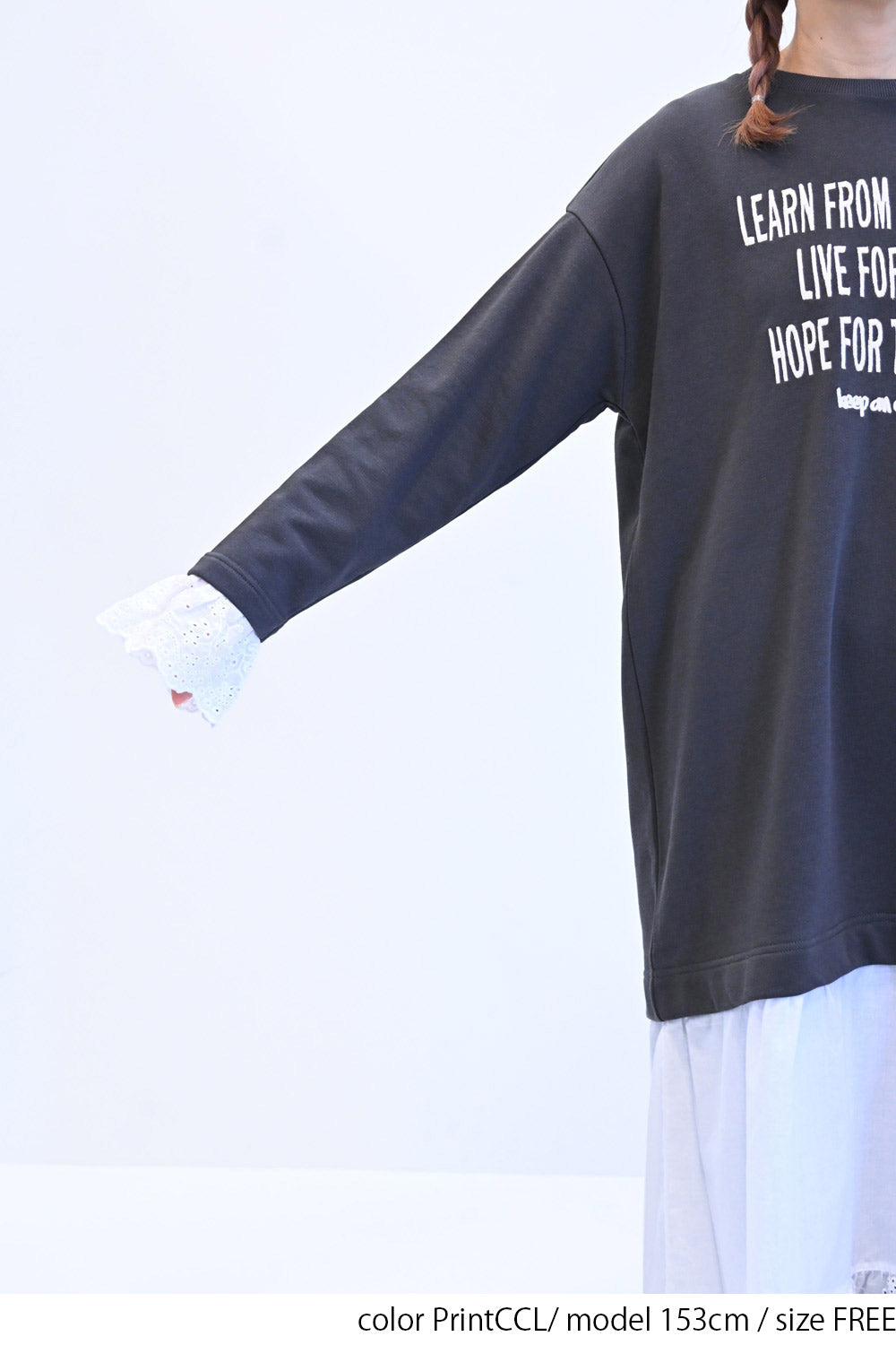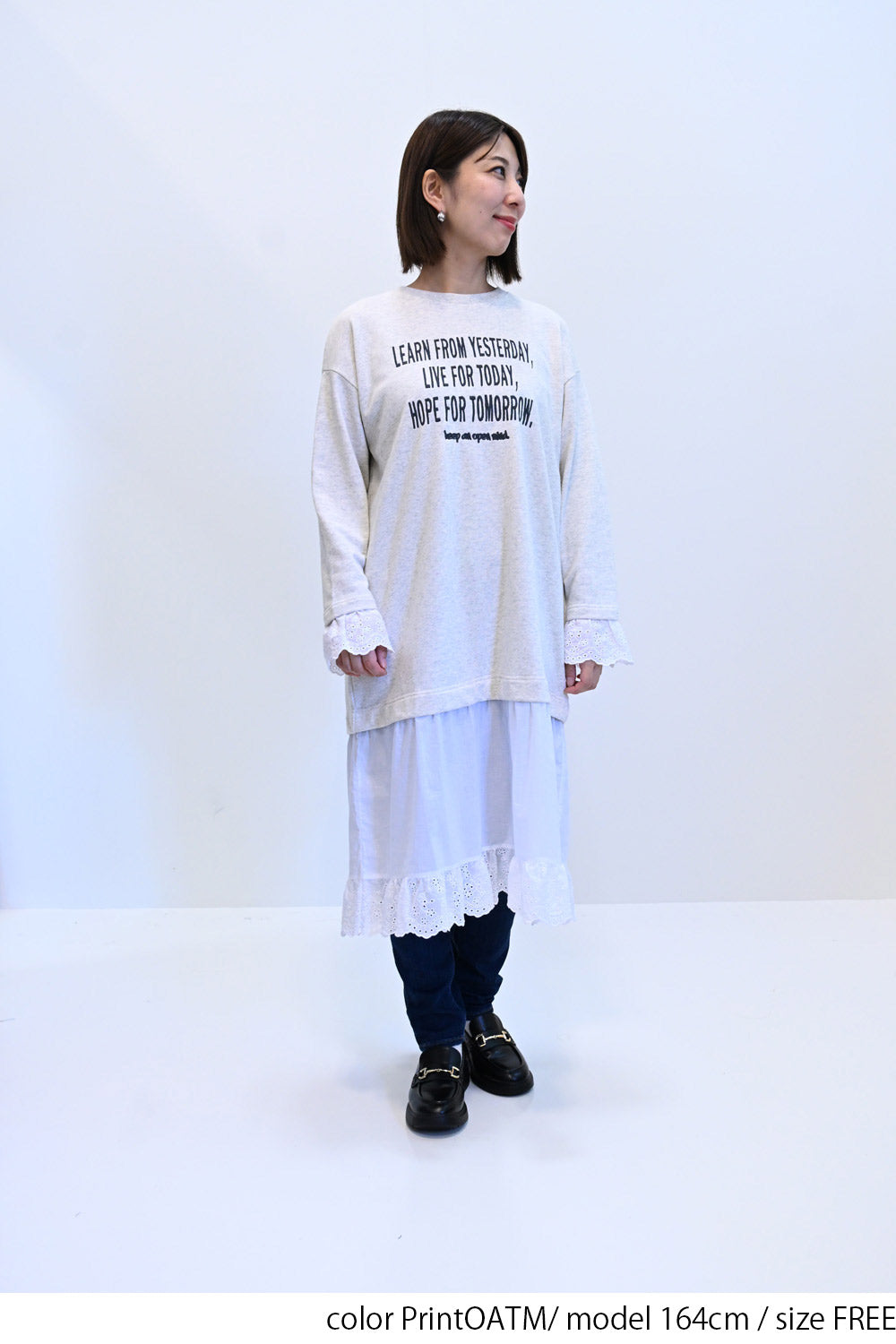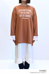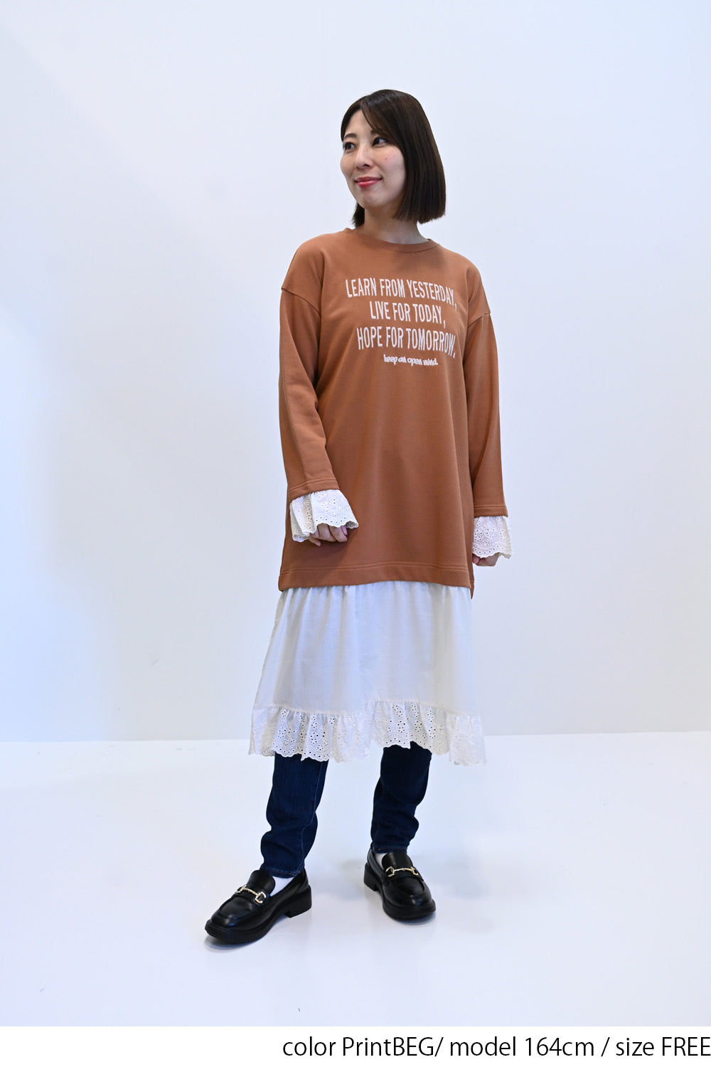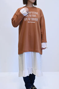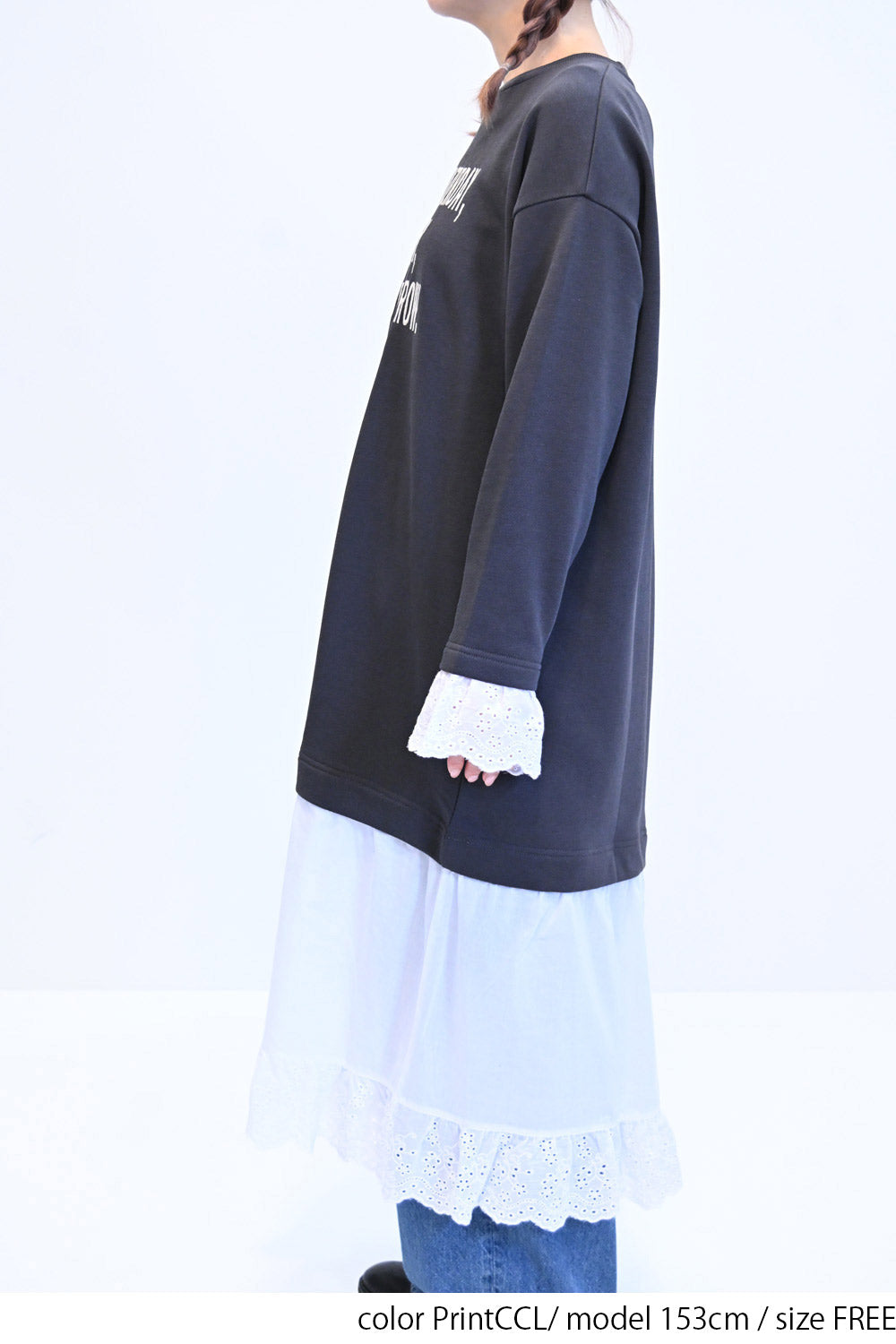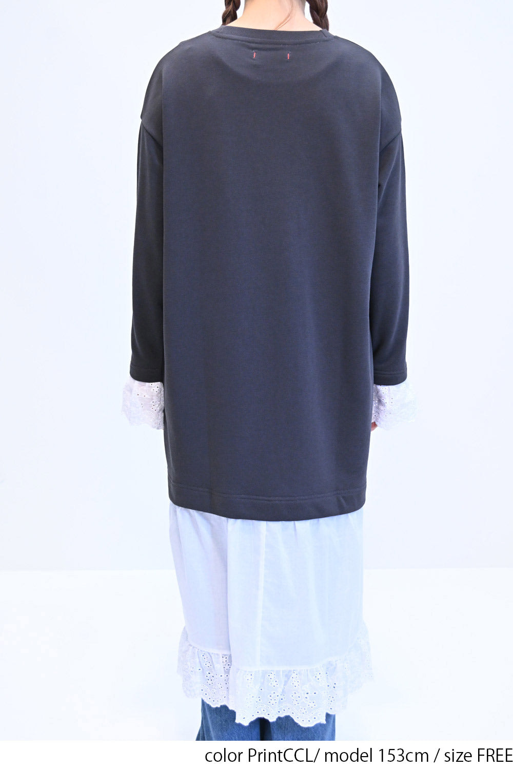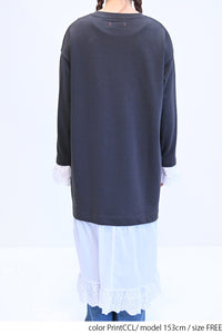 肌ざわりの良い裏毛素材で、リラックス感がありながらも、裾と袖にあしらったレースの切り替えが上品なアクセントに。