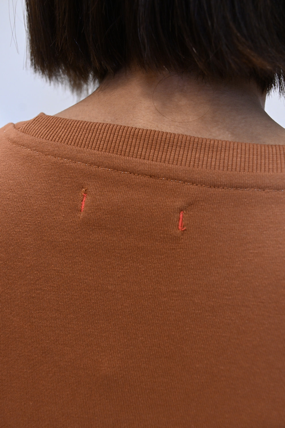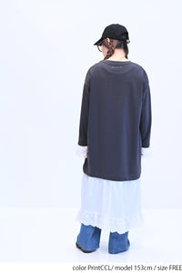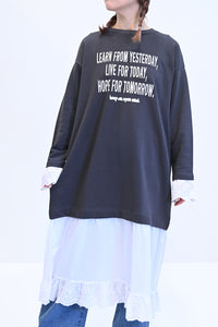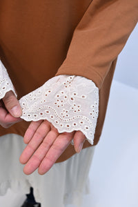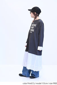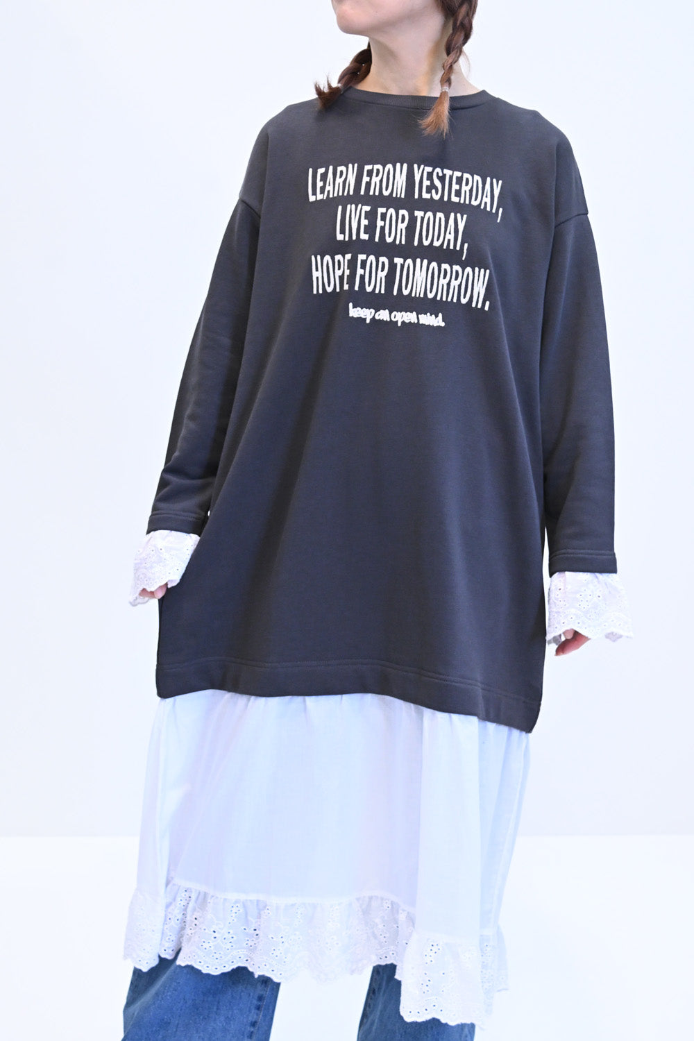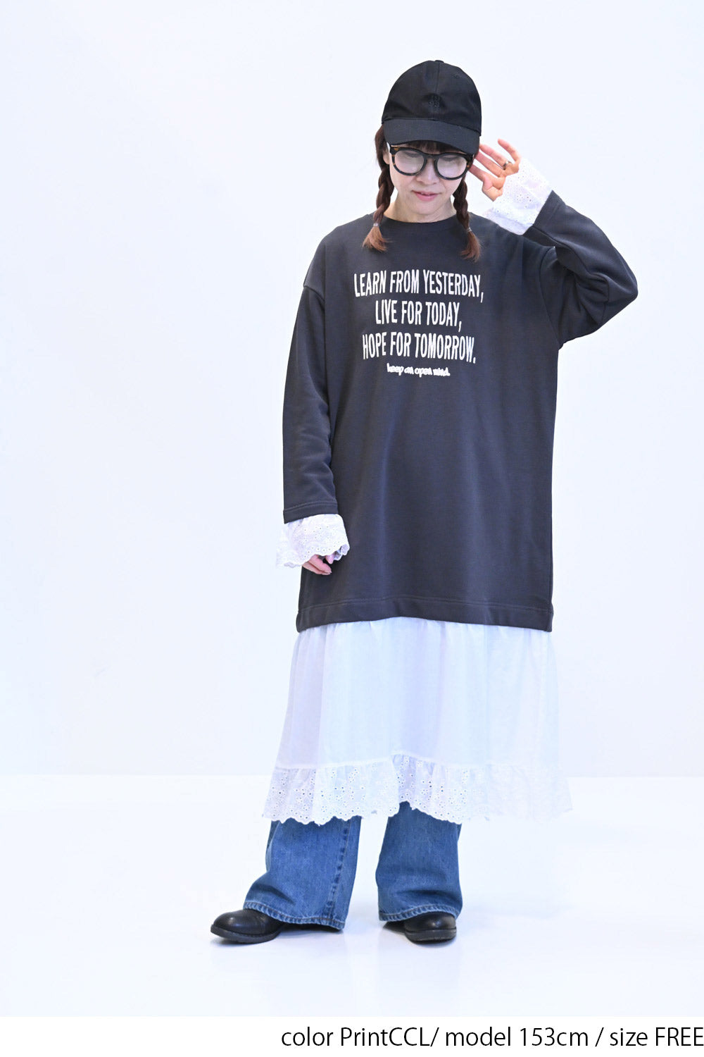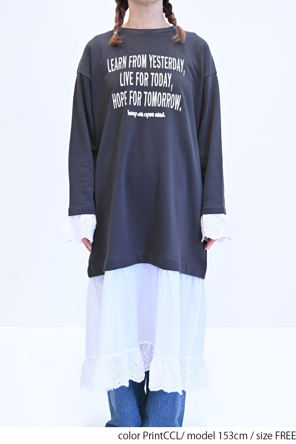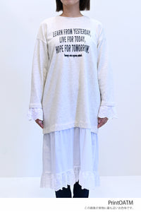 肌ざわりの良い裏毛素材で、リラックス感がありながらも、裾と袖にあしらったレースの切り替えが上品なアクセントに。