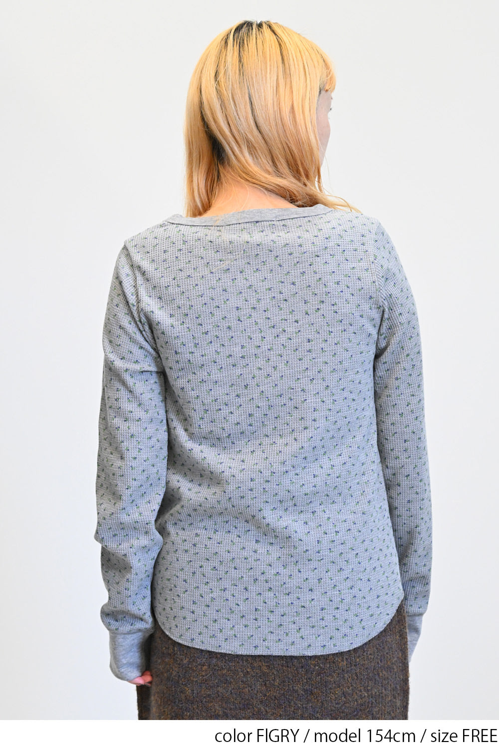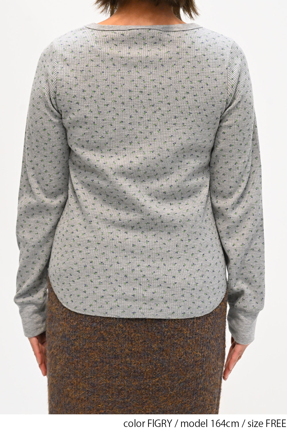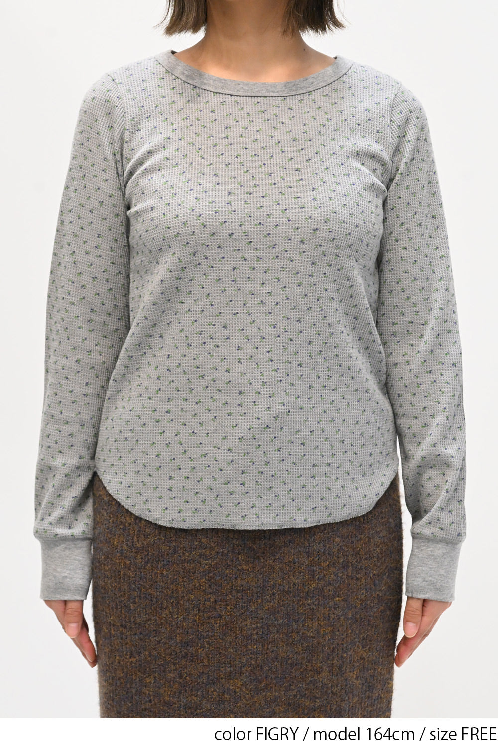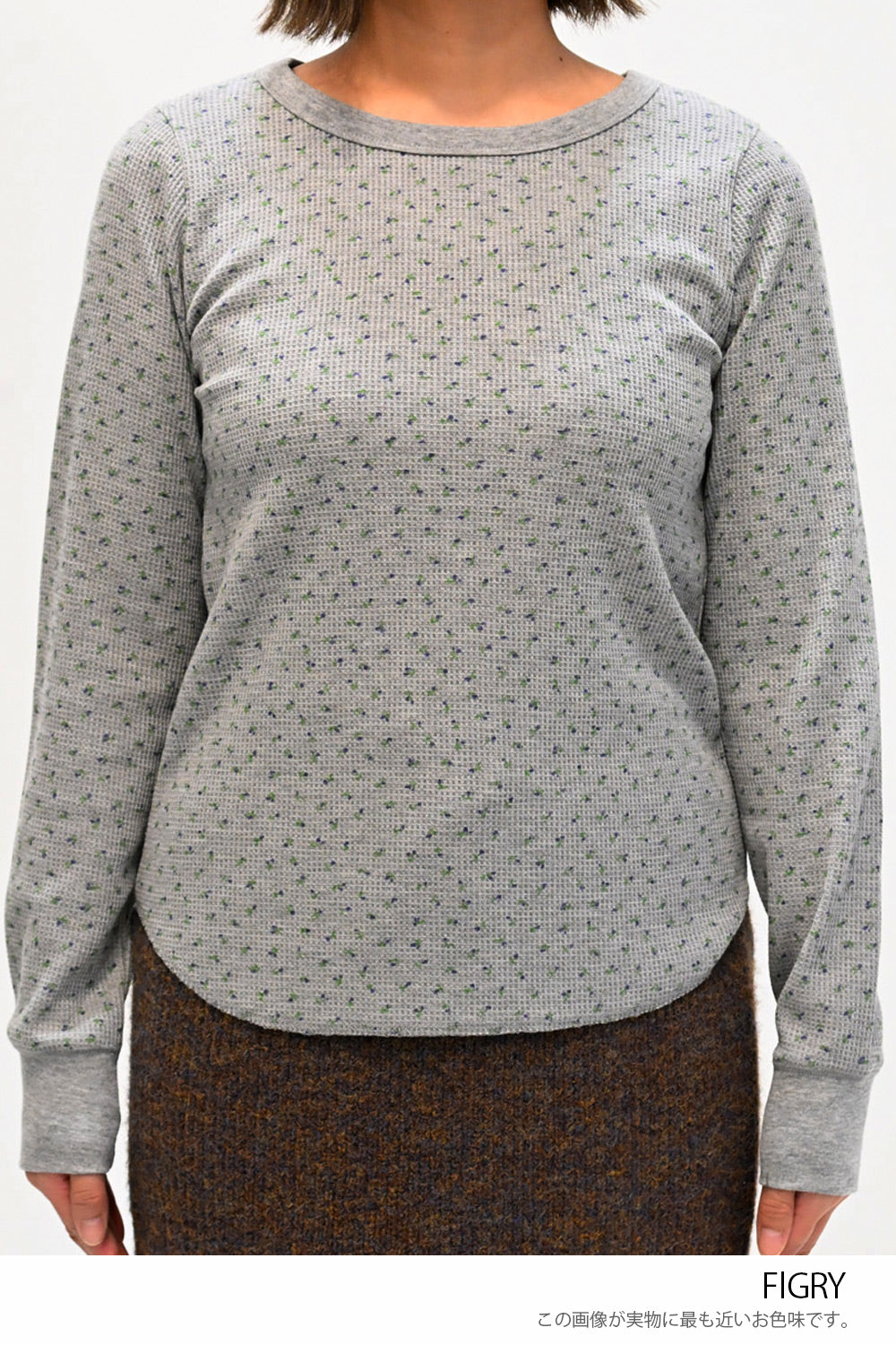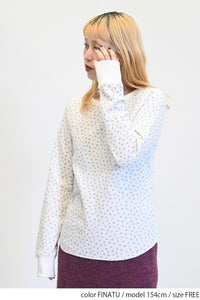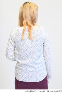 小さな花柄がさりげなく可愛らしさをプラスし、一枚で着てもインナーとして重ねても映えるデザイン。