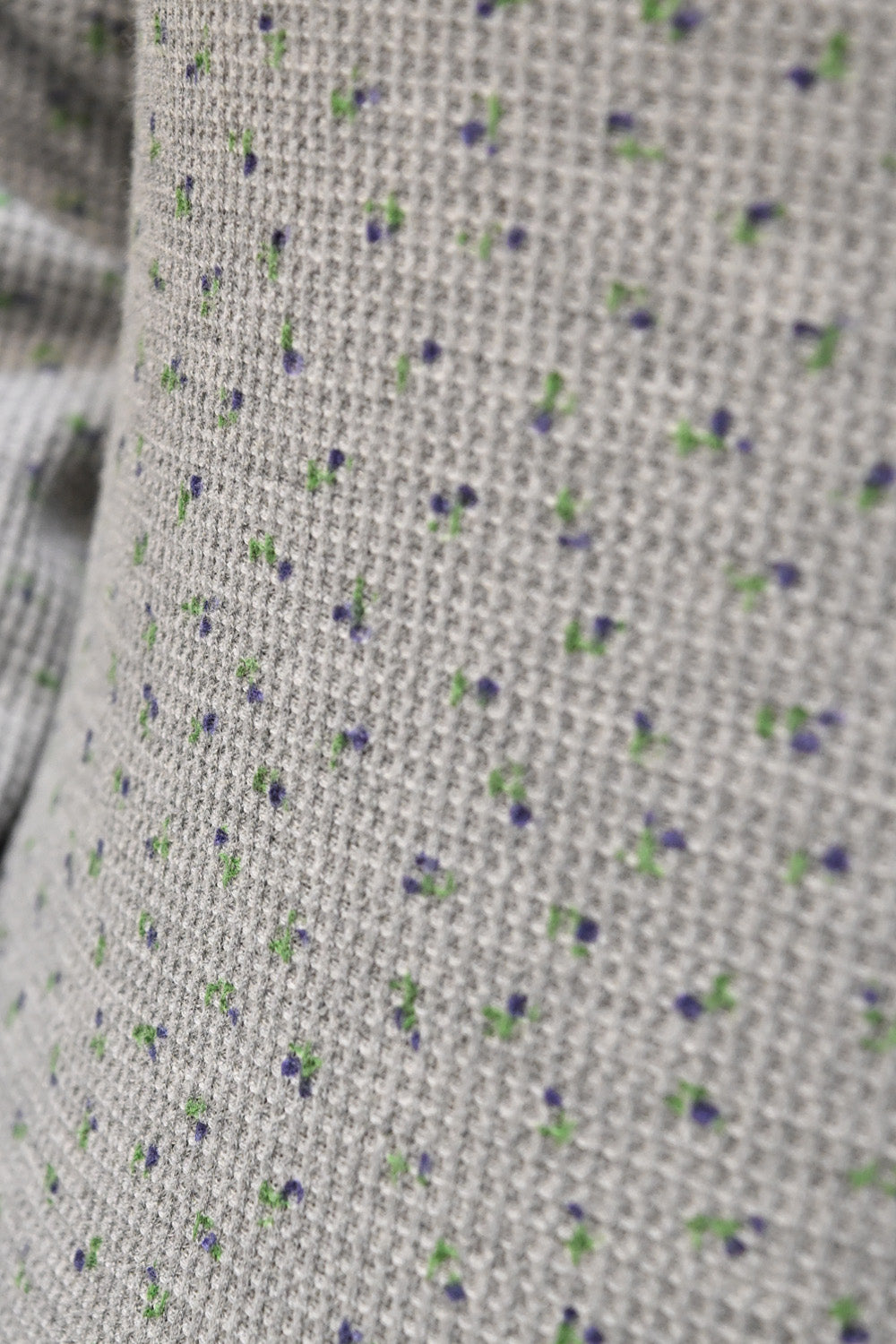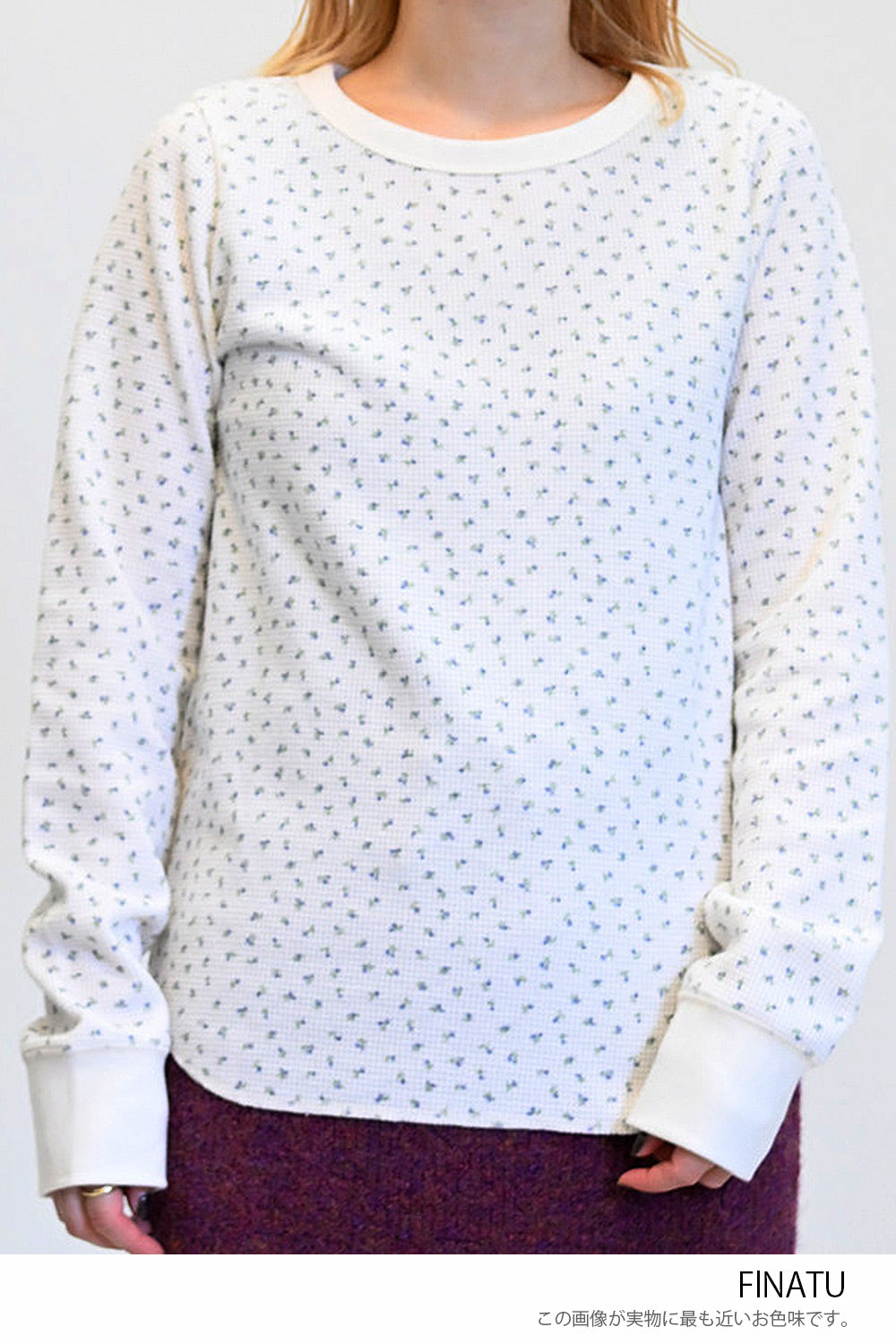 小さな花柄がアクセントになり、カレッジトレーナーやスウェットのインナーとしてチラリと覗かせるだけで、いつものカジュアルコーデに可愛らしさをプラス。