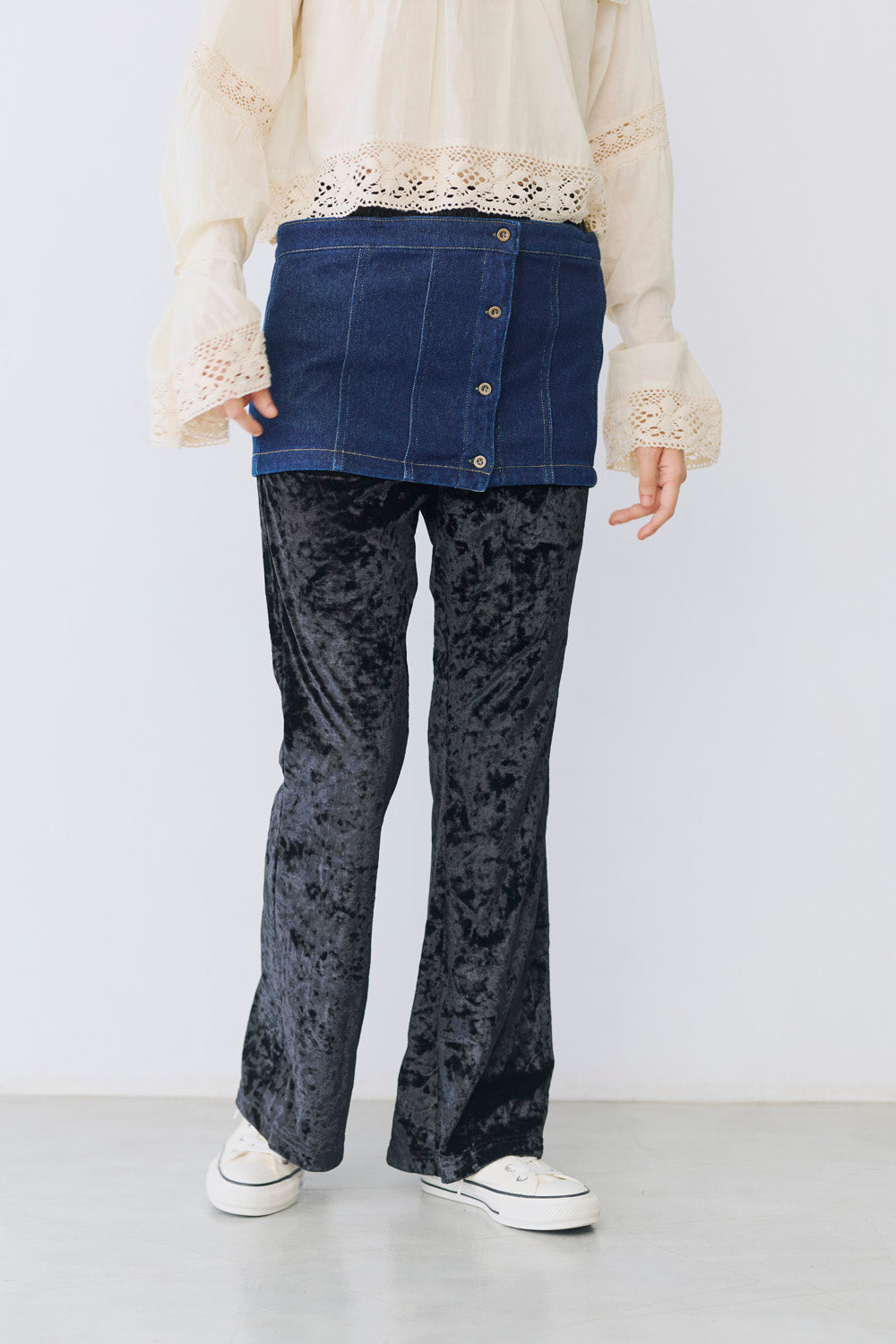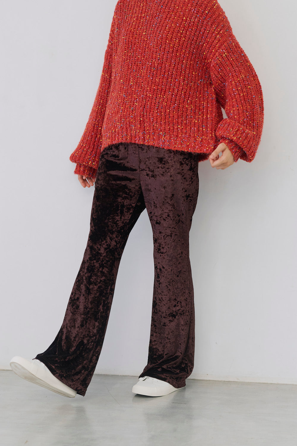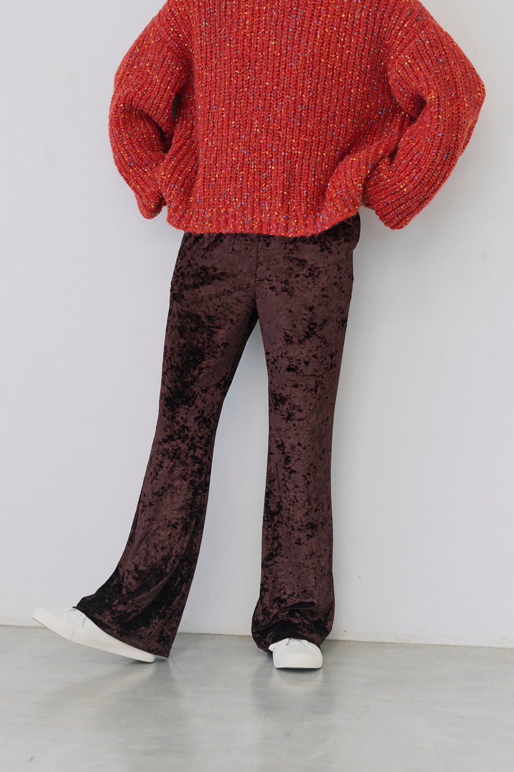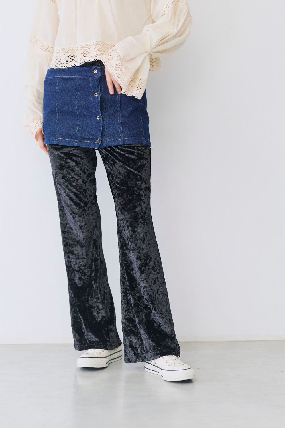 程よいフレア感とベロア素材の上品な光沢が、着こなしに大人の落ち着きをプラスするおすすめアイテムです。