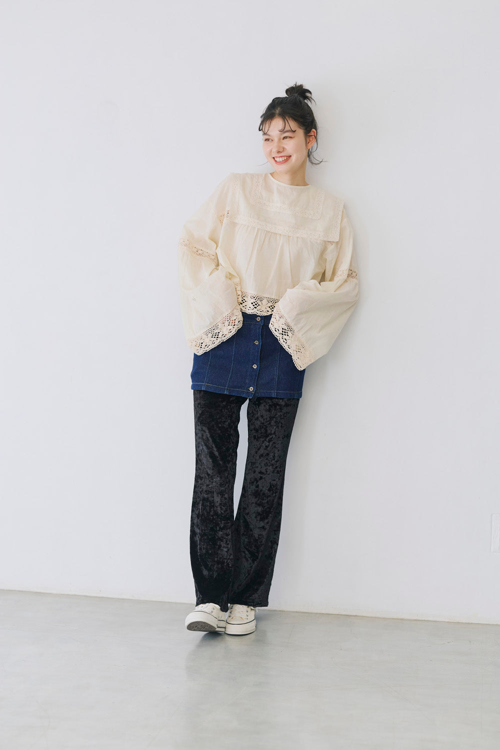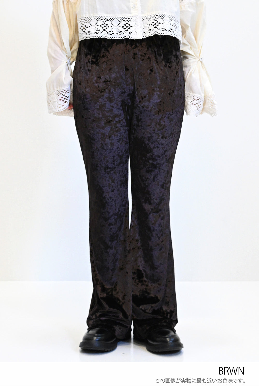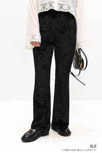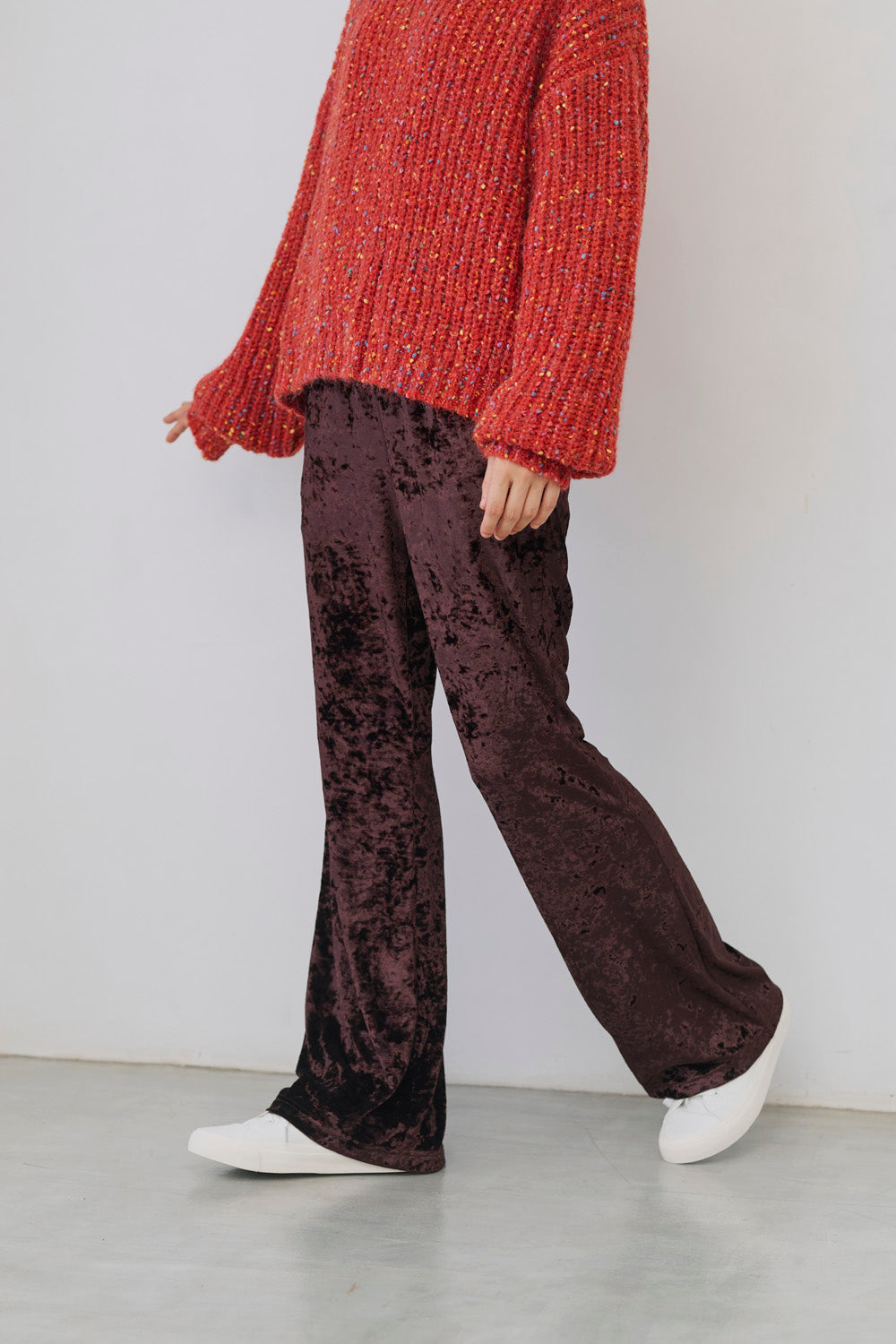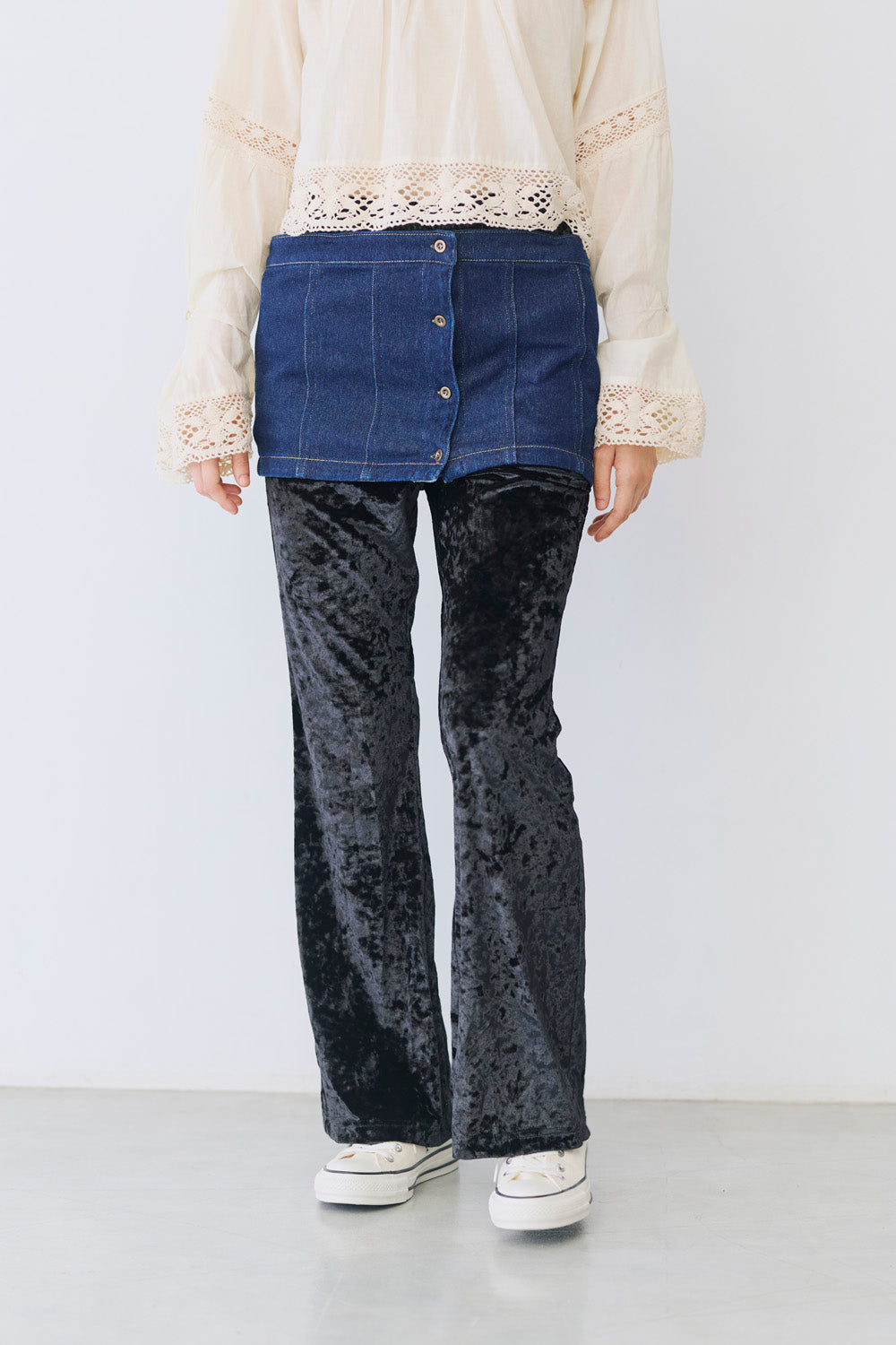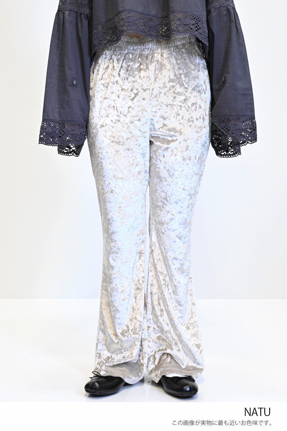 程よいフレア感とベロア素材の上品な光沢が、着こなしに大人の落ち着きをプラスするおすすめアイテムです。