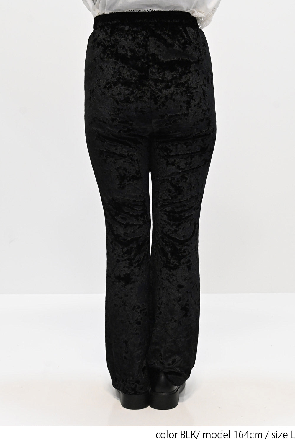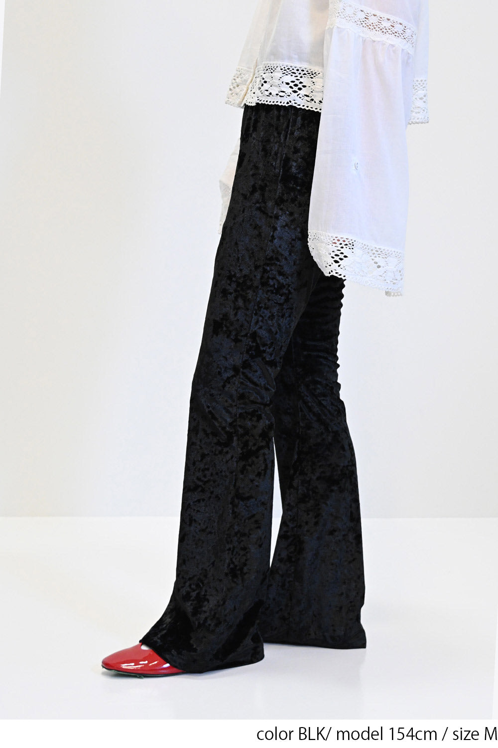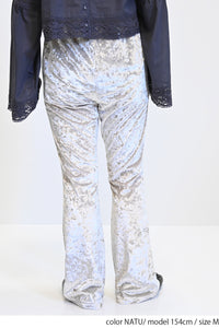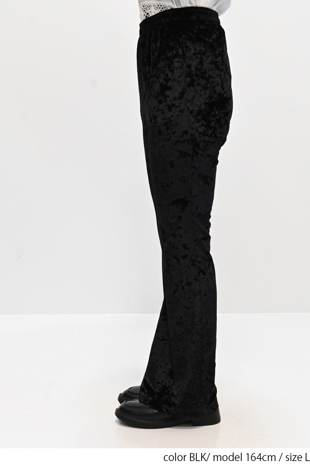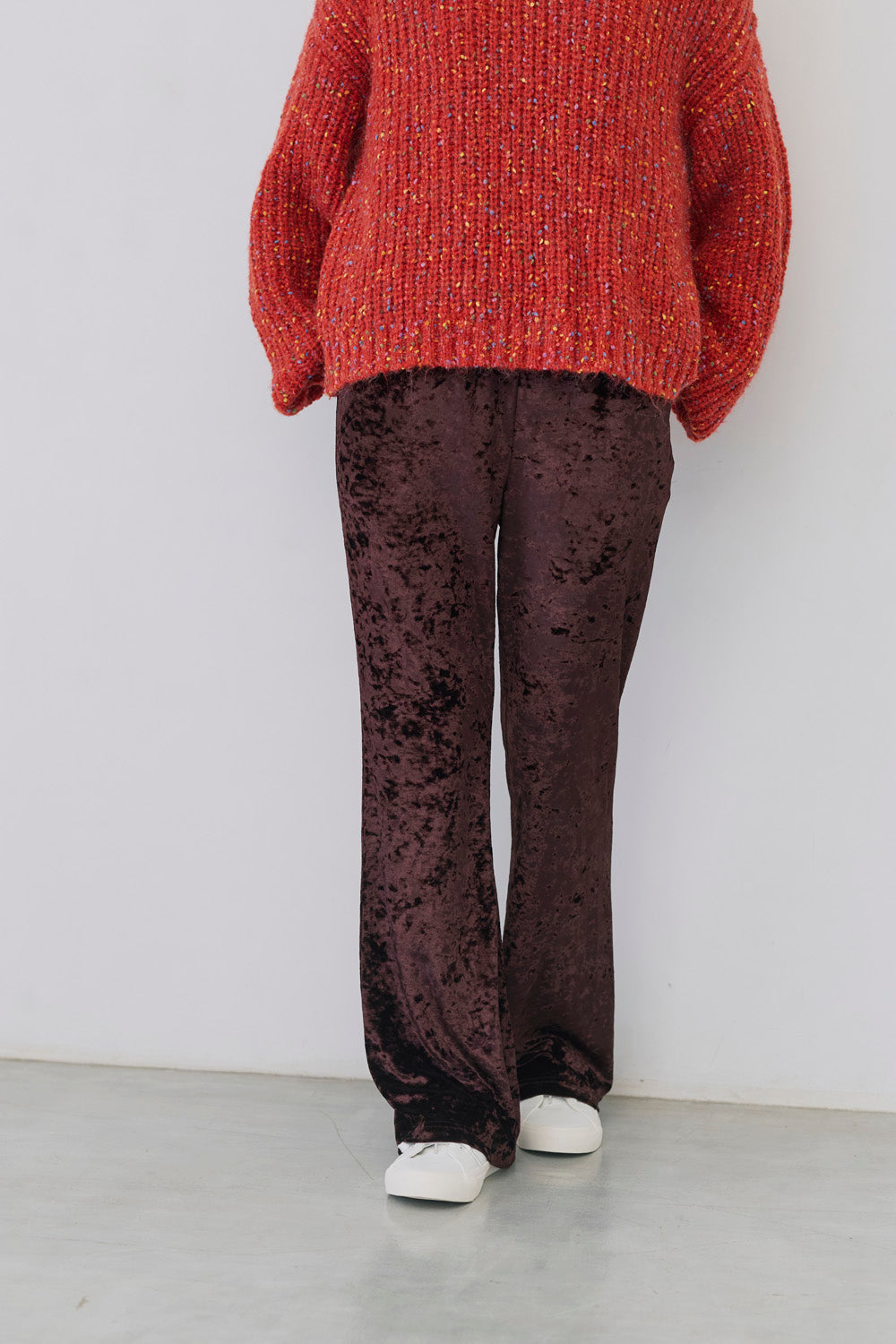 程よいフレア感とベロア素材の上品な光沢が、着こなしに大人の落ち着きをプラスするおすすめアイテムです。