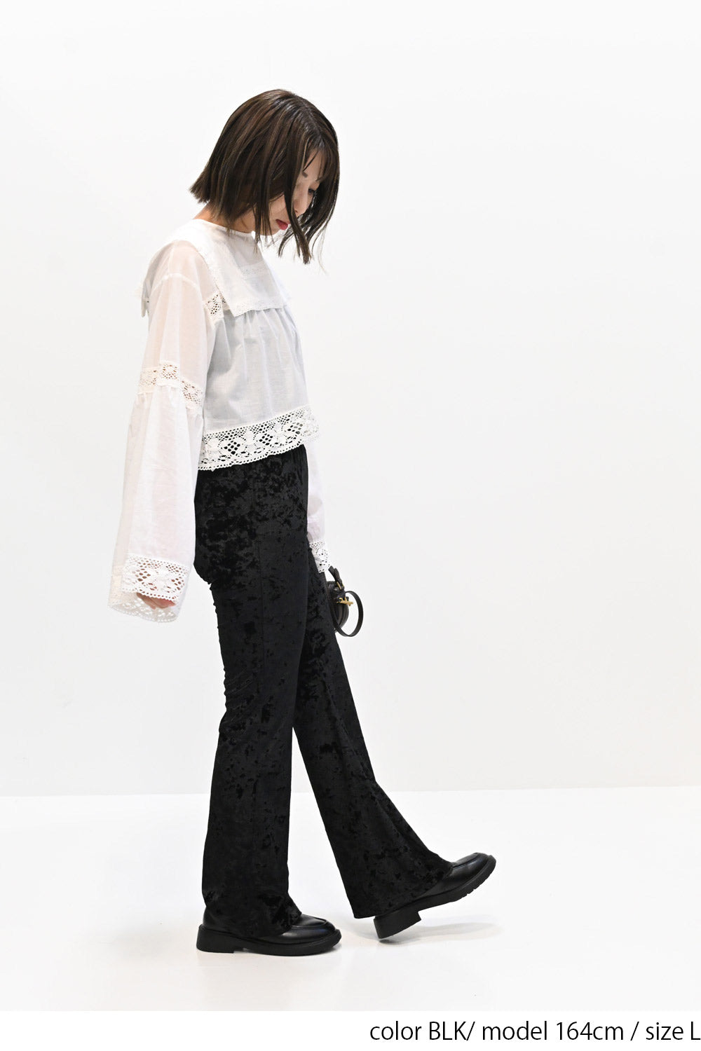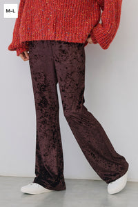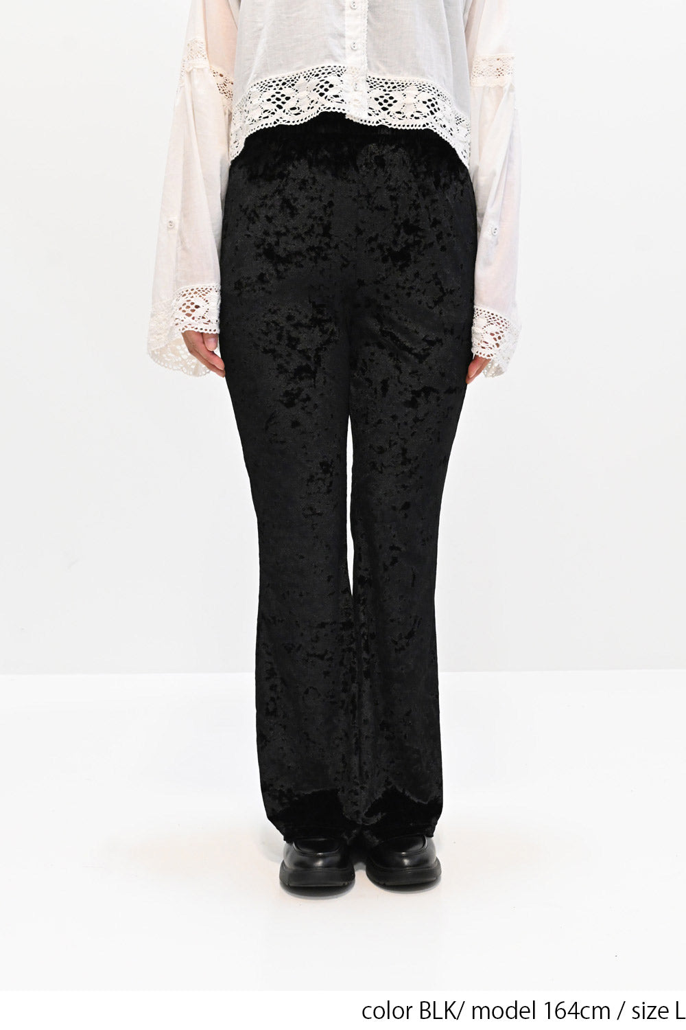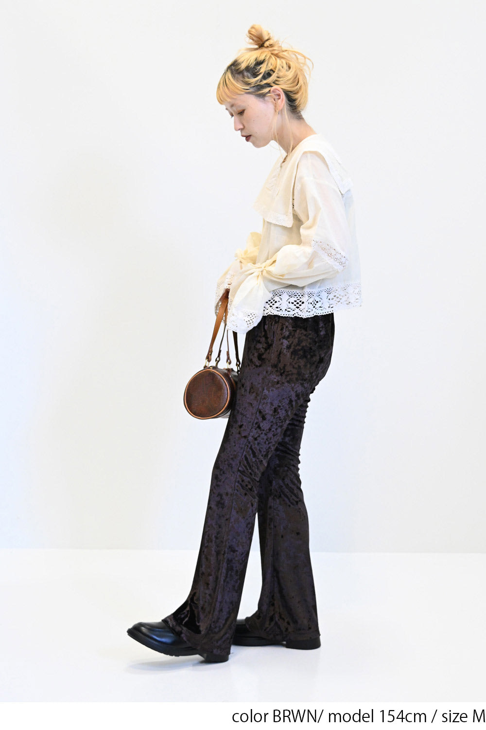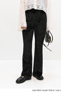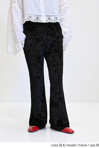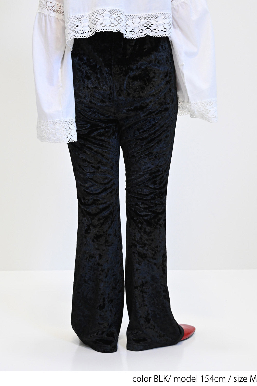 程よいフレア感とベロア素材の上品な光沢が、着こなしに大人の落ち着きをプラスするおすすめアイテムです。