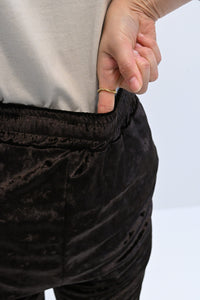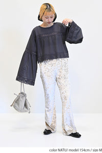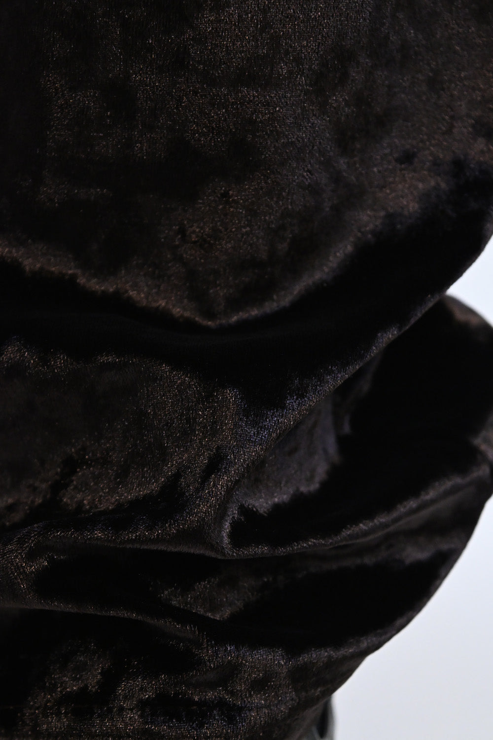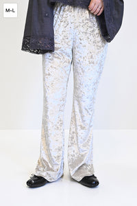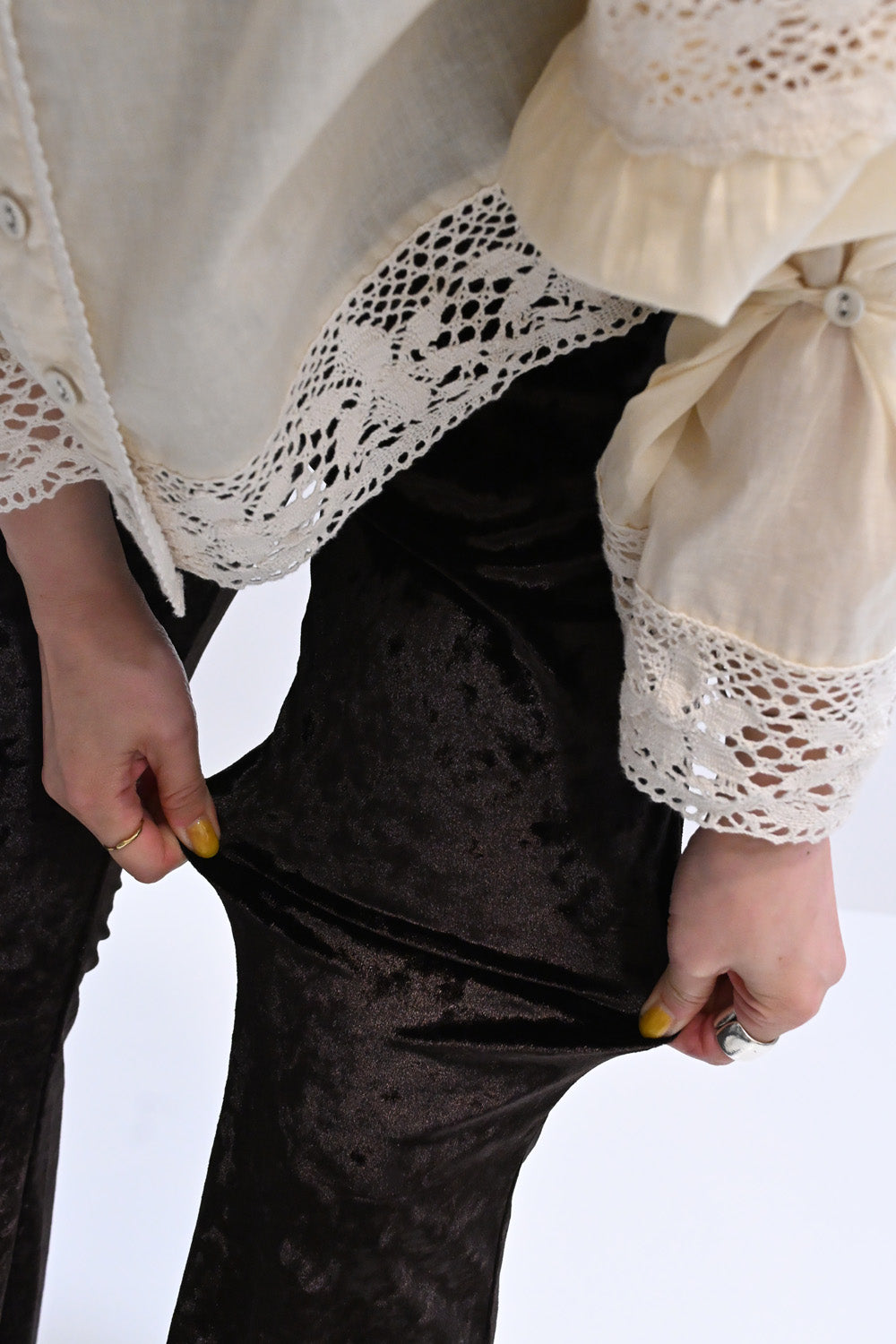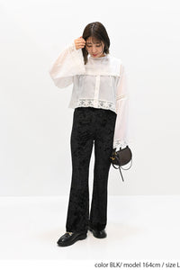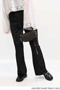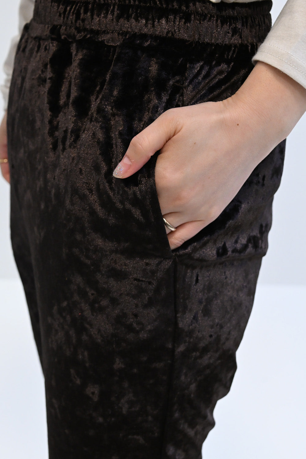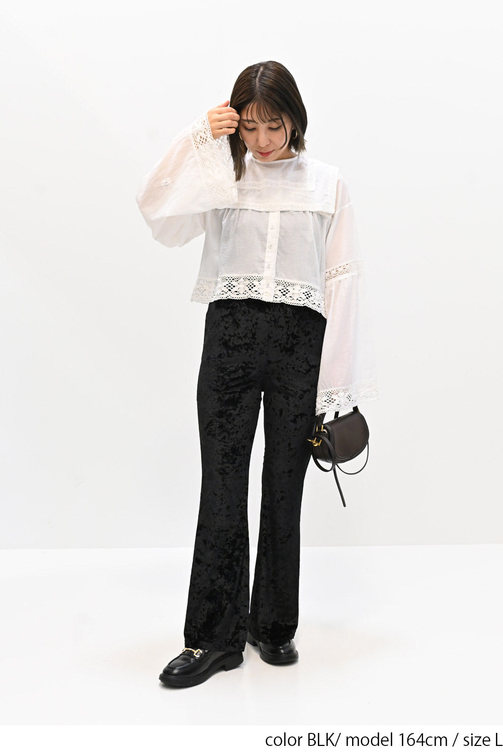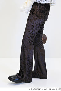 程よいフレア感とベロア素材の上品な光沢が、着こなしに大人の落ち着きをプラスするおすすめアイテムです。
