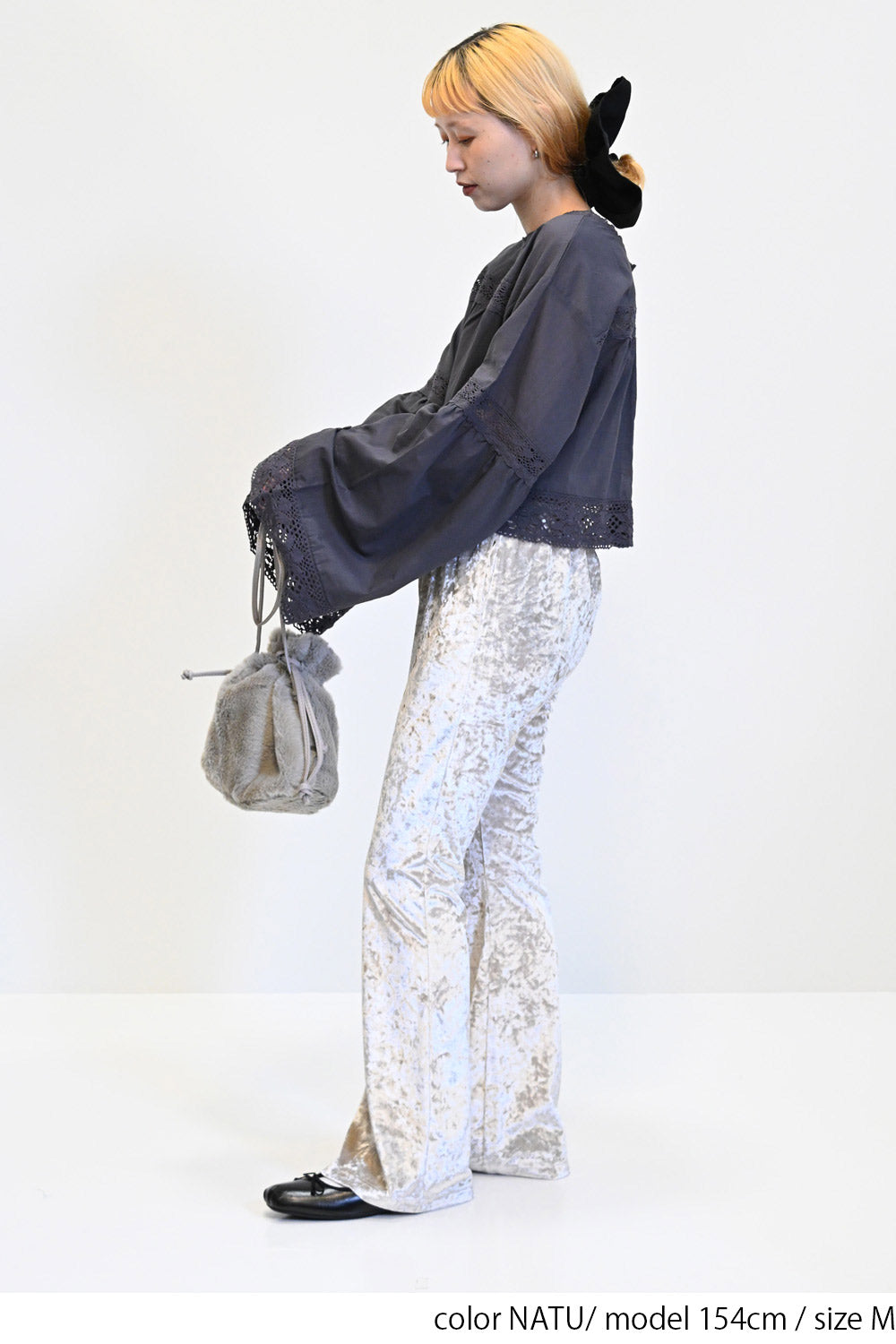 表面感のあるベロア生地を使用しており、カジュアルコーデにはもちろん、きれいめなスタイリングにもニュアンスを添えてくれます。