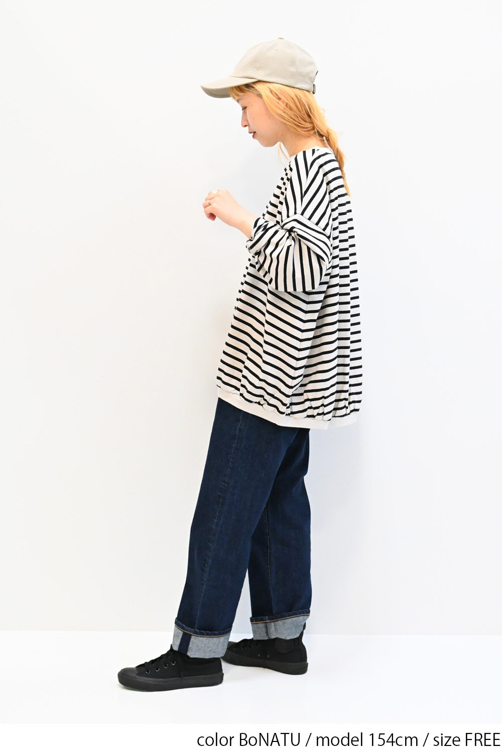 デニムパンツやワイドパンツと合わせると、シンプルでリラックス感のあるカジュアルなコーディネートに。