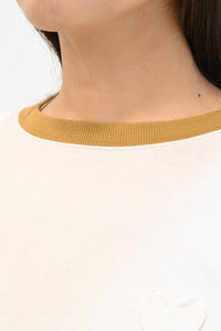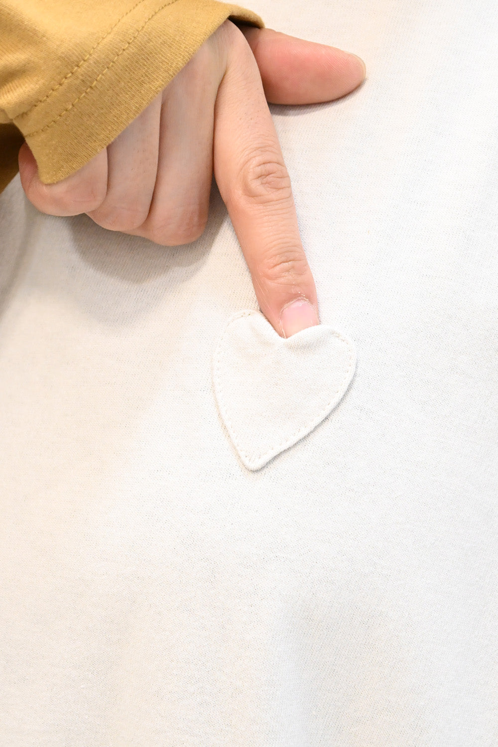 胸元に施された小さなハートポケットで、シンプルな中にもさりげないアクセントを加えました。