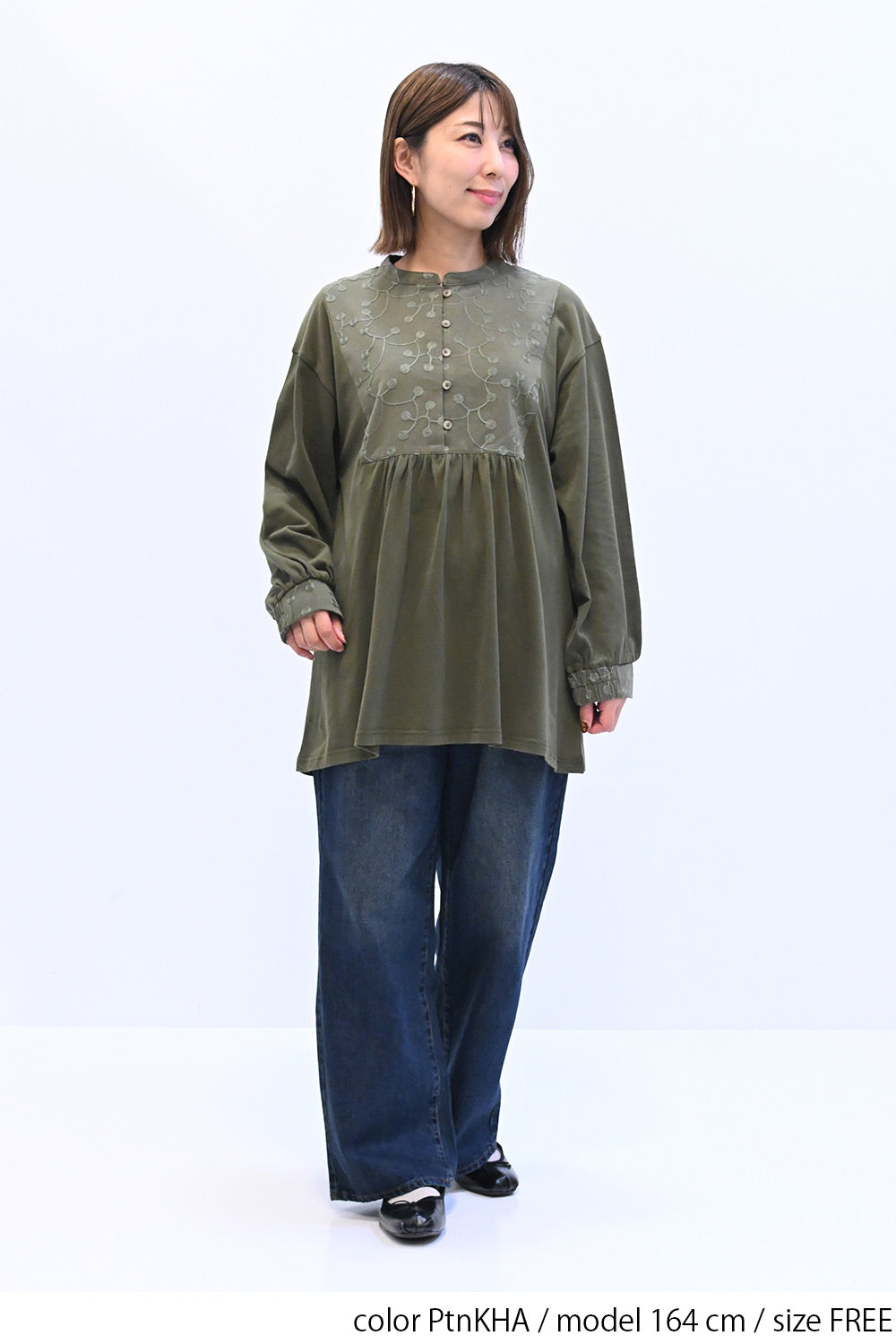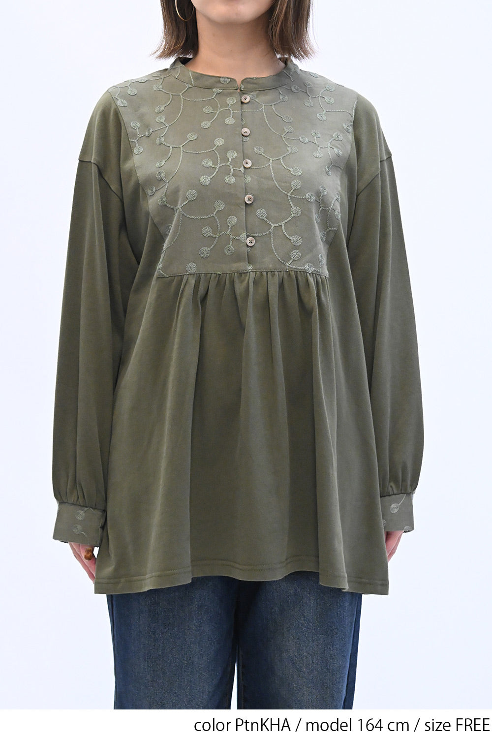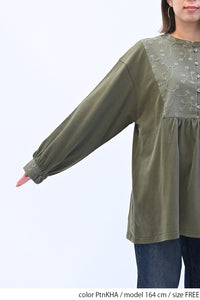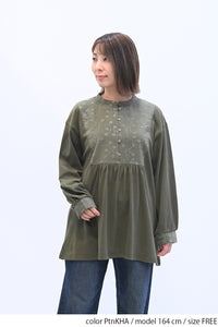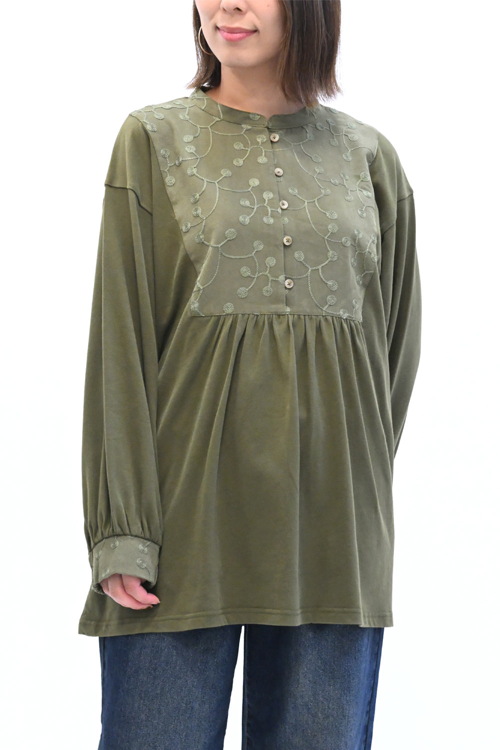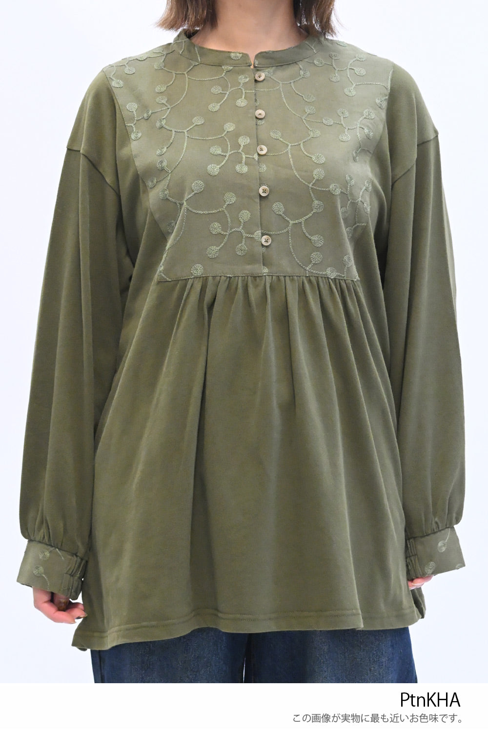 胸元の刺繍切替が上品なアクセントになり、ナチュラルな中にも女性らしさを感じるデザインです。