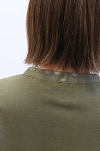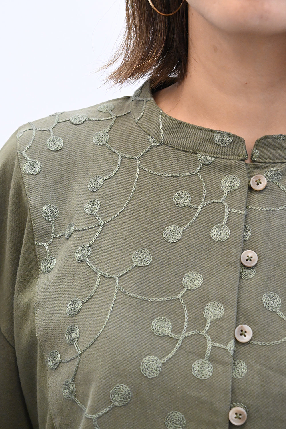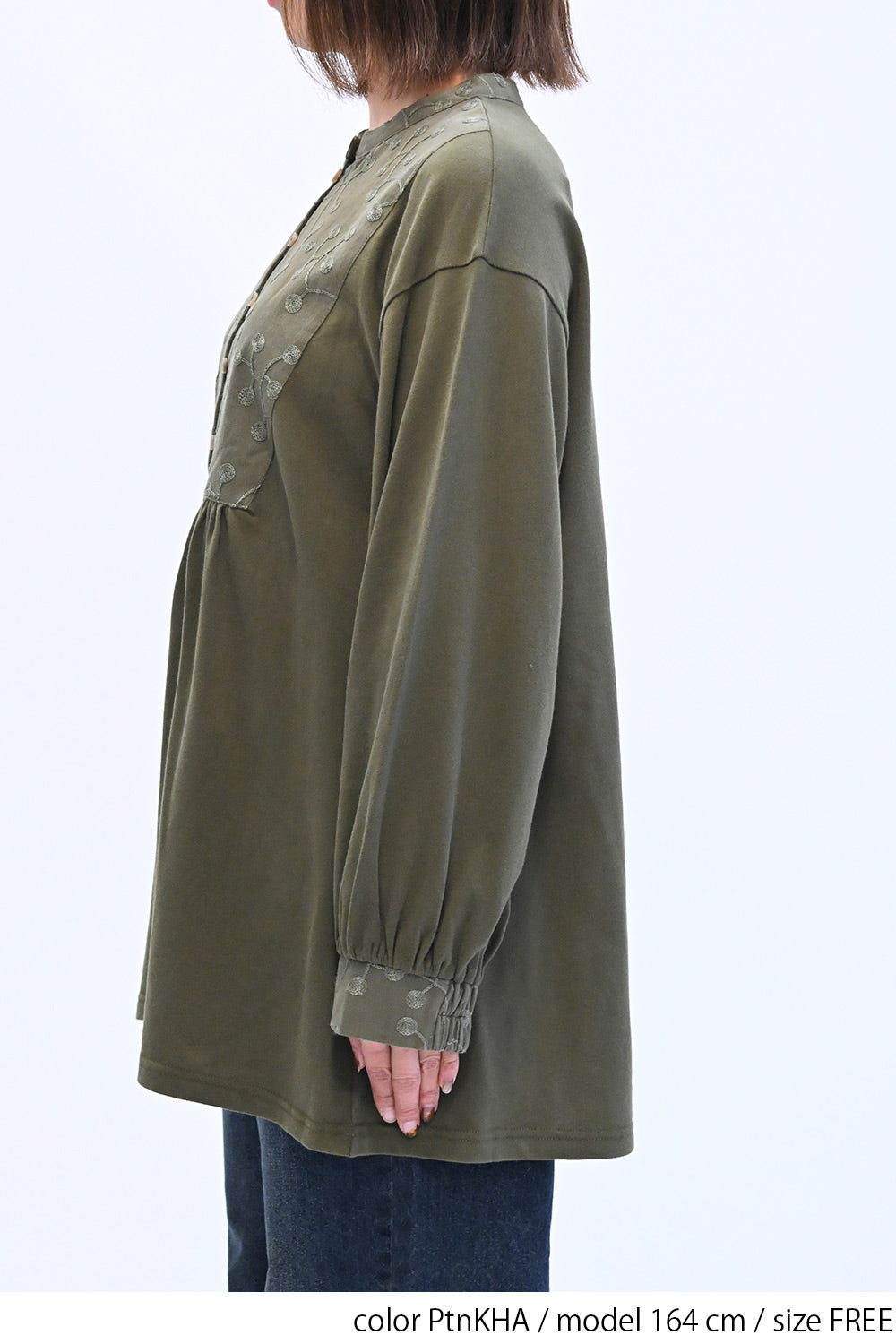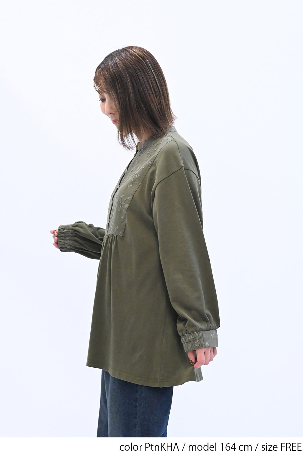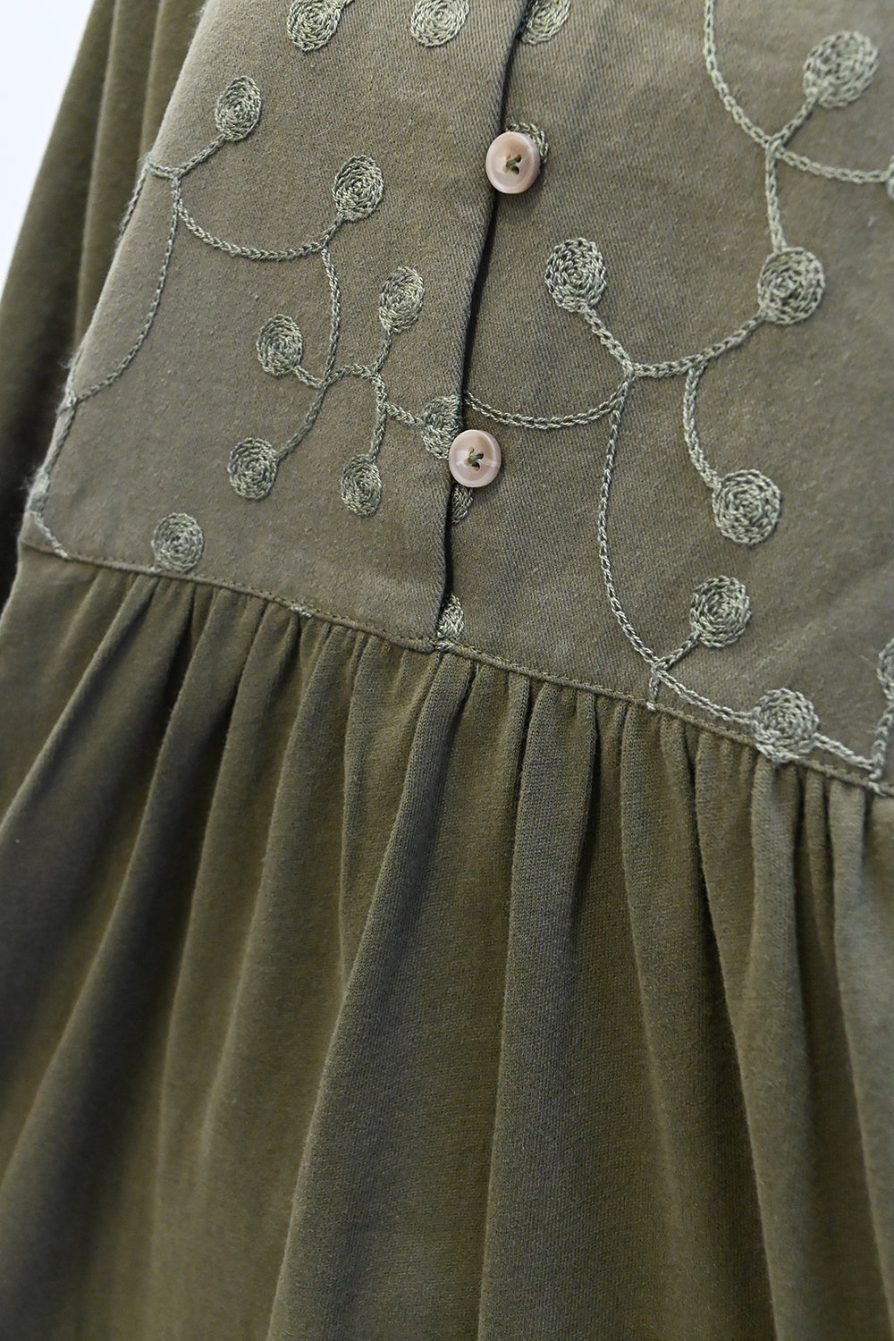胸元の刺繍切替が上品なアクセントになり、ナチュラルな中にも女性らしさを感じるデザインです。