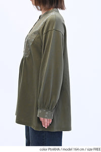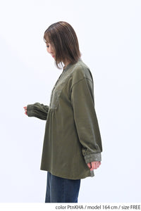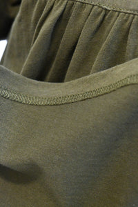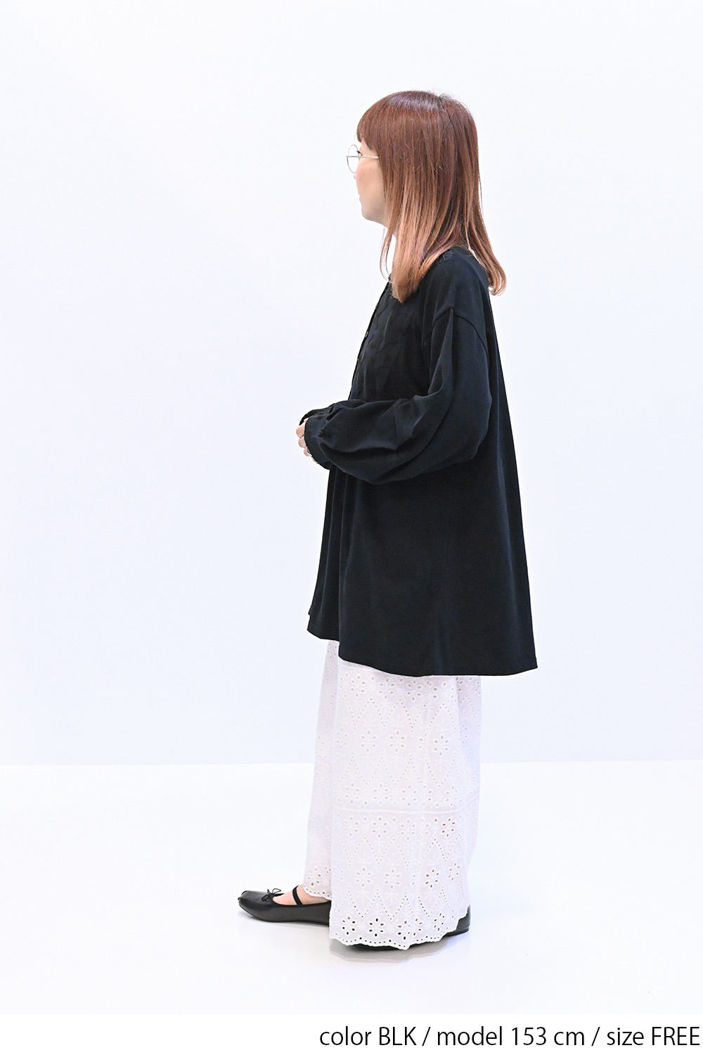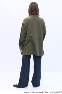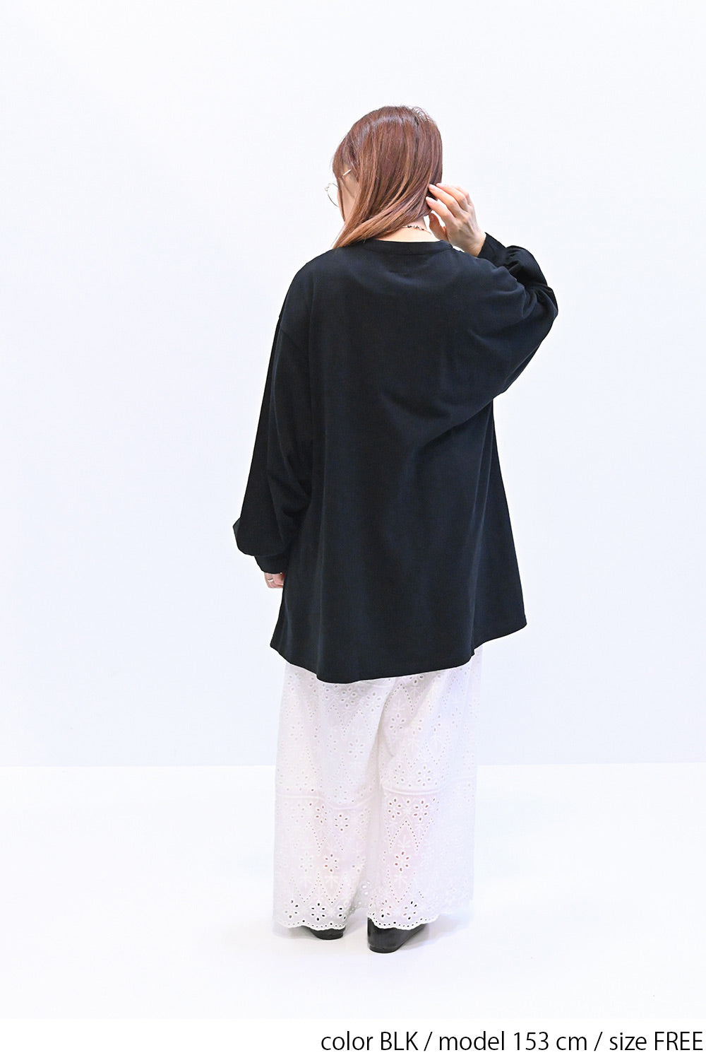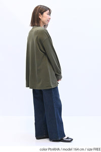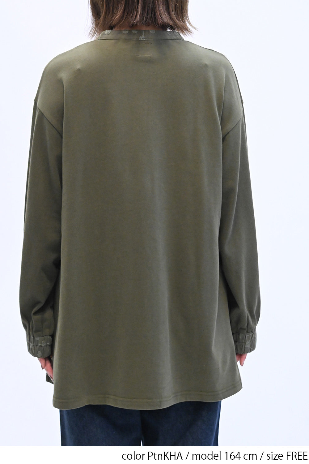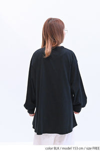 ゆったりとしたシルエットで体のラインを拾わず、リラックスした着心地です。