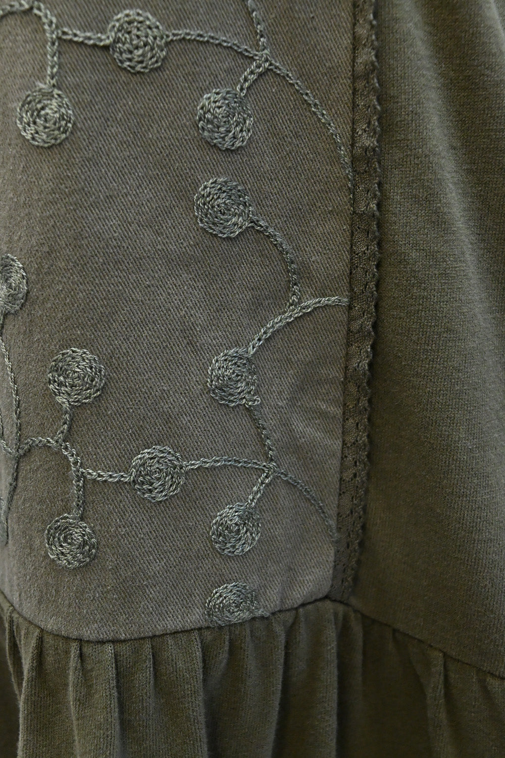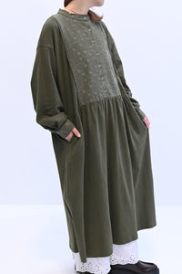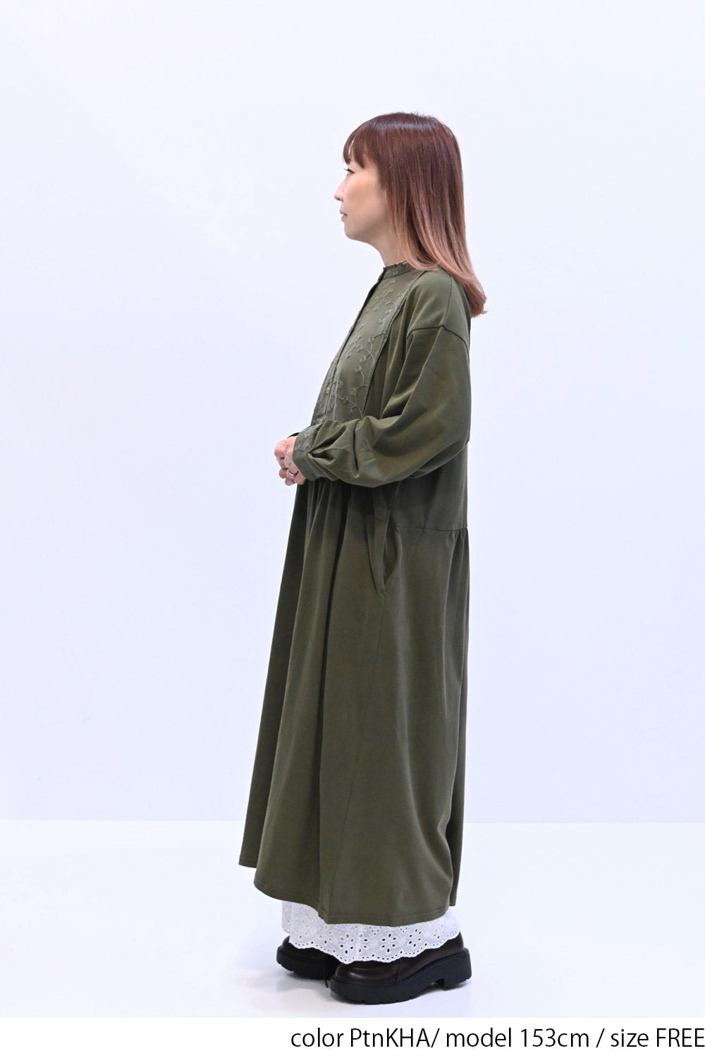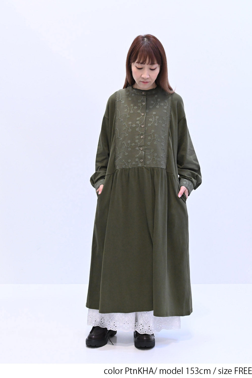 前見頃に施されたナチュラルな刺繍と、首まわりにあしらわれた繊細なレースが魅力の切替ワンピース。
