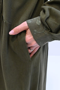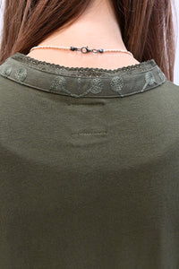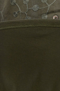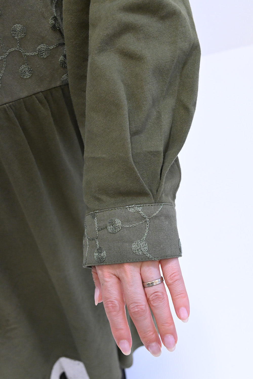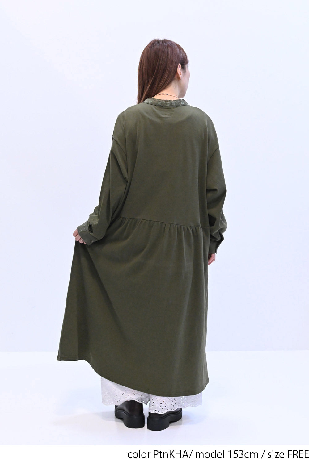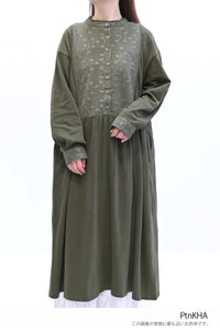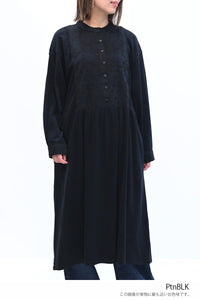 前見頃に施されたナチュラルな刺繍と、首まわりにあしらわれた繊細なレースが魅力の切替ワンピース。