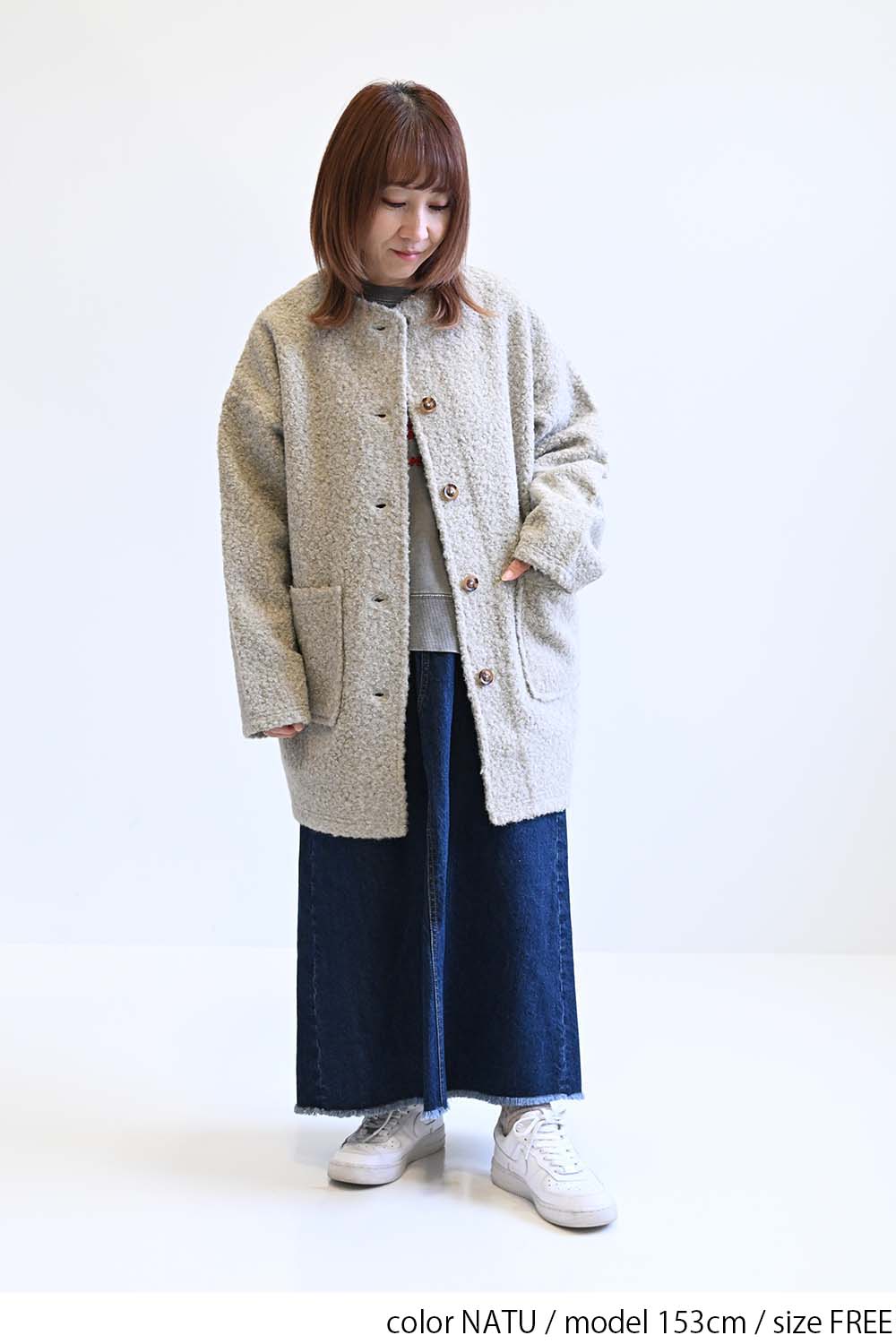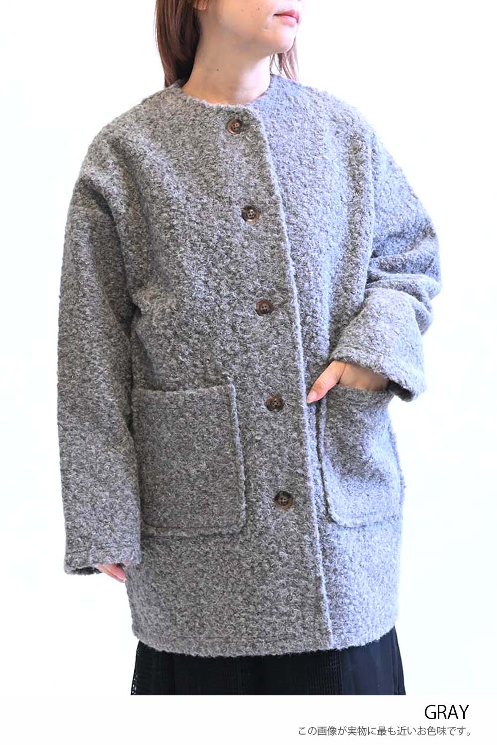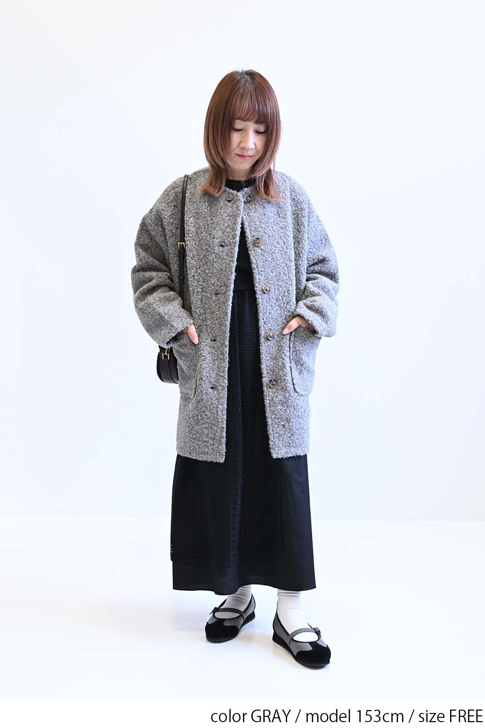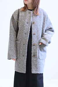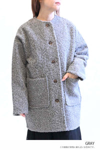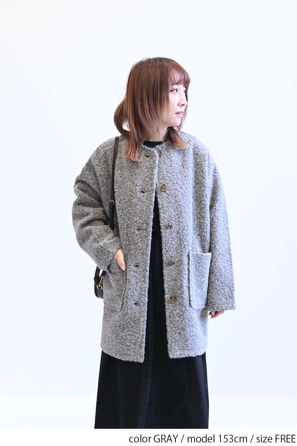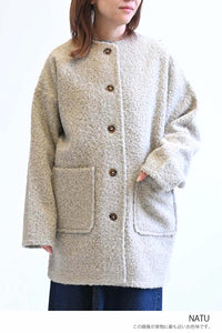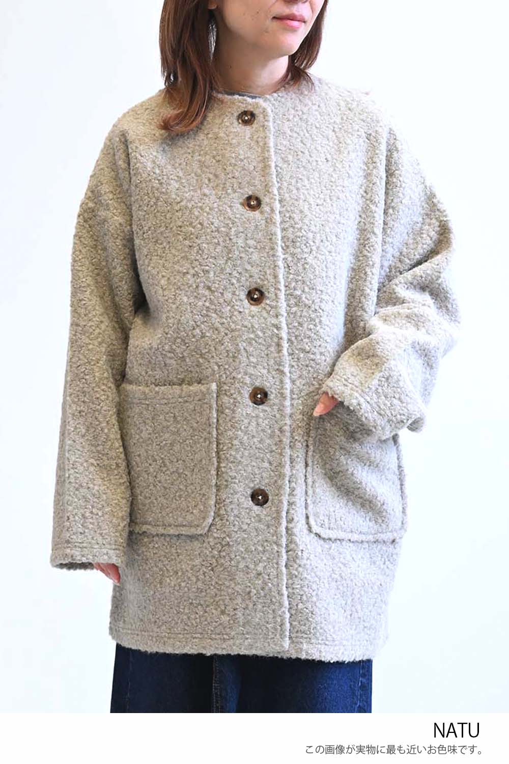 起毛感のあるウールライク素材を使用したノーカラーコートです。