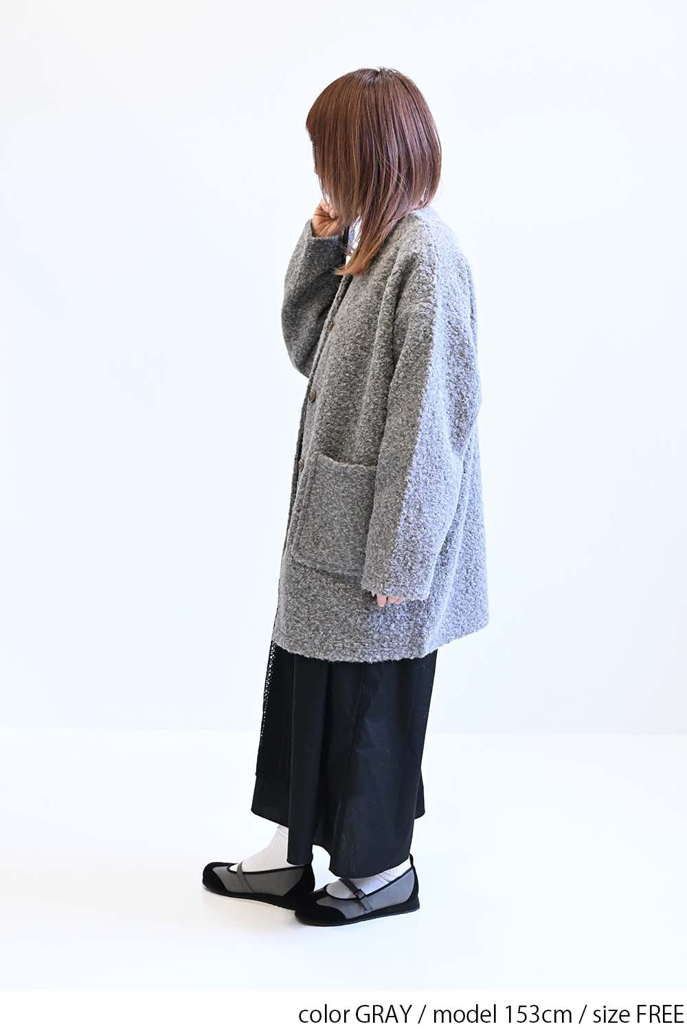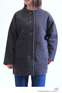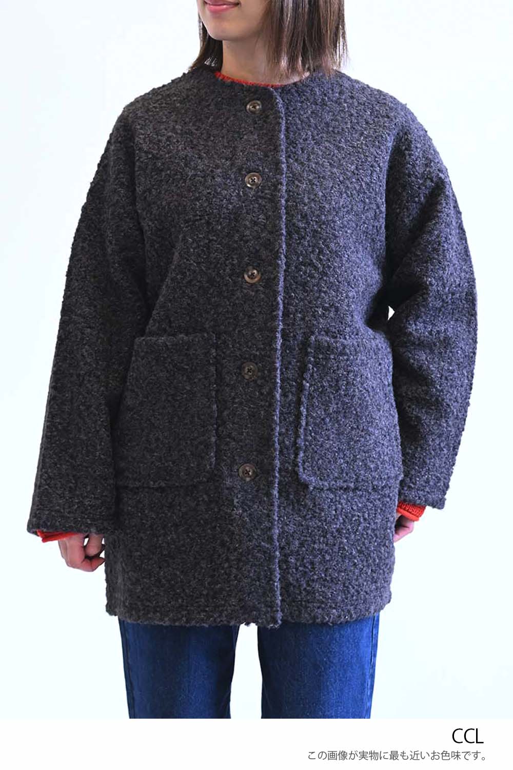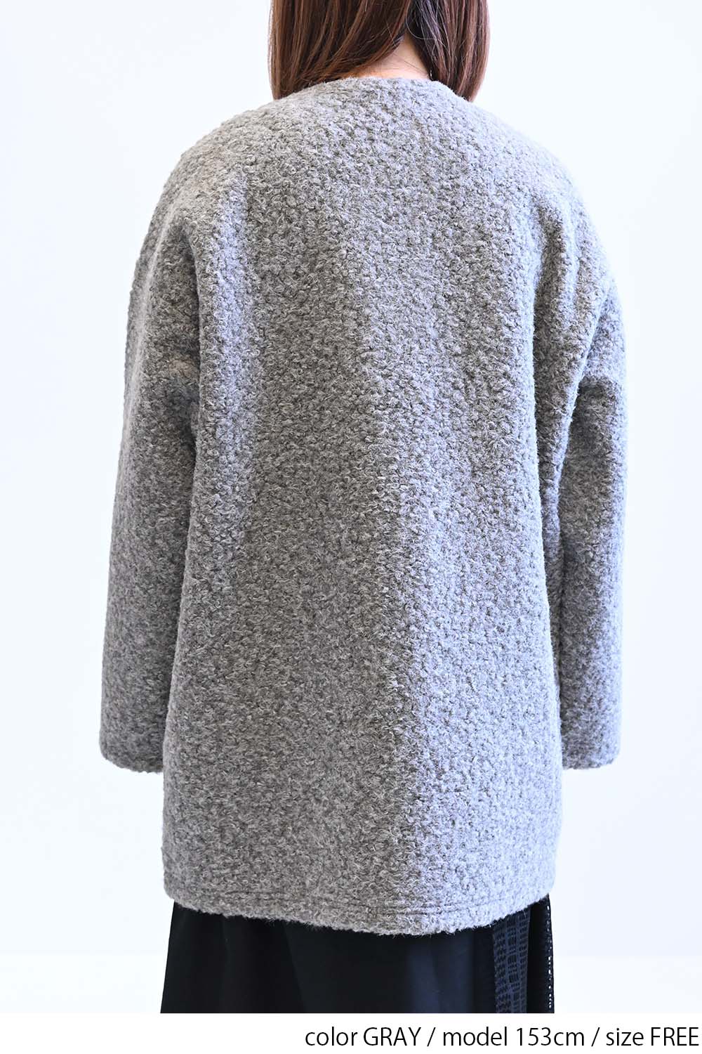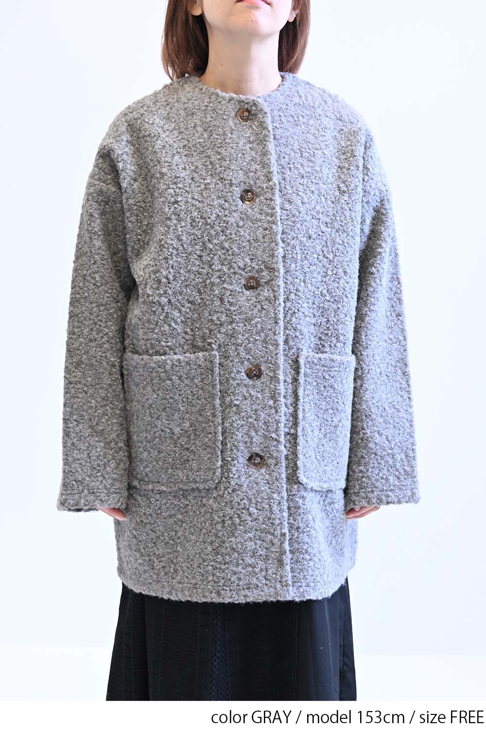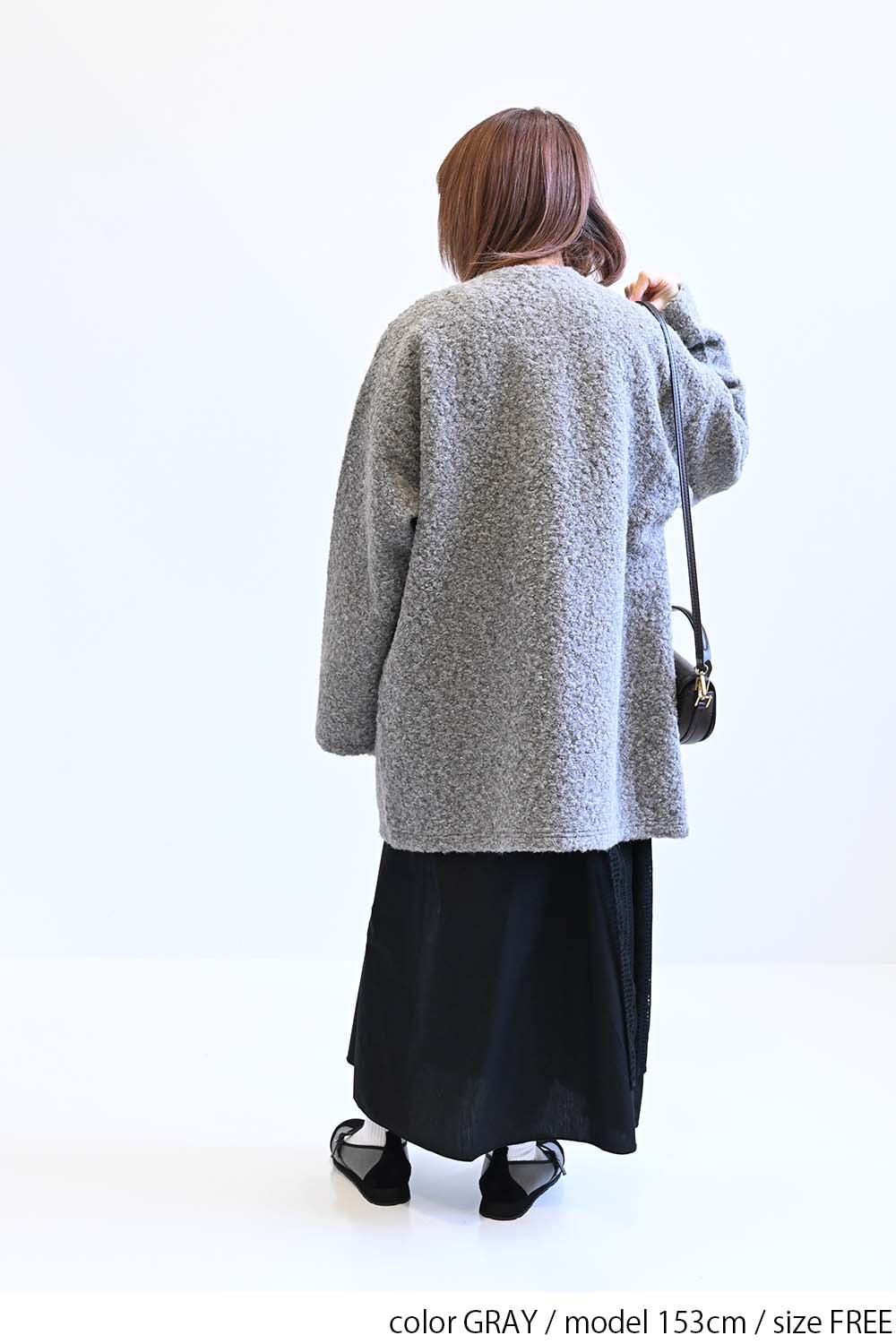 起毛感のあるウールライク素材を使用したノーカラーコートです。