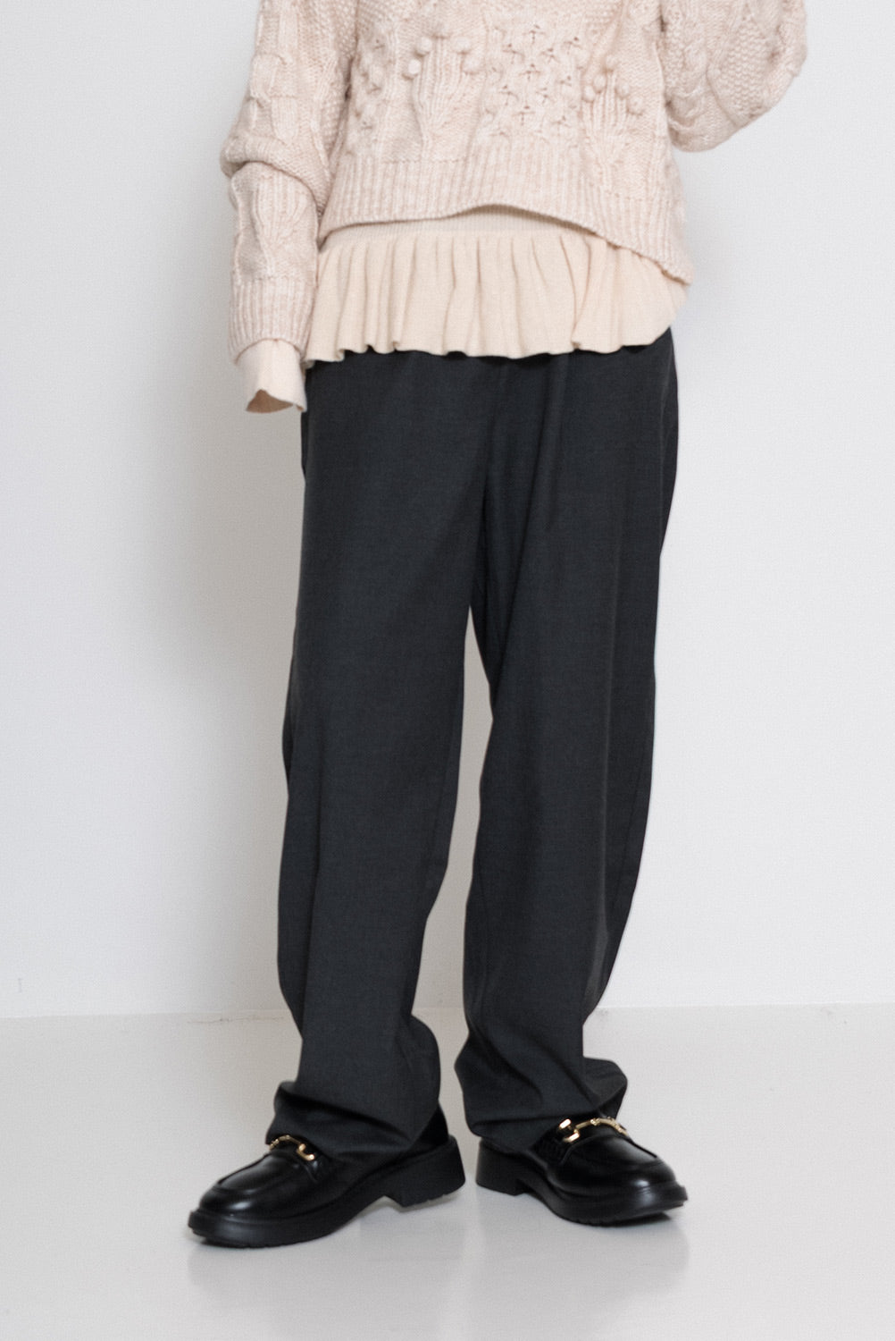 足元はパンプスでフォーマルに、スニーカーでカジュアルダウンしてもバランス◎。