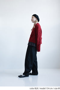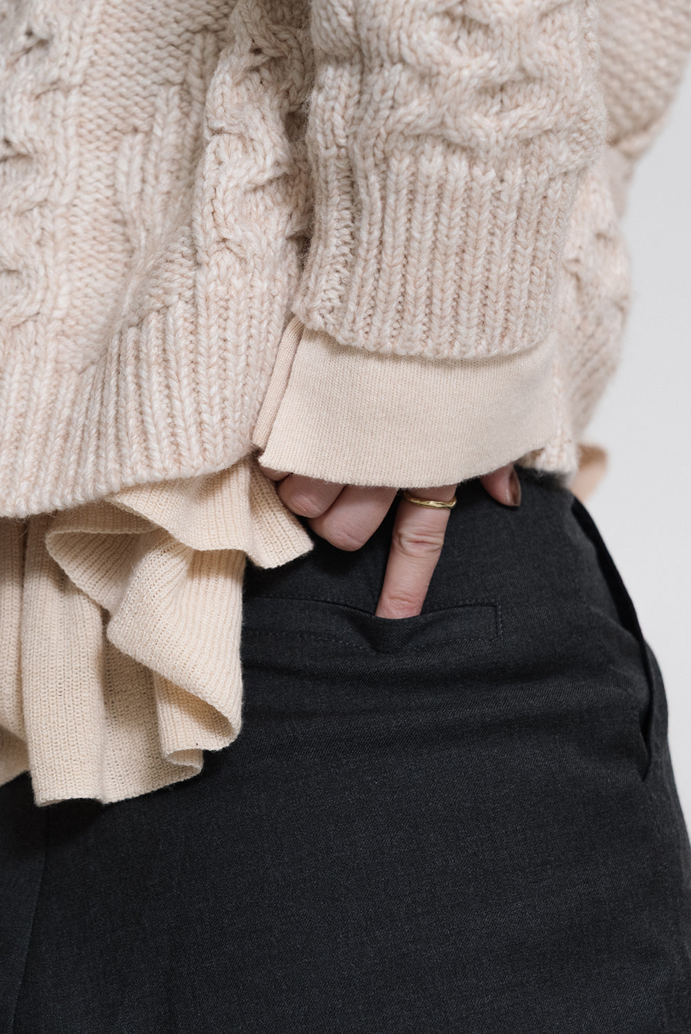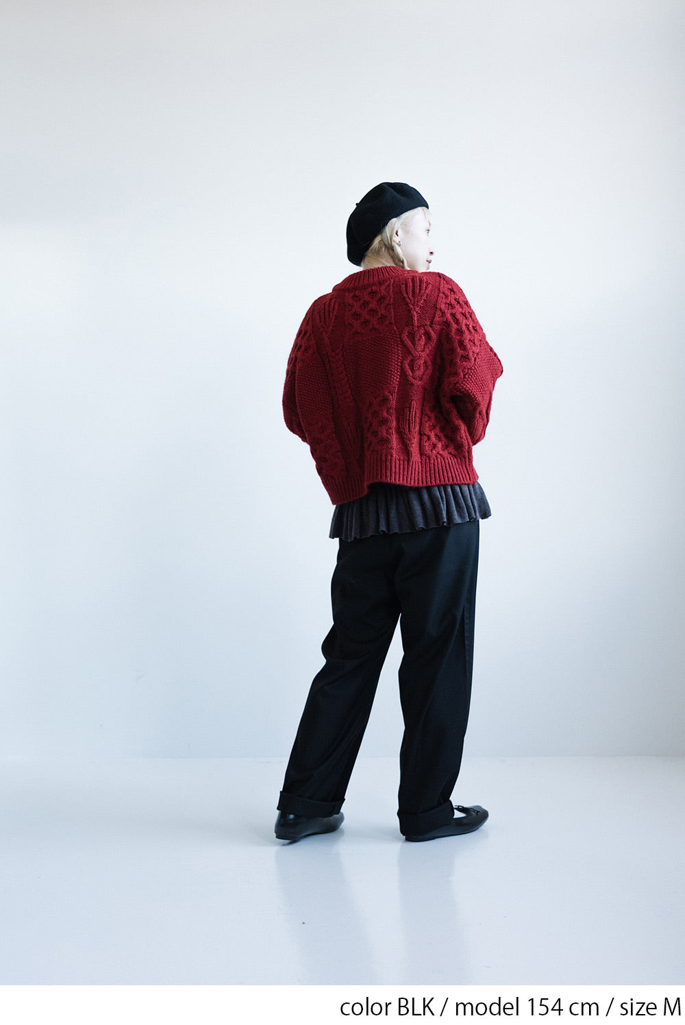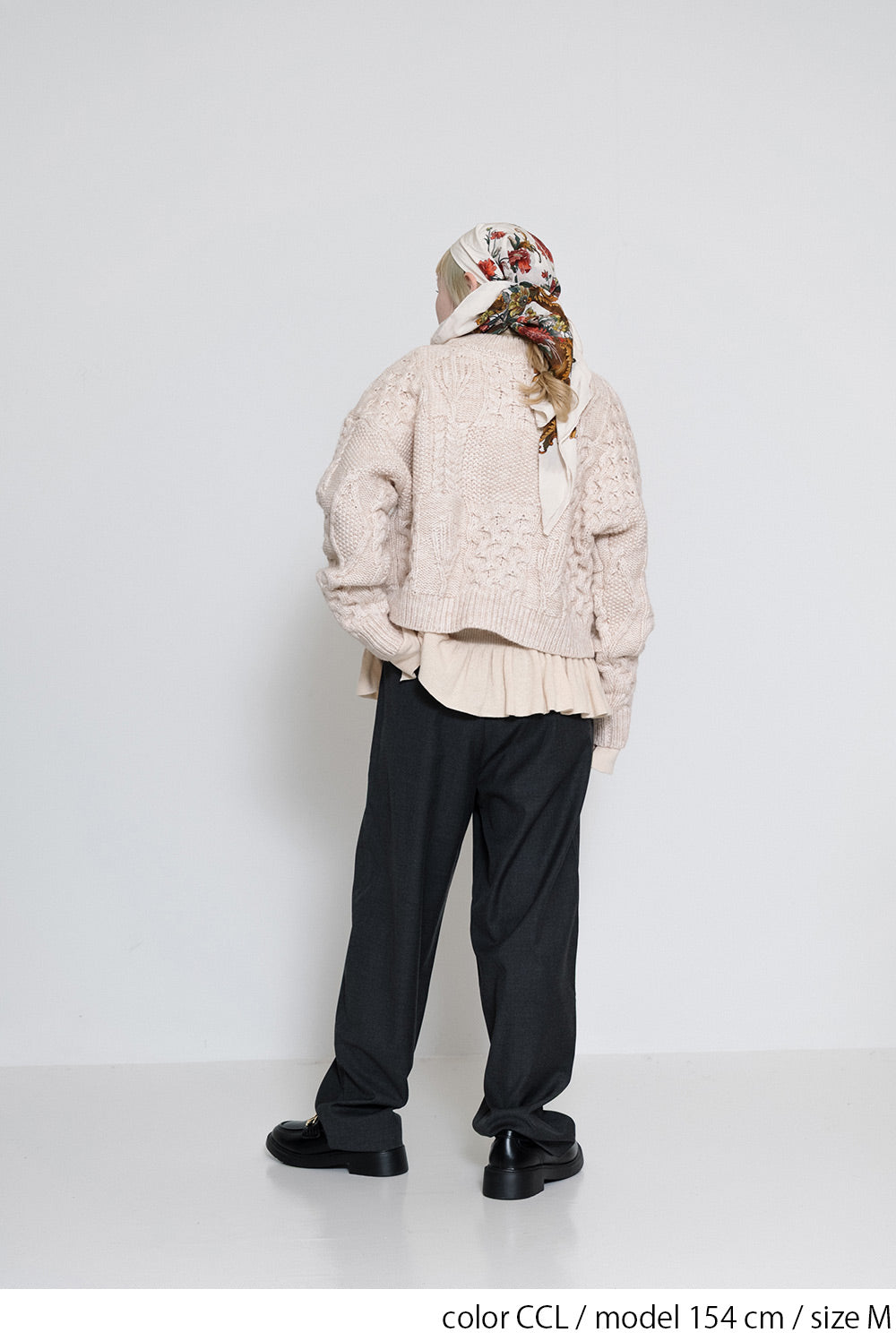 ジャケットを羽織っても、フォーマルになりすぎず、コクーンシルエットがこなれた印象に仕上げます。