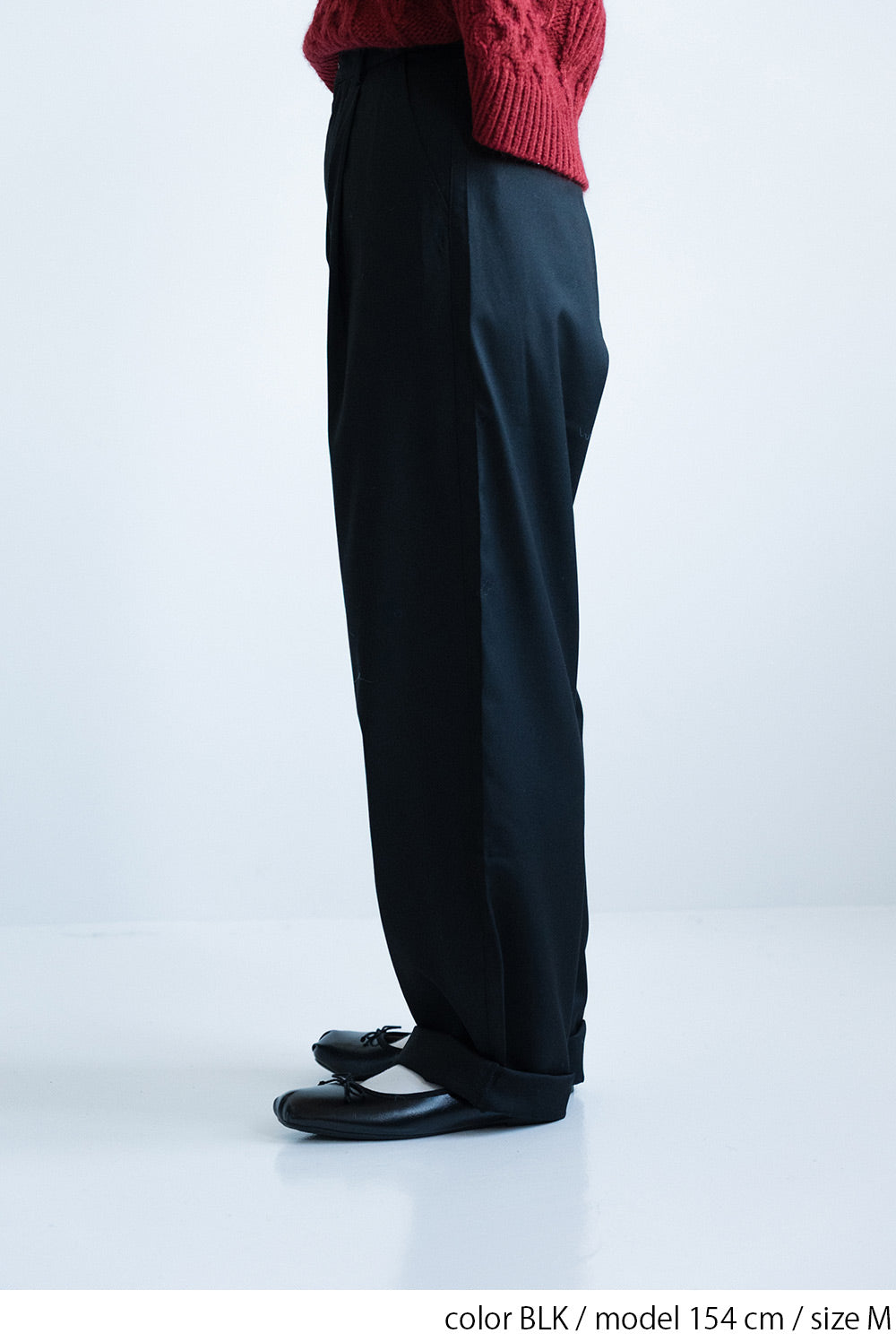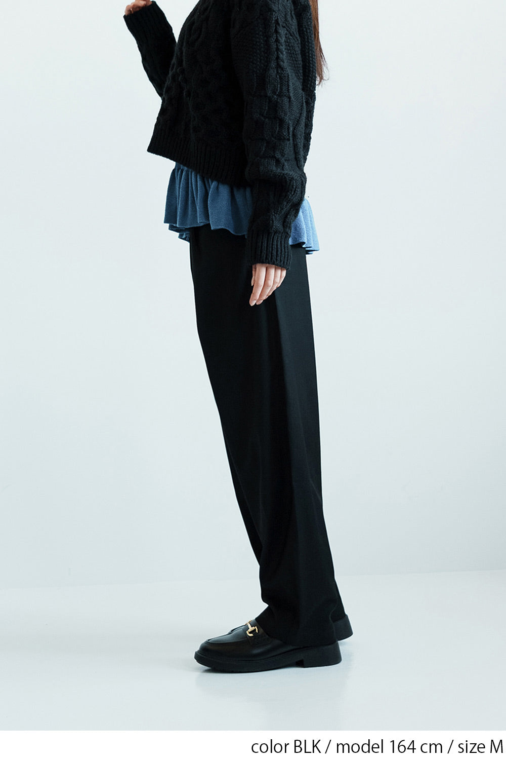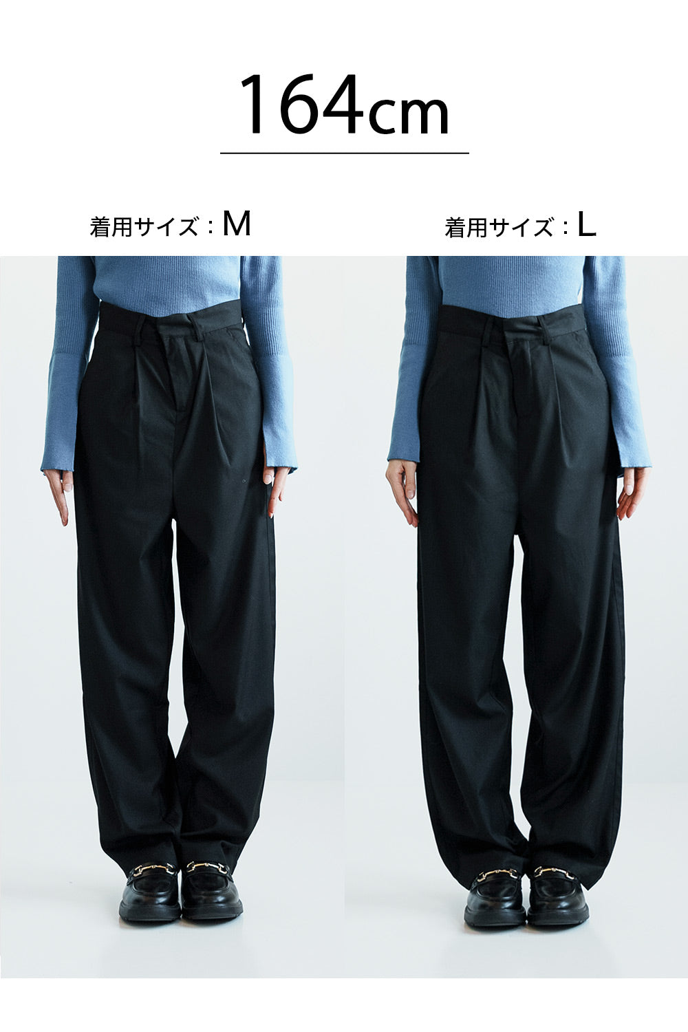 ハイウエストで着用して、ブラウスやニットをタックインすれば、脚長効果とスタイルアップを同時に実現。