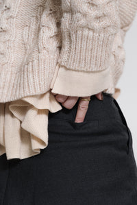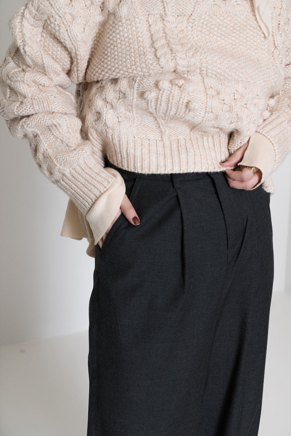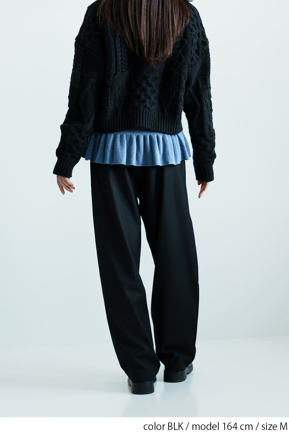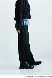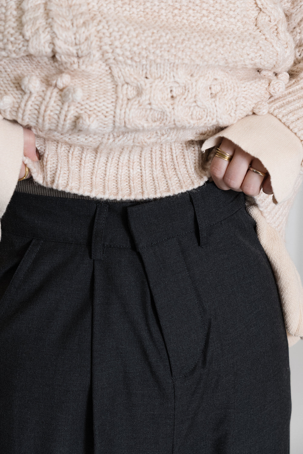 ハイウエストで着用して、ブラウスやニットをタックインすれば、脚長効果とスタイルアップを同時に実現。