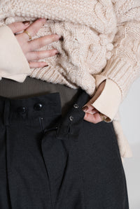 ウエストは2WAY仕様で、内側のボタンを止めることでハイウエストとしても着用可能。