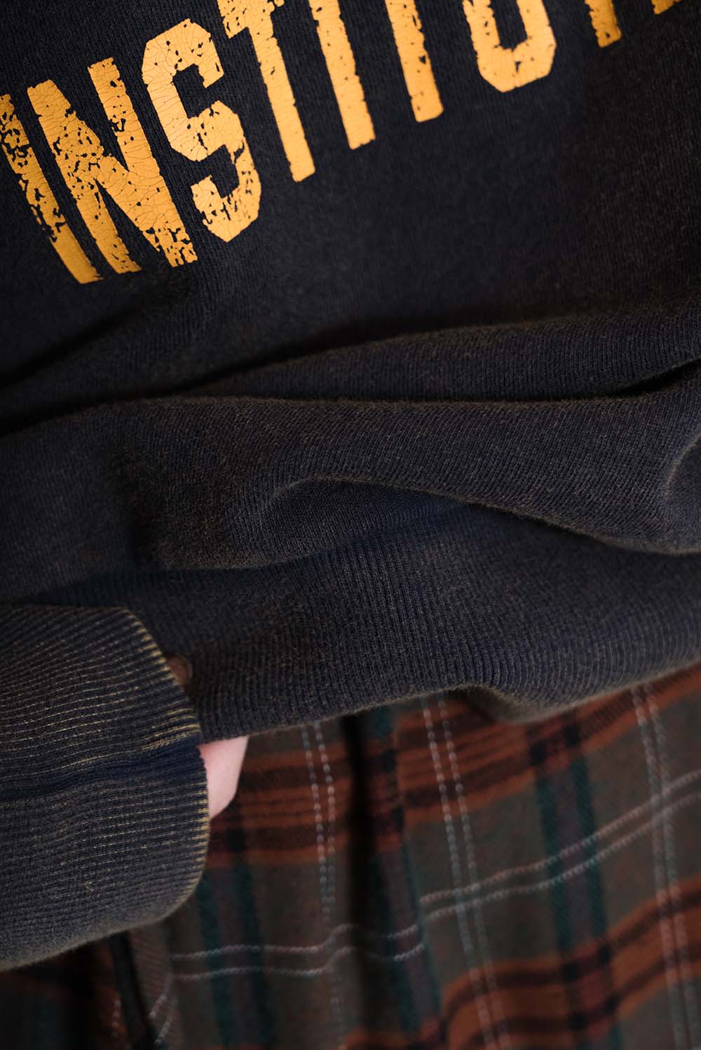 カスレ調のロゴプリントがヴィンテージ感を漂わせ、シンプルながら存在感のある一枚に仕上げました。