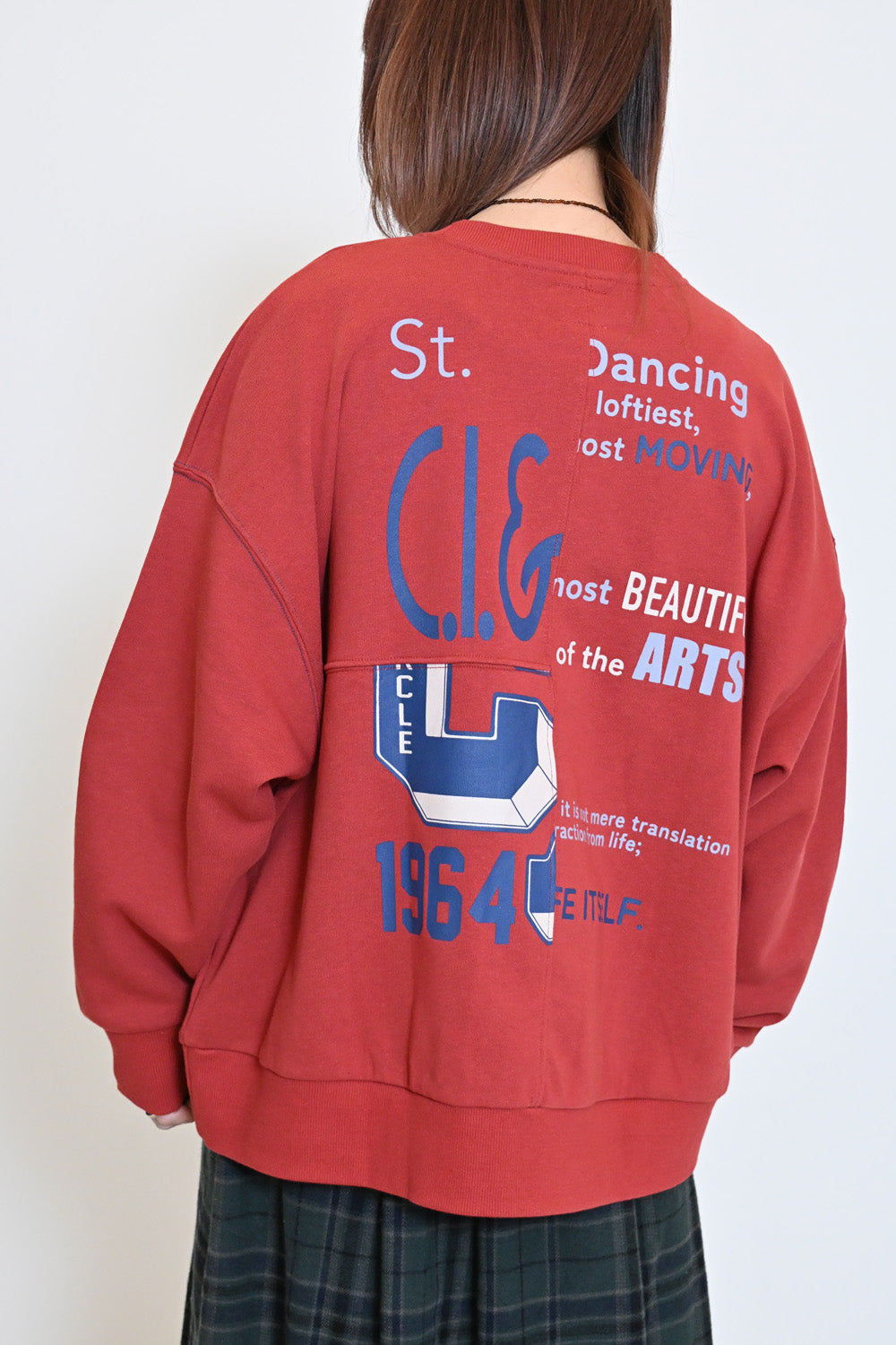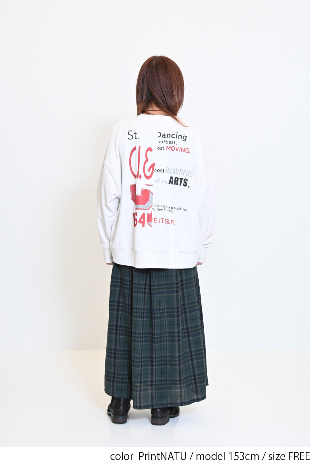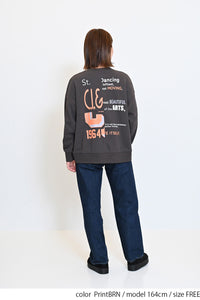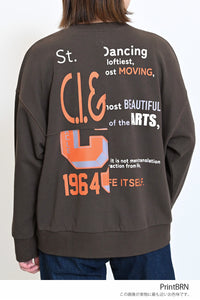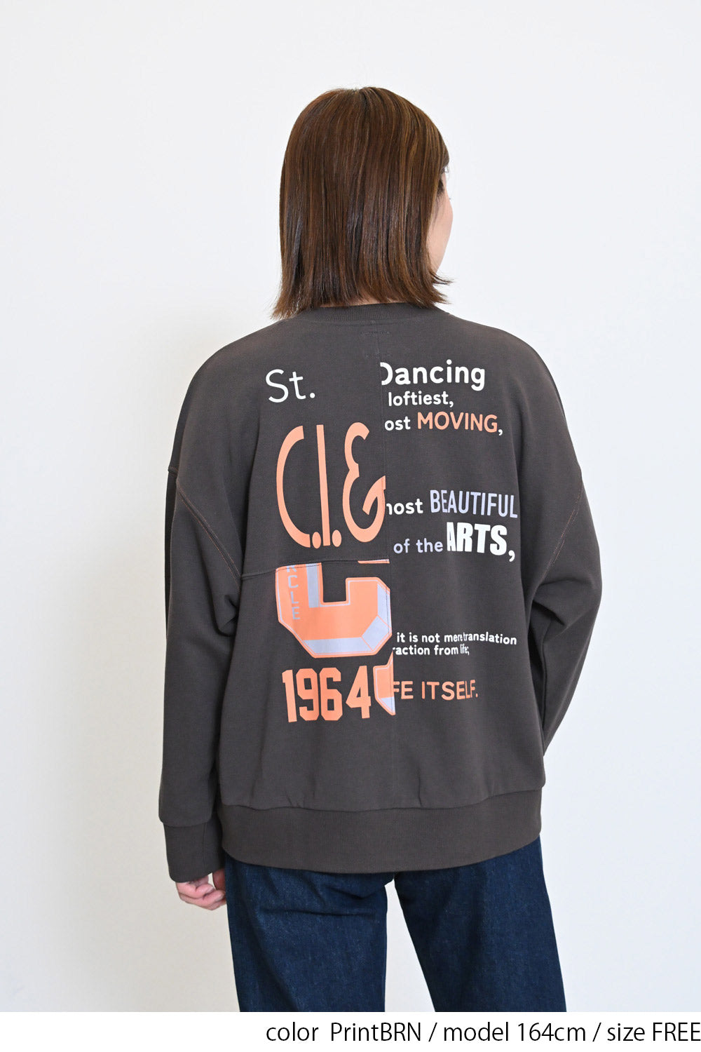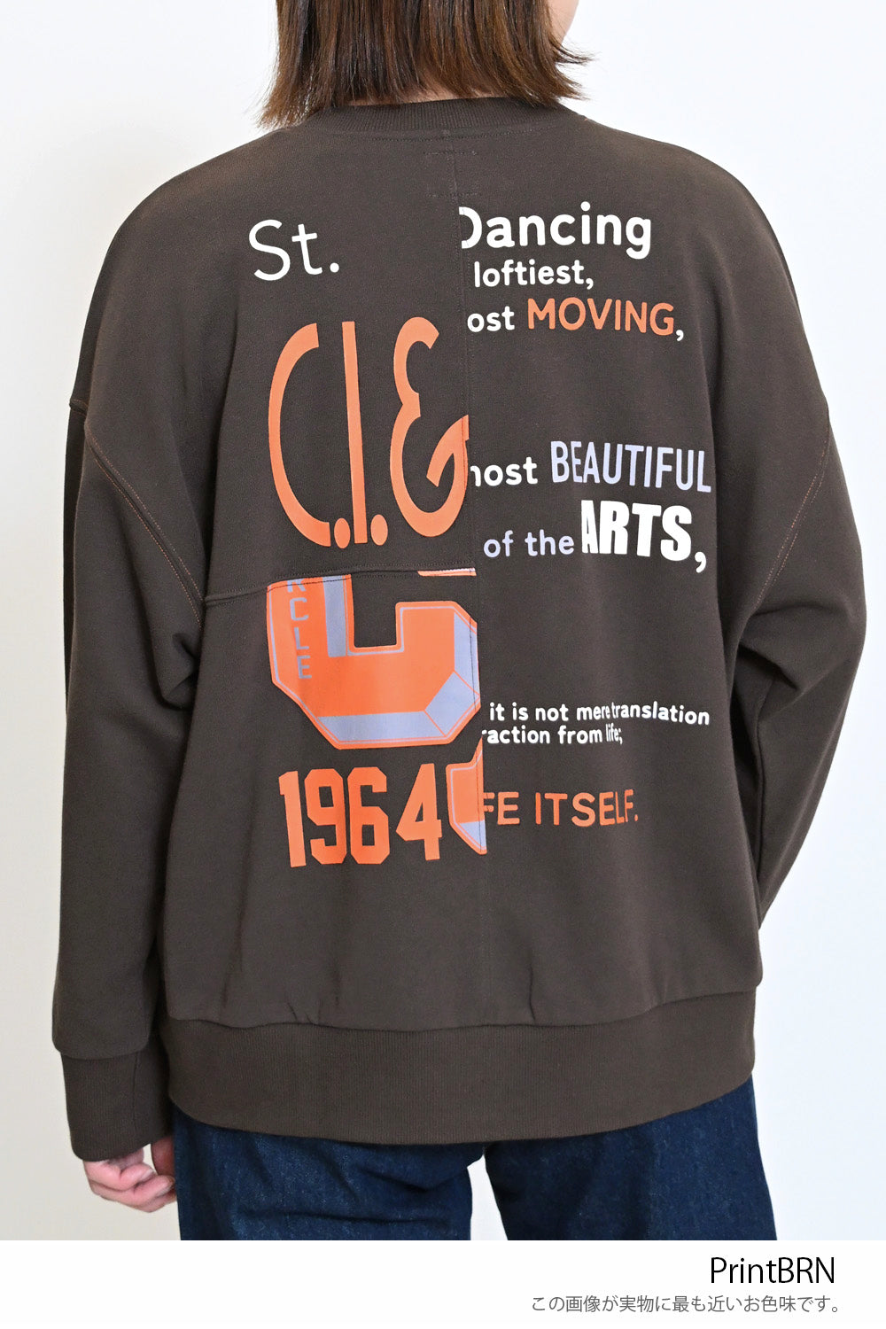 さまざまなプリントを組み合わせたバックデザインが目を引く裏毛トレーナー。