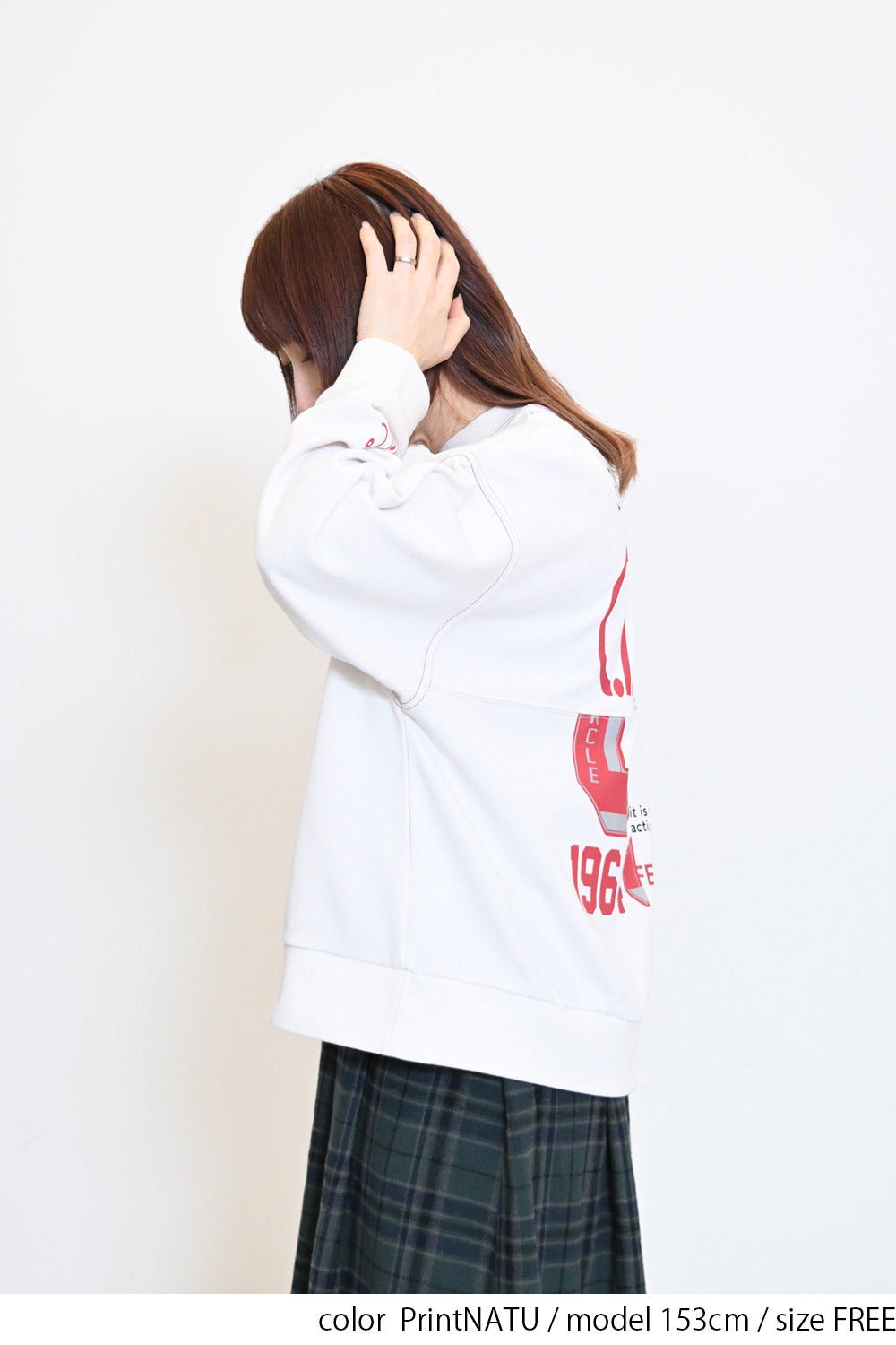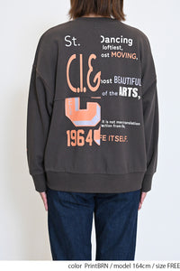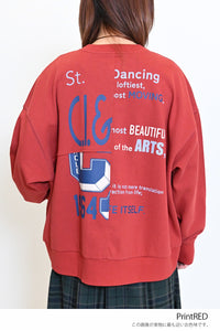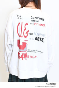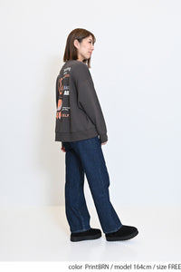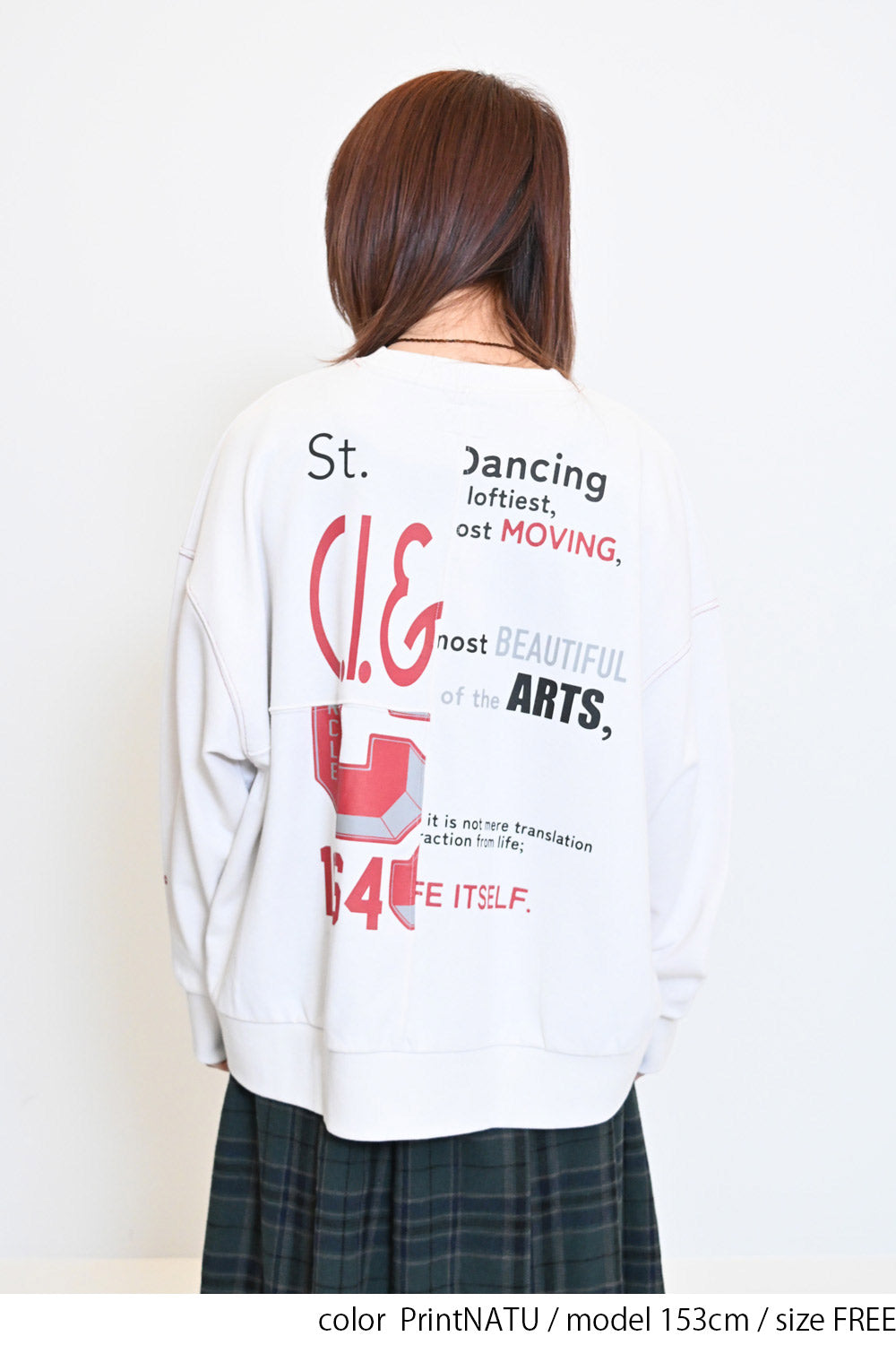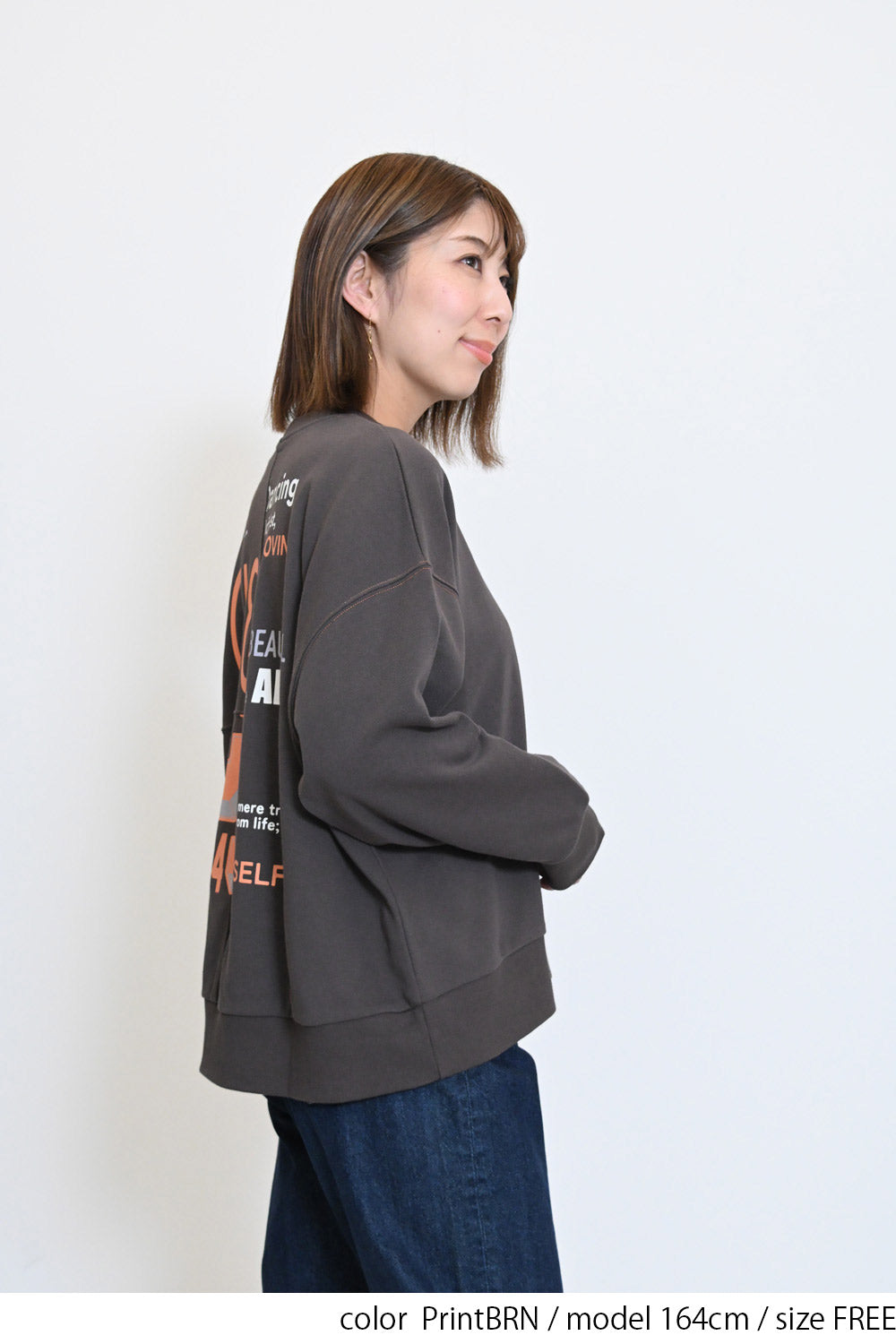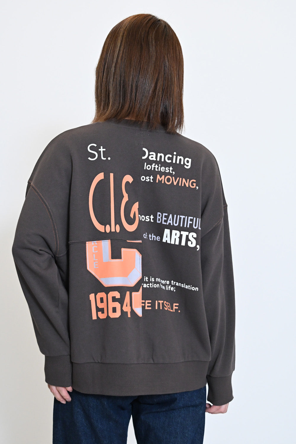 さまざまなプリントを組み合わせたバックデザインが目を引く裏毛トレーナー。