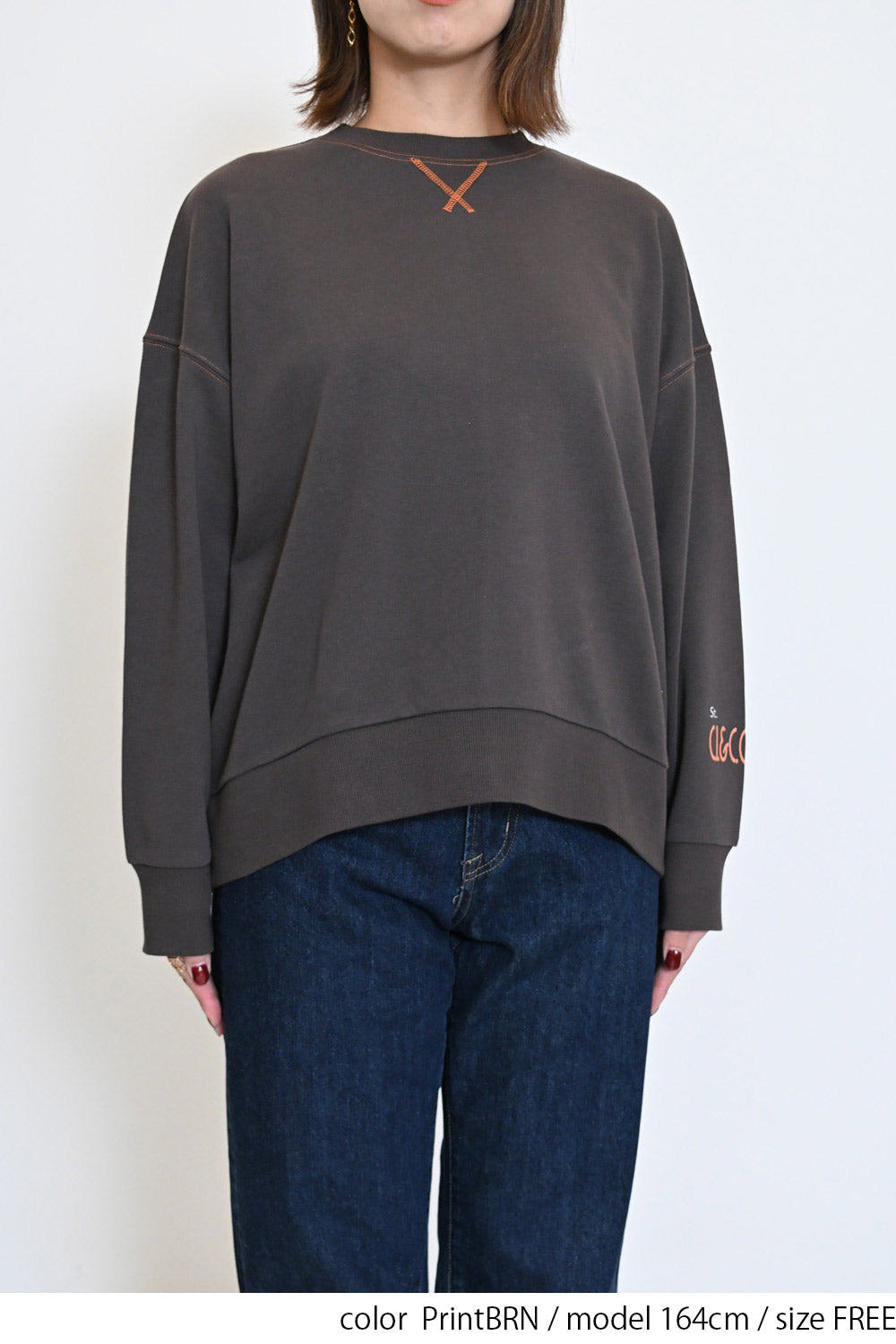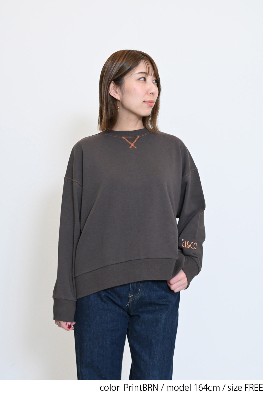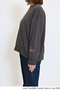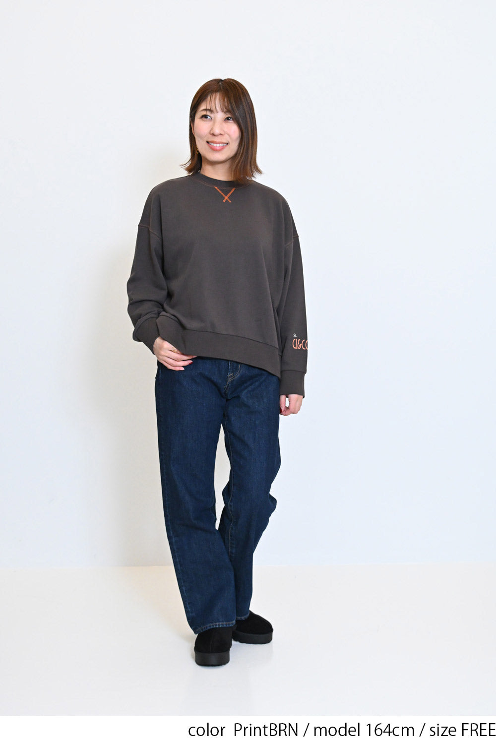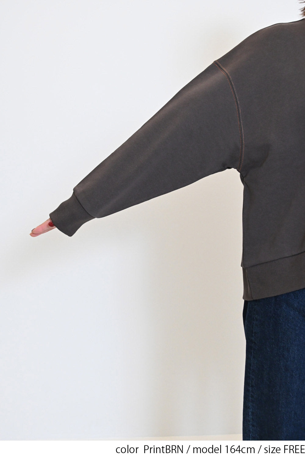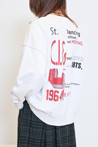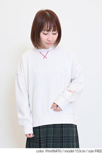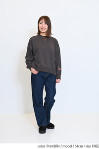 さまざまなプリントを組み合わせたバックデザインが目を引く裏毛トレーナー。