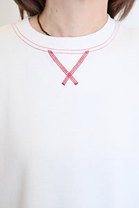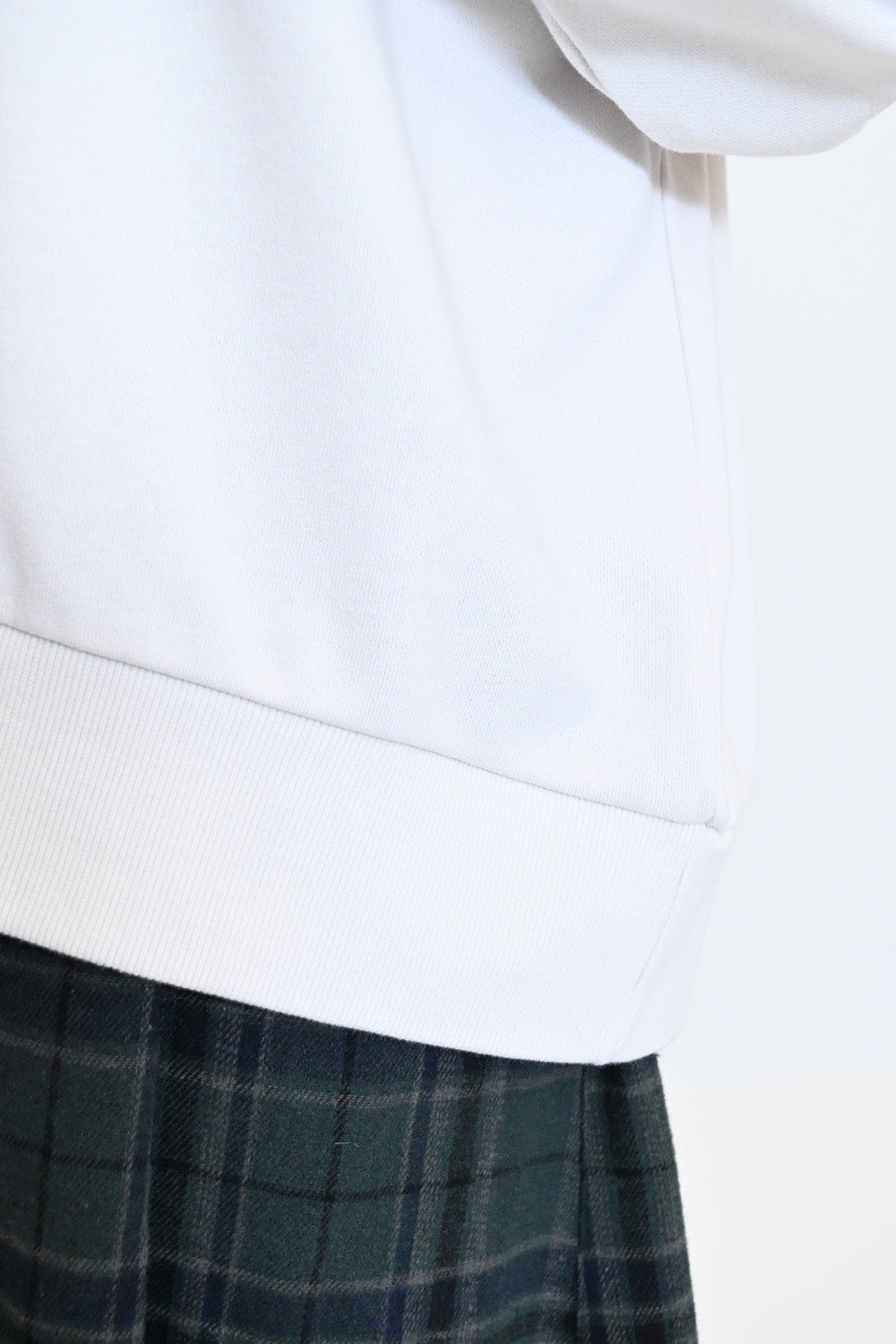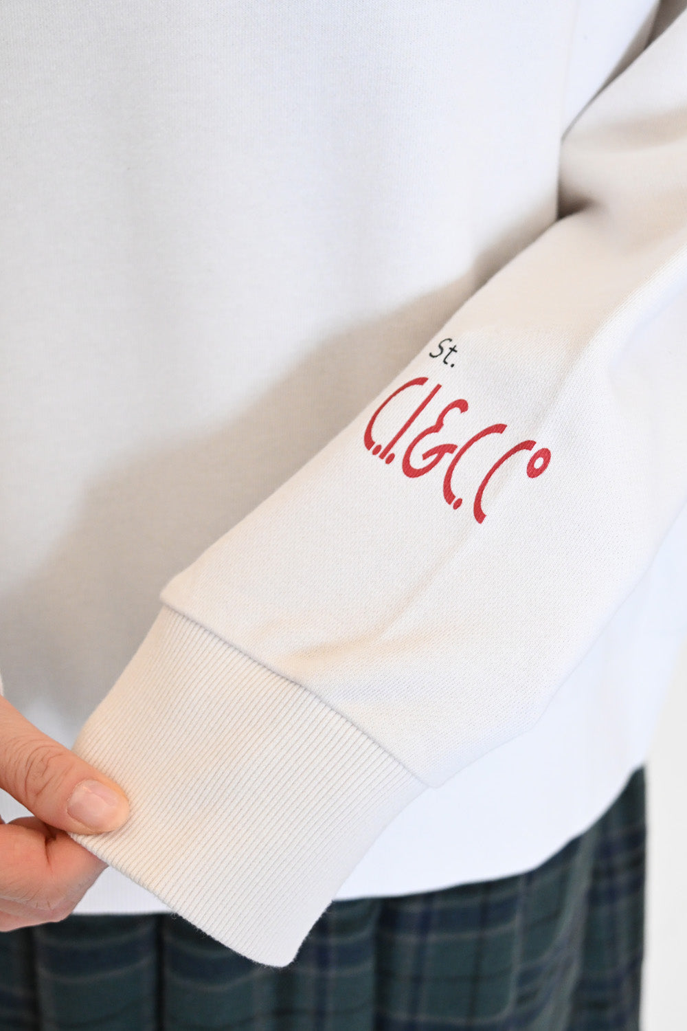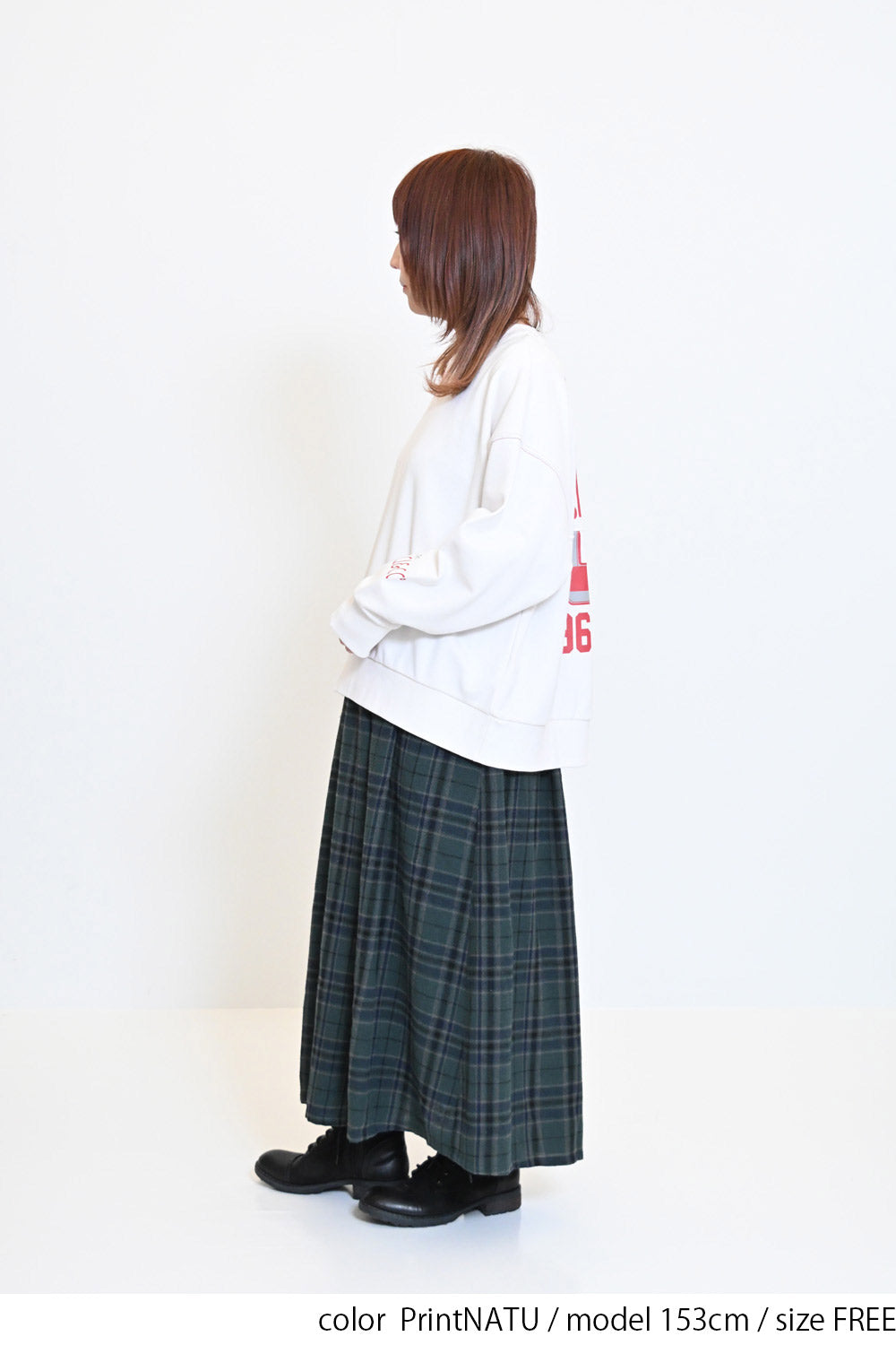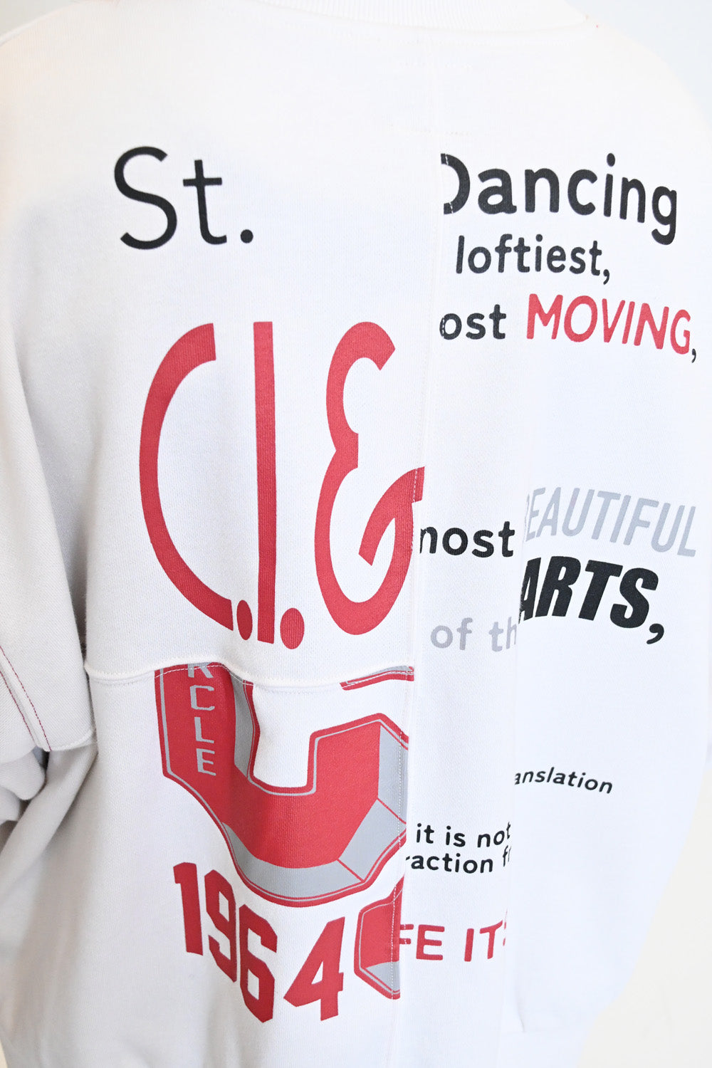 さまざまなプリントを組み合わせたバックデザインが目を引く裏毛トレーナー。