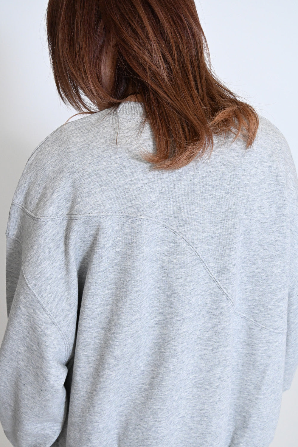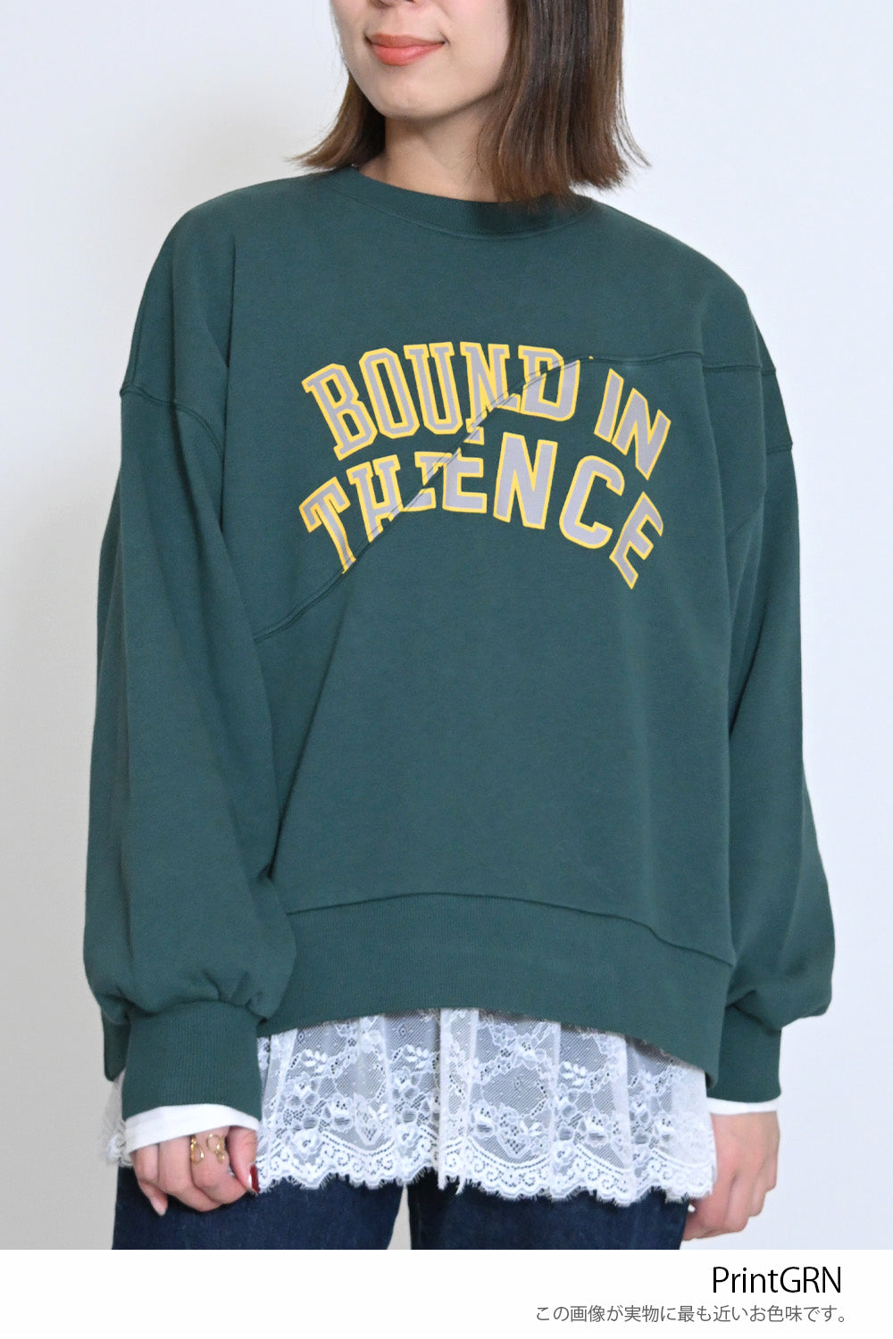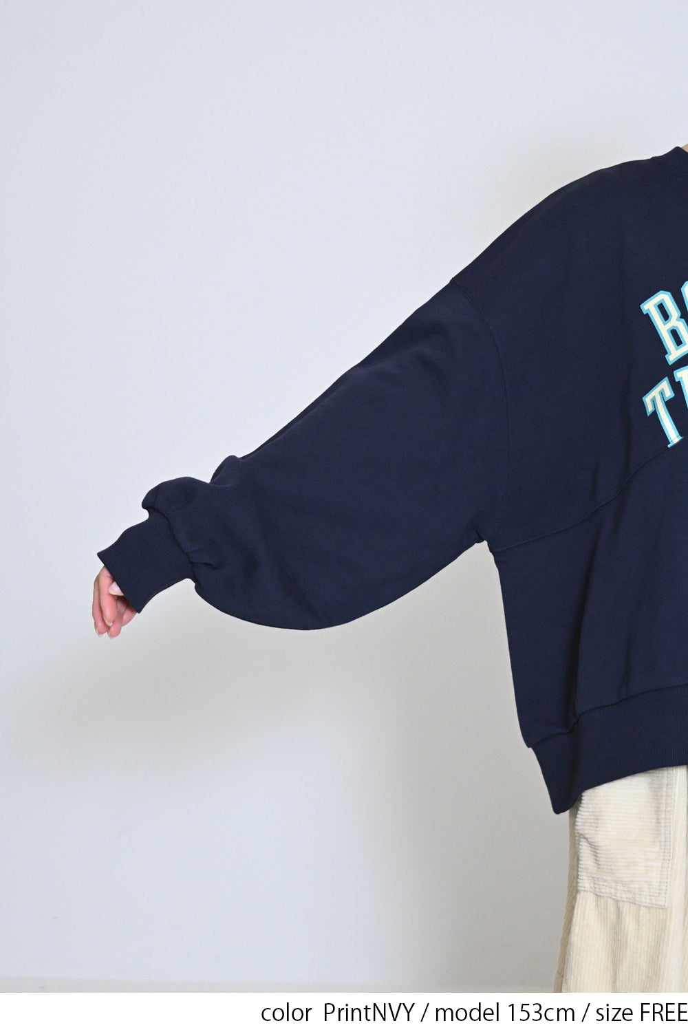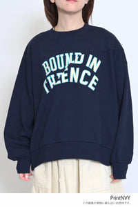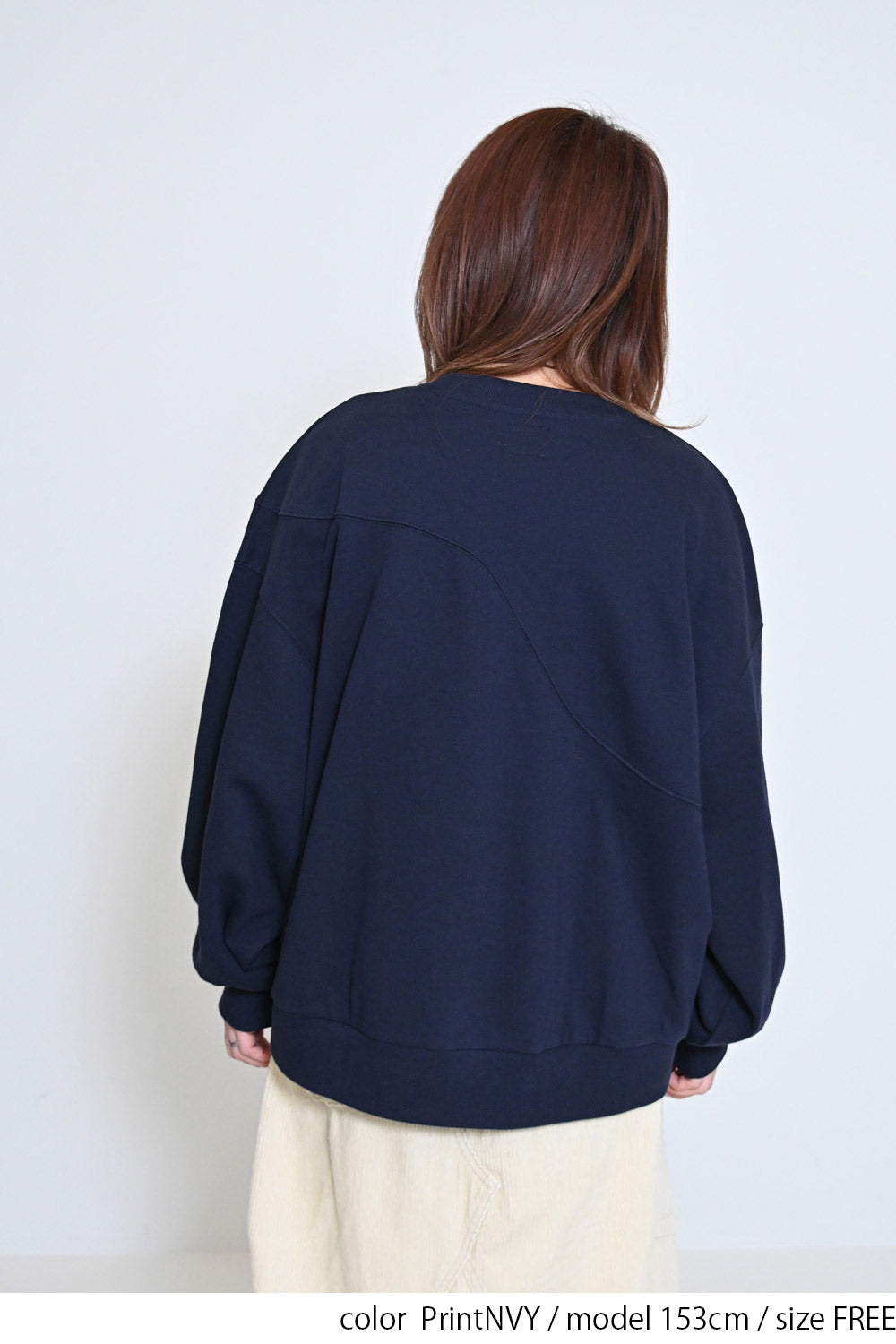胸もとの波打つような切替デザインが印象的なロゴトレーナー。