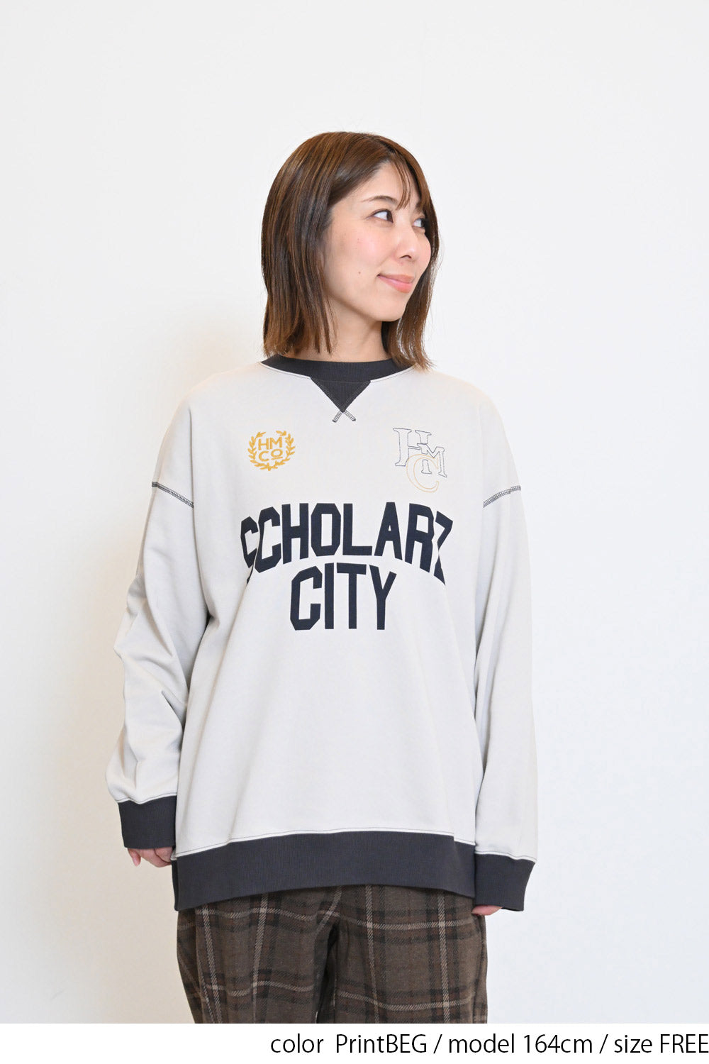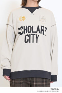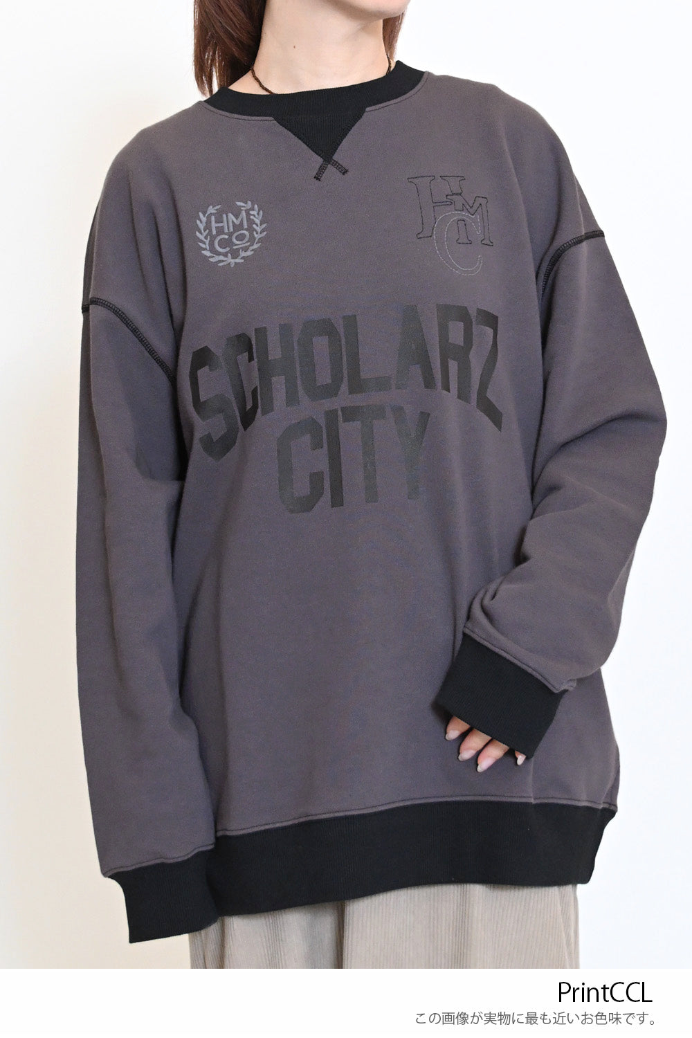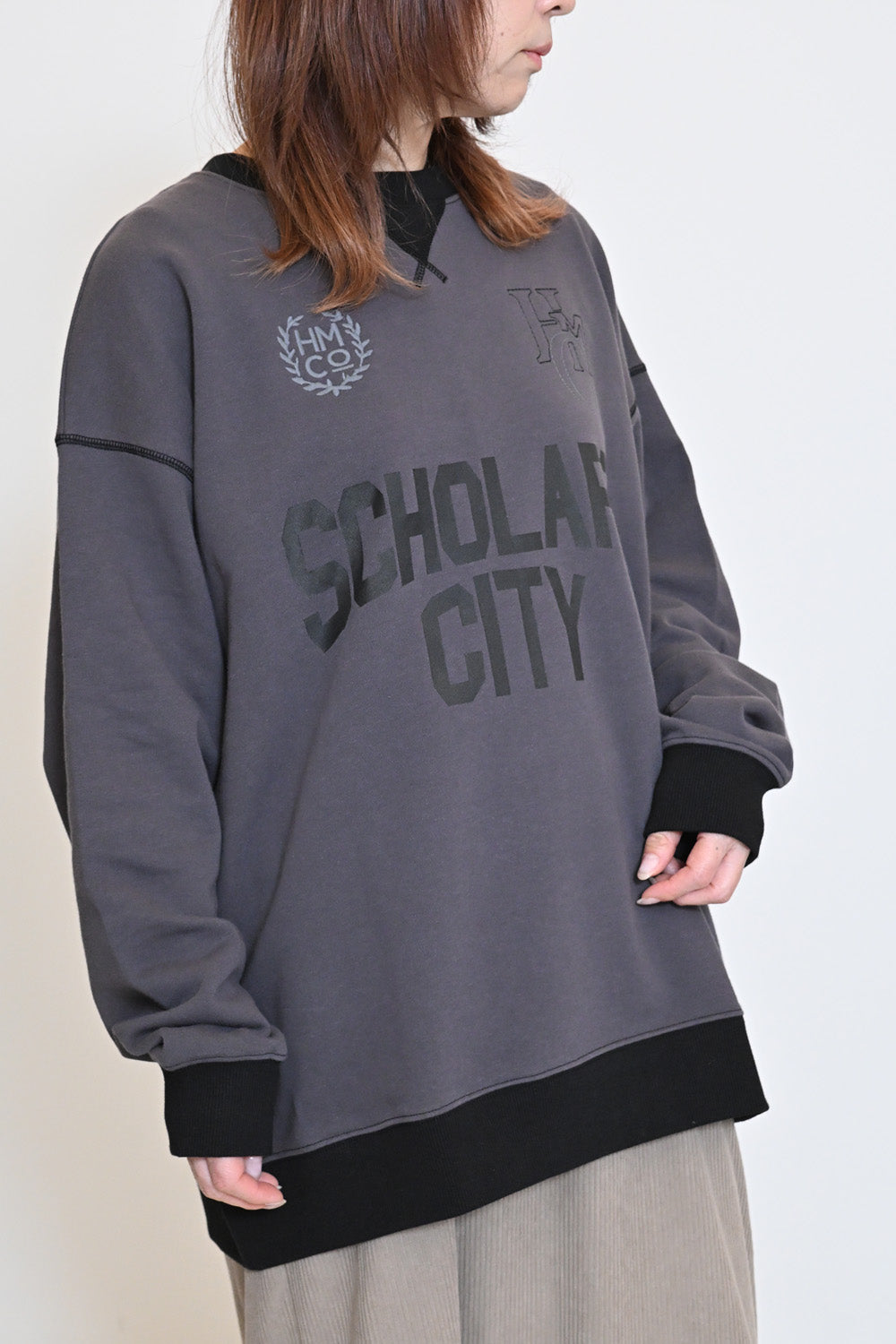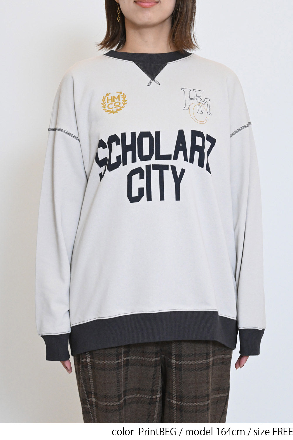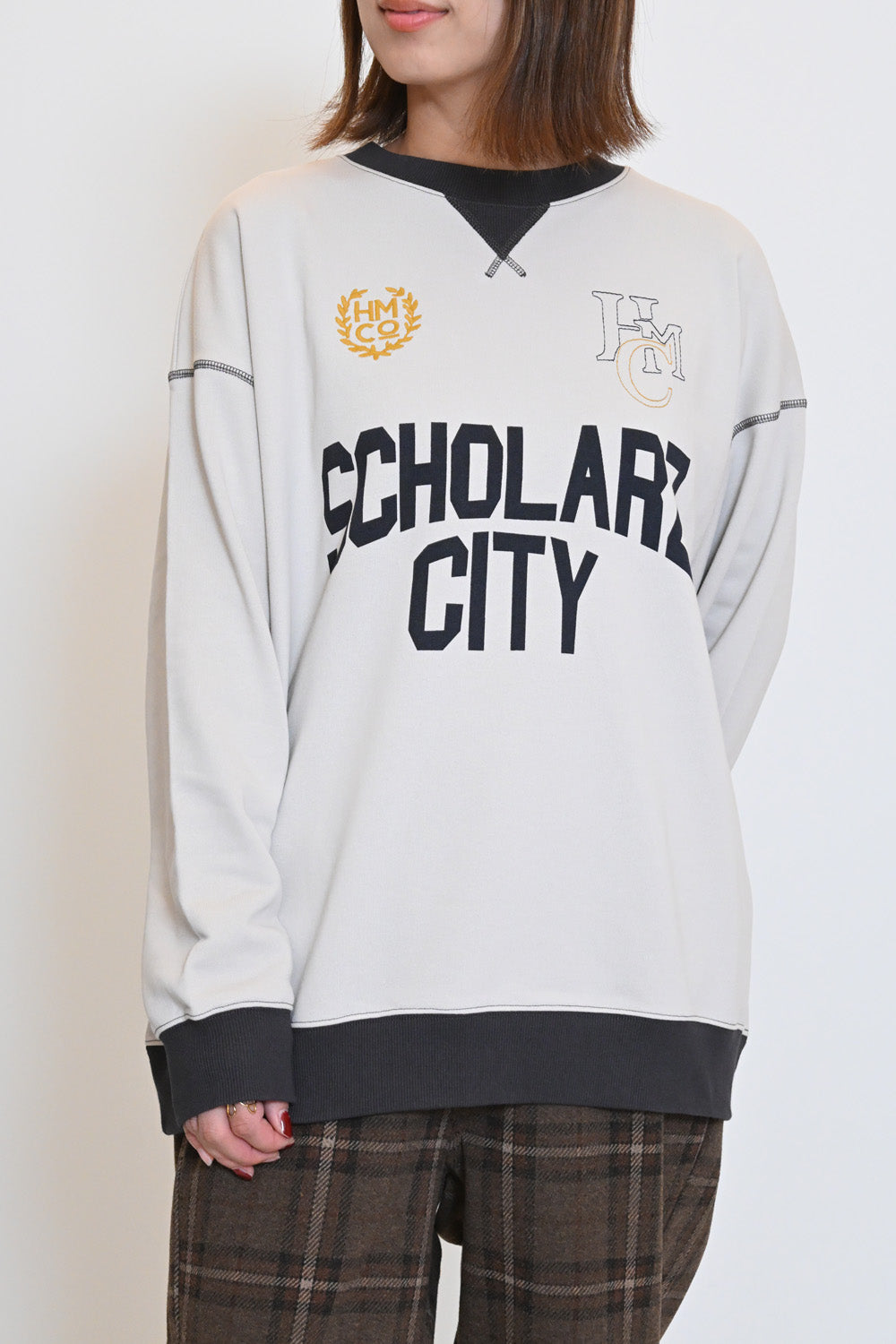 カレッジテイストのプリントと刺繍がポイントになった、HMC刺繍トレーナー。