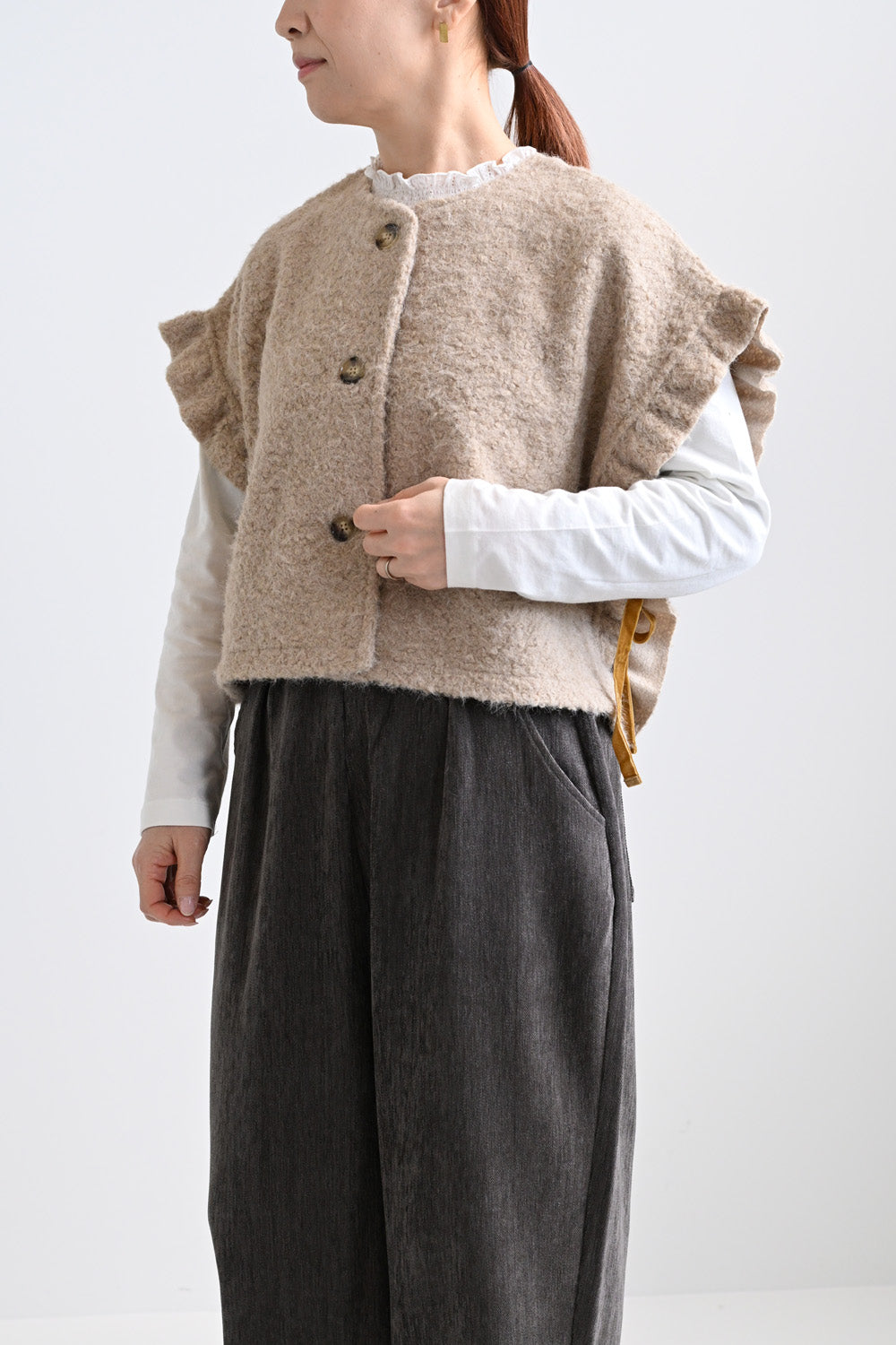 大胆なスクエアシルエットが、着るだけで存在感を放つウールライクベスト。