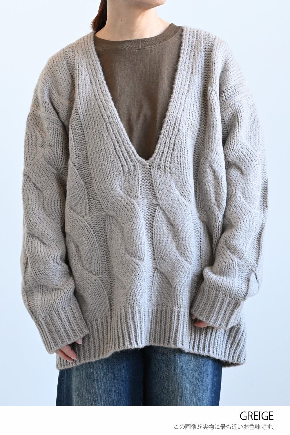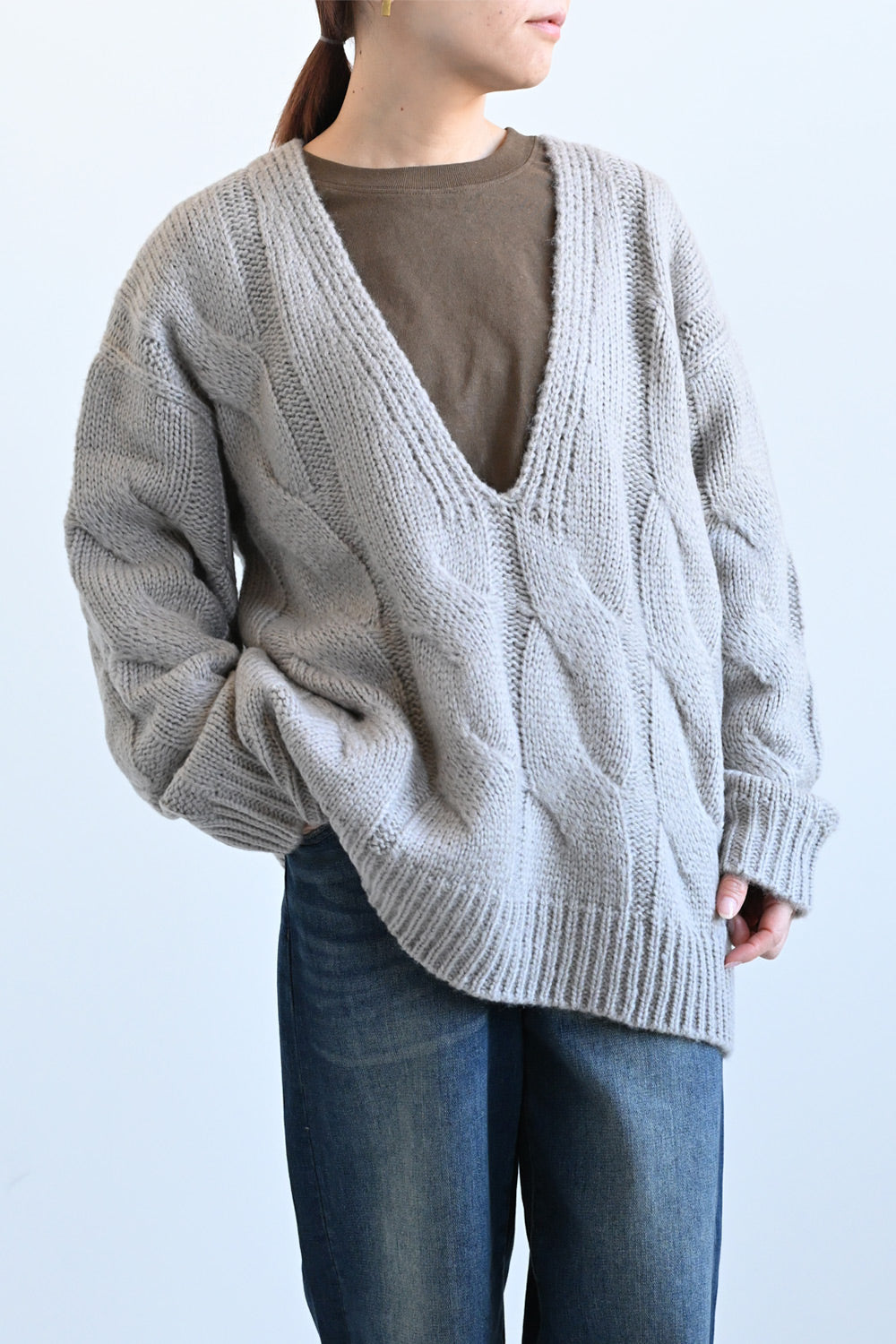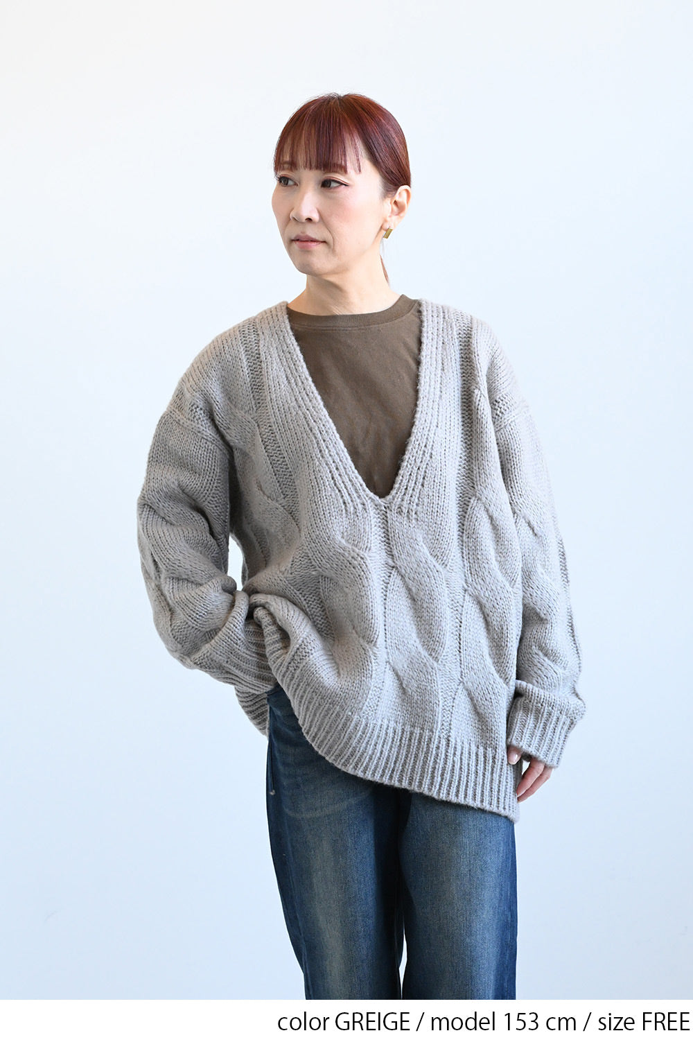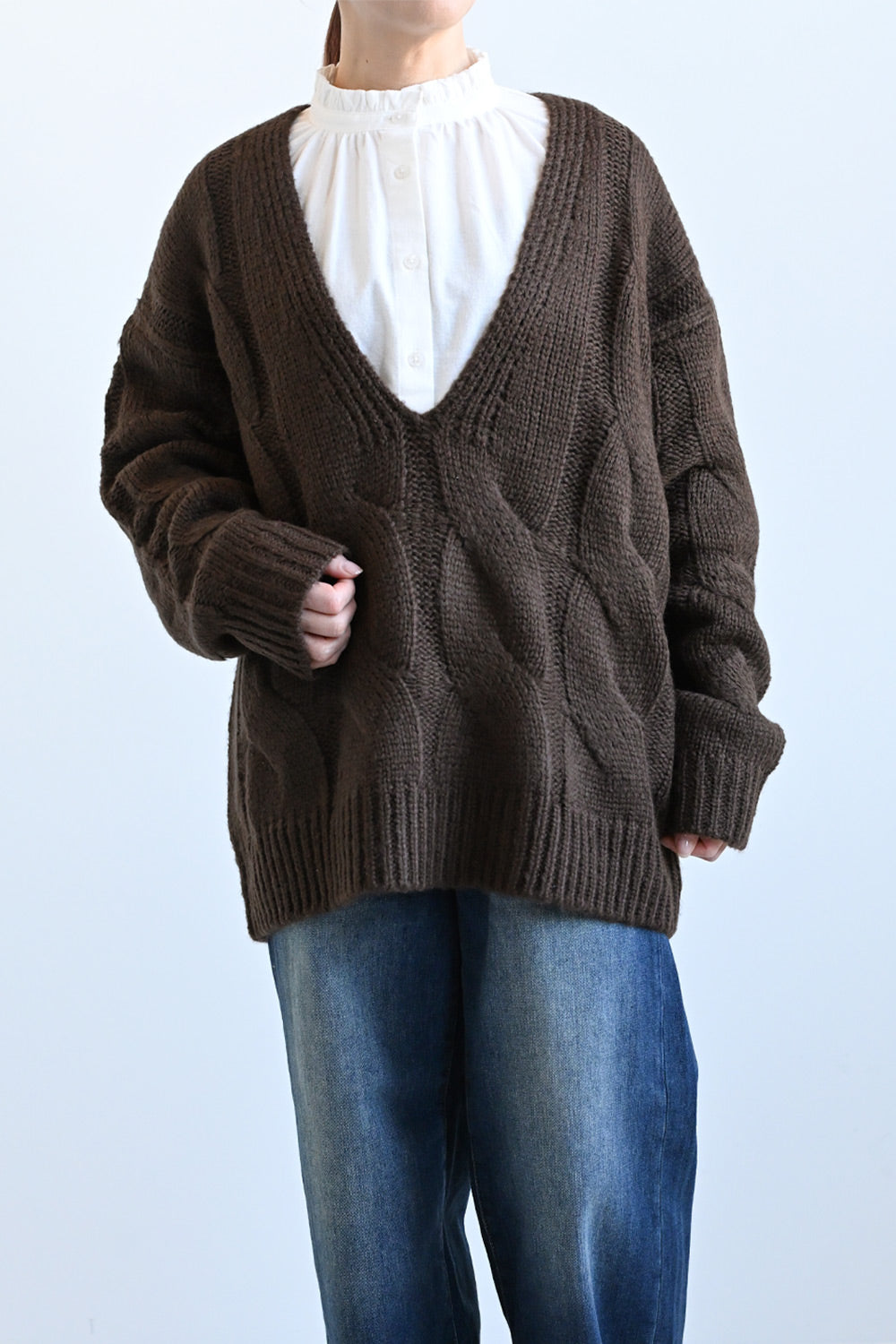 ざっくり編み立てた太ケーブルが存在感を放つ大人のためのVネックニット。