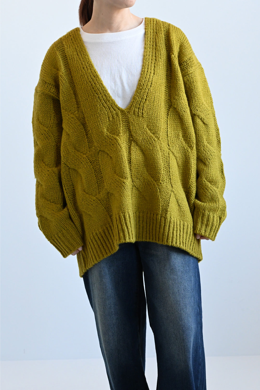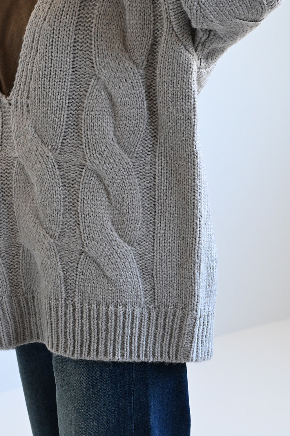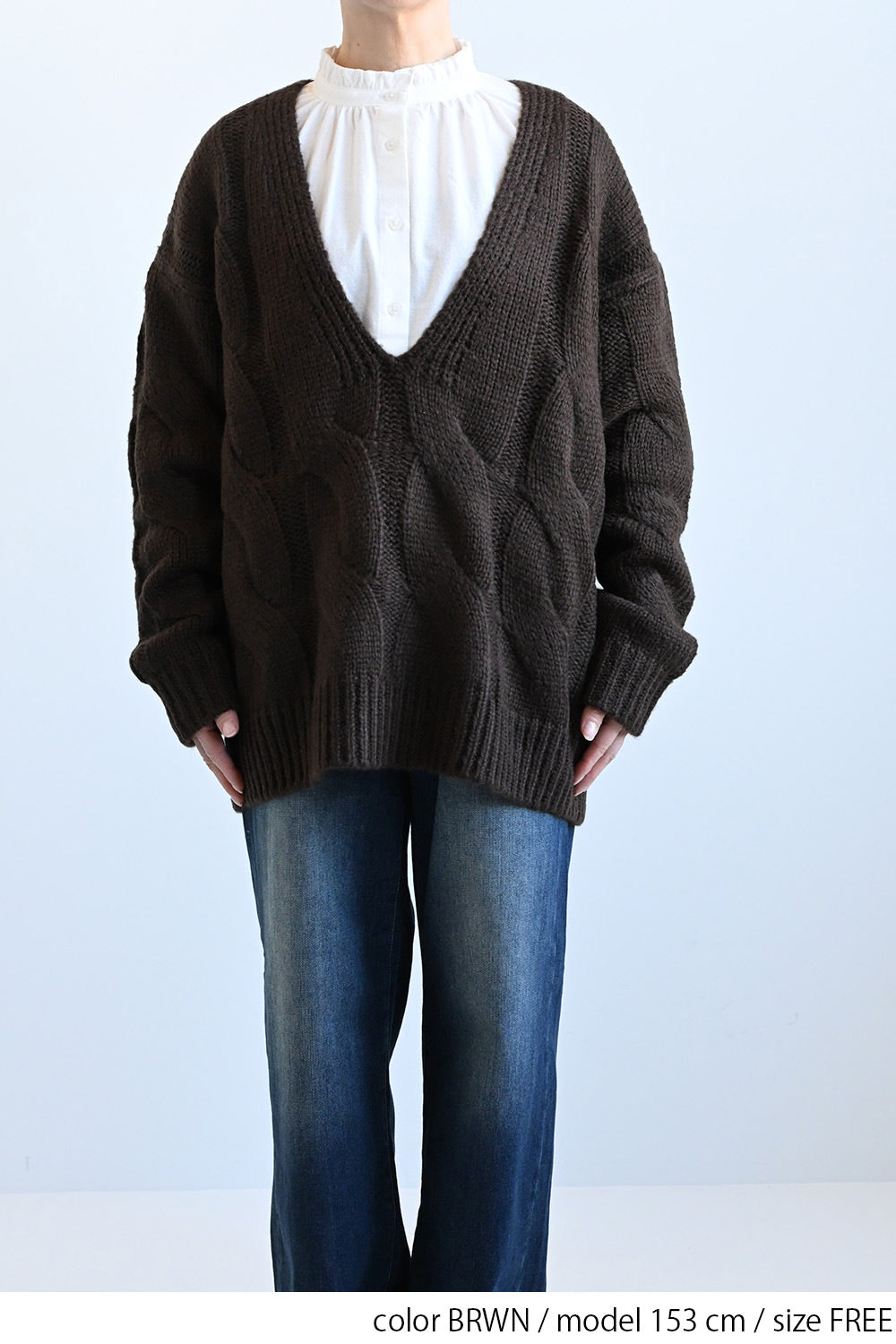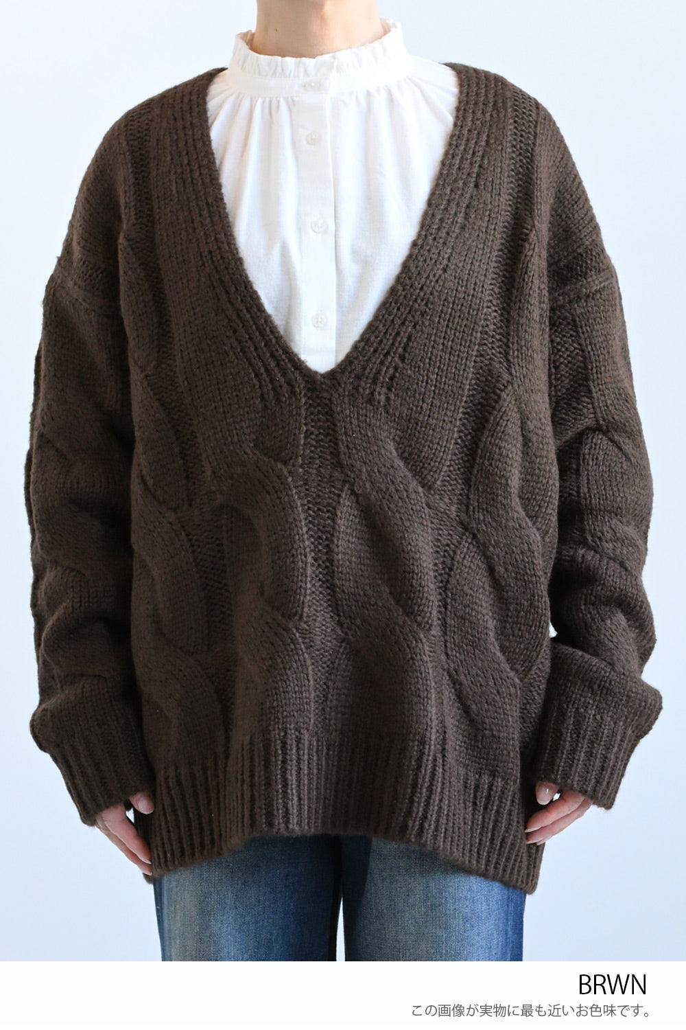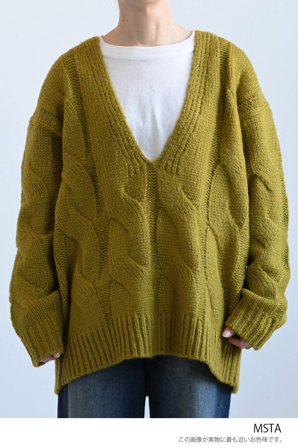 ざっくり編み立てた太ケーブルが存在感を放つ大人のためのVネックニット。