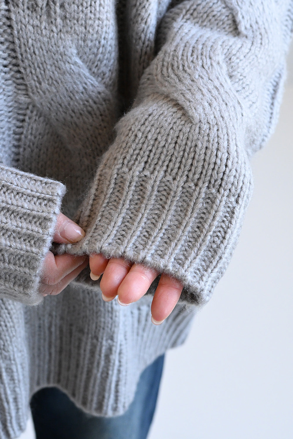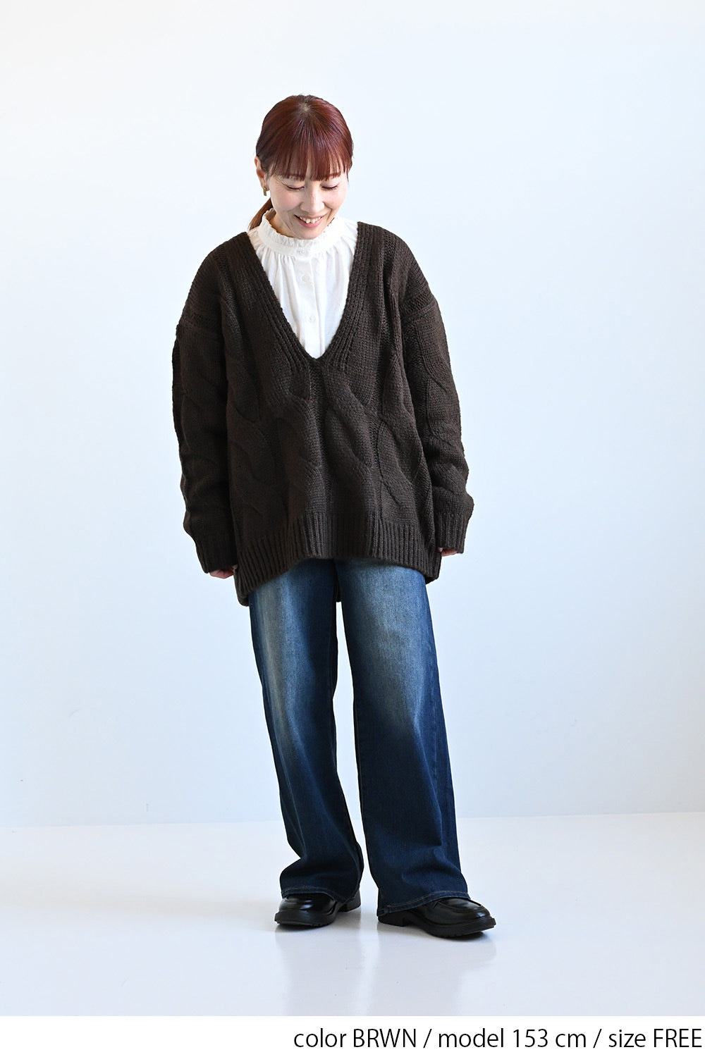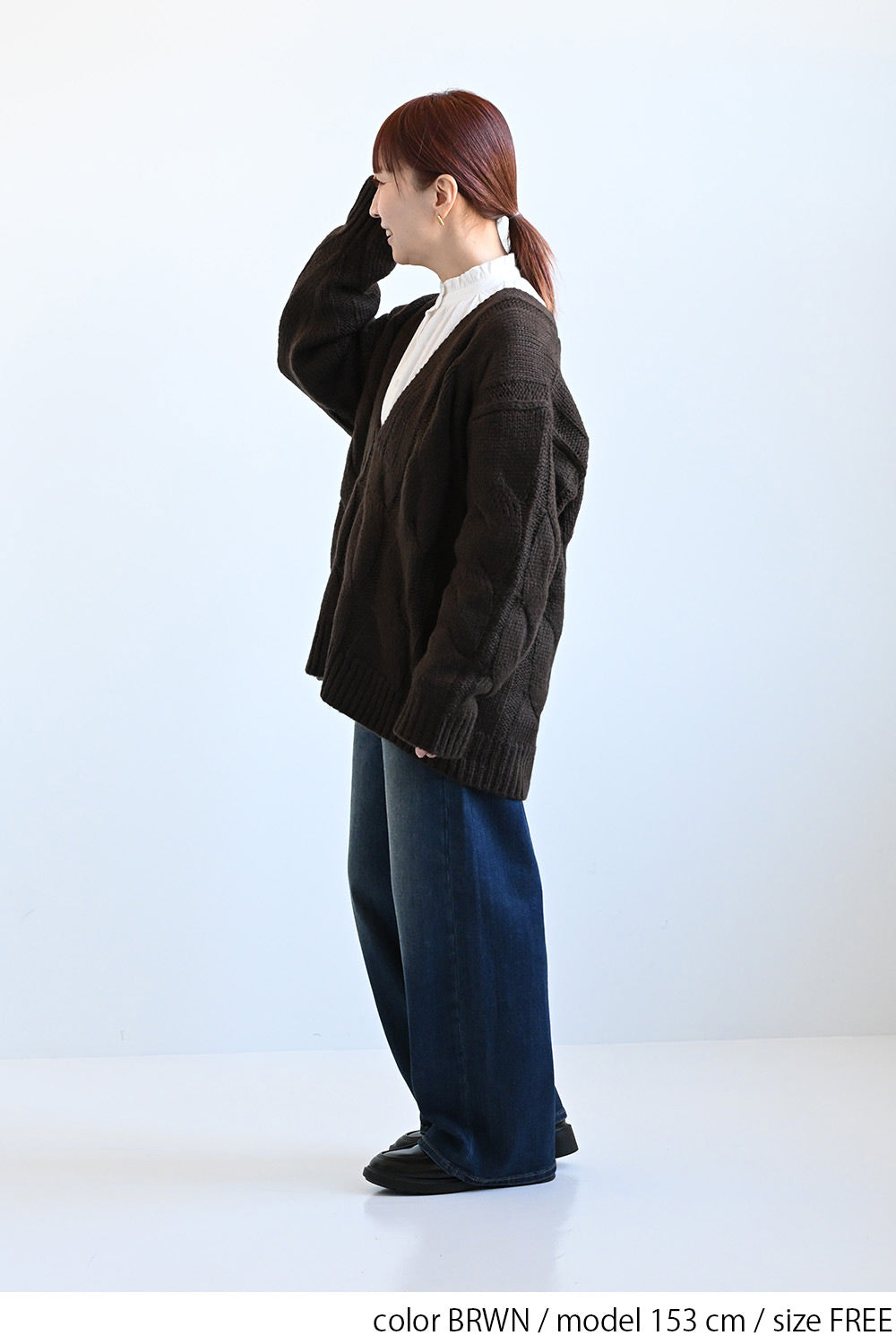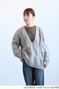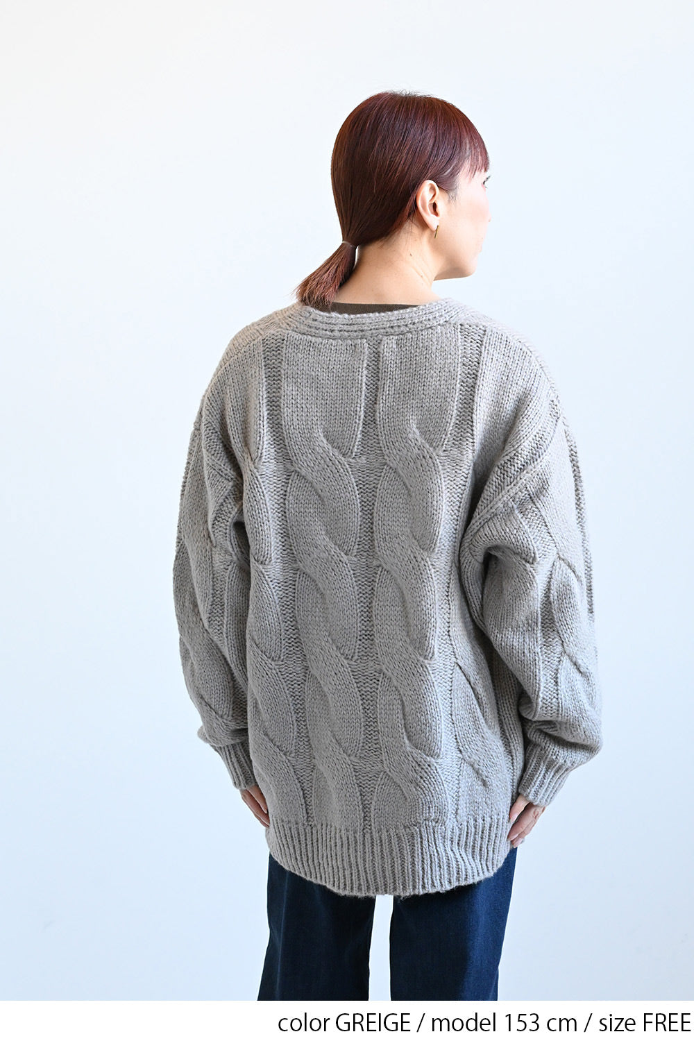 ざっくり編み立てた太ケーブルが存在感を放つ大人のためのVネックニット。