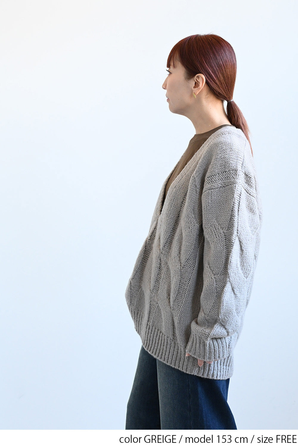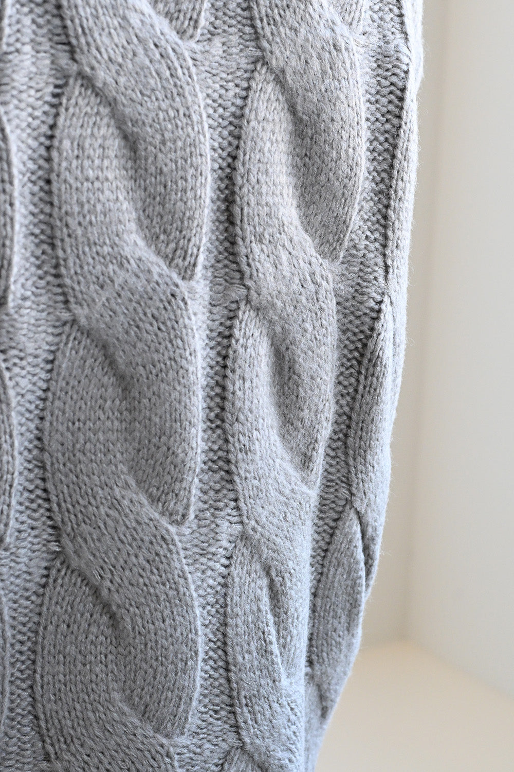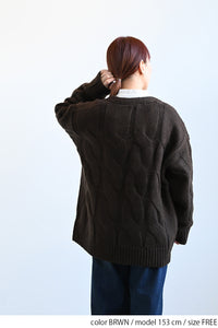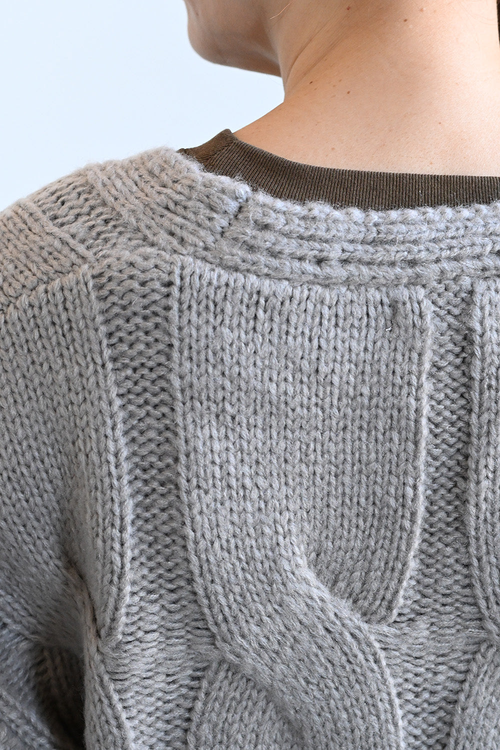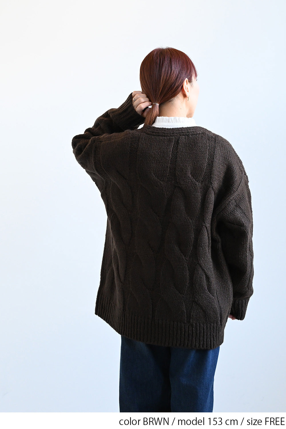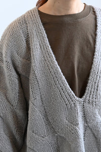 ざっくり編み立てた太ケーブルが存在感を放つ大人のためのVネックニット。