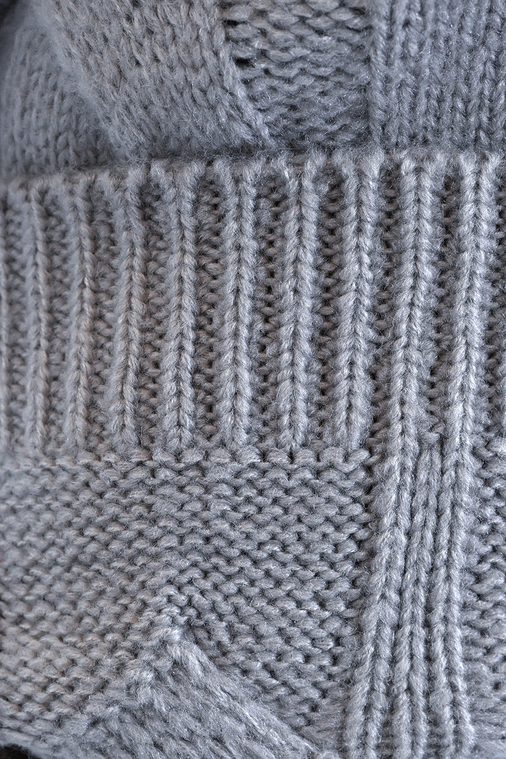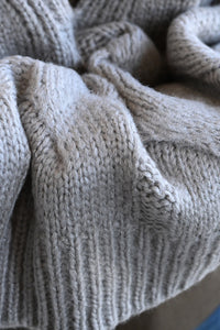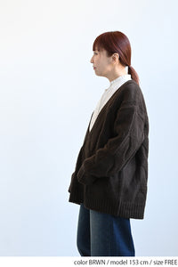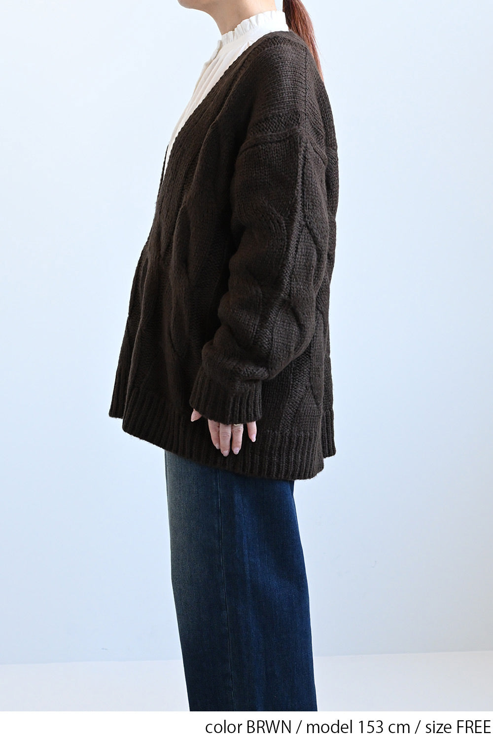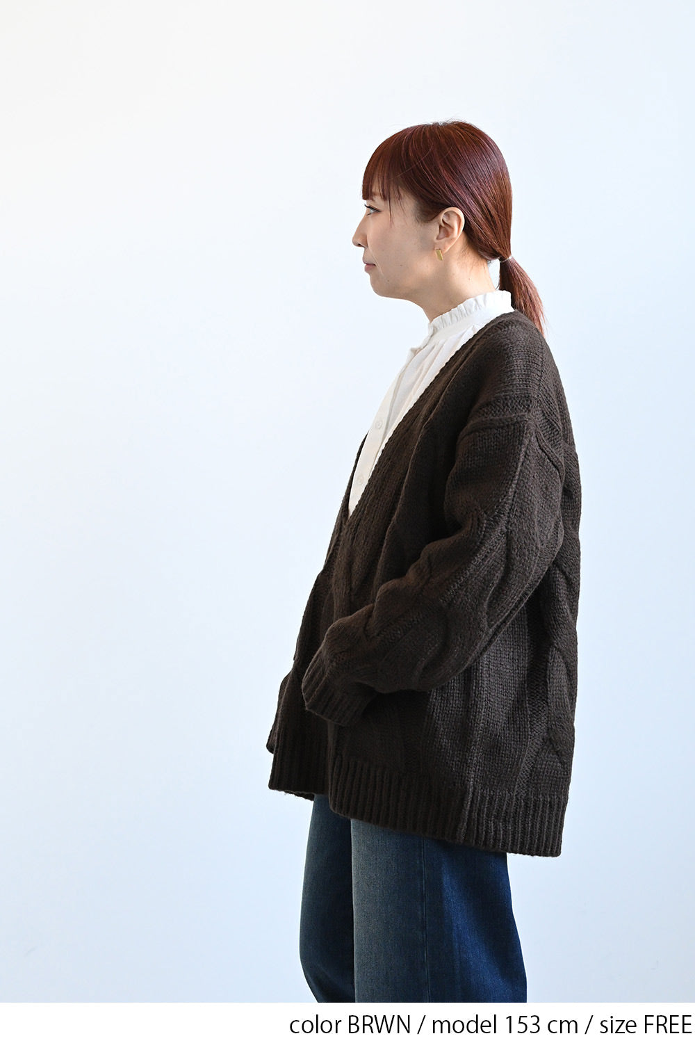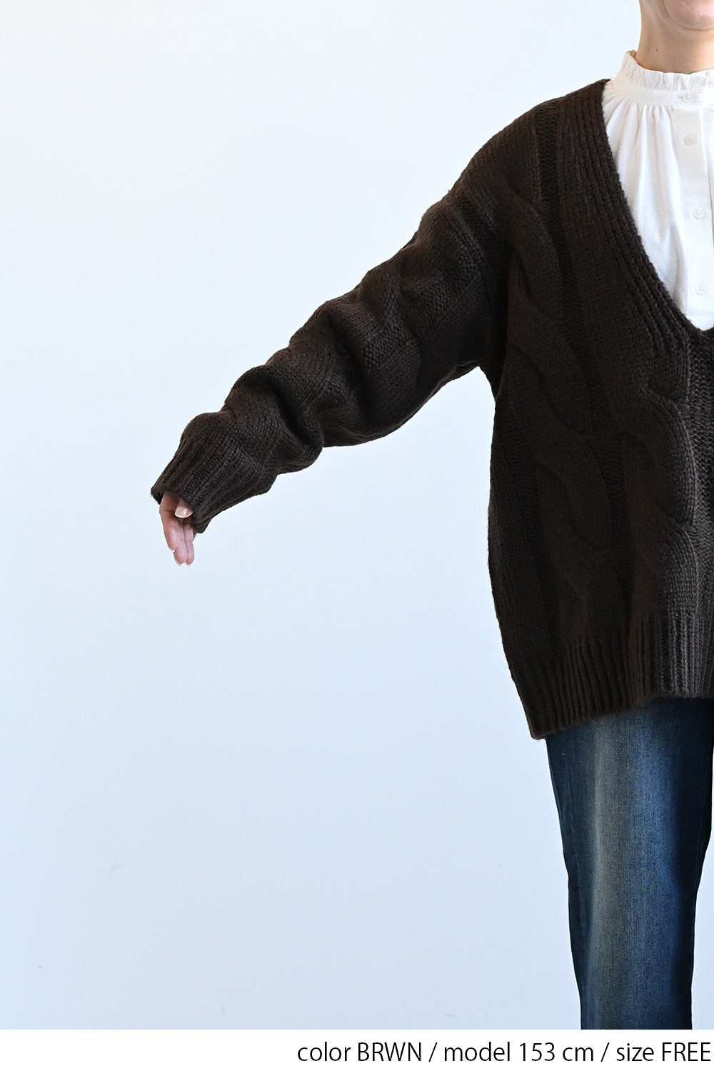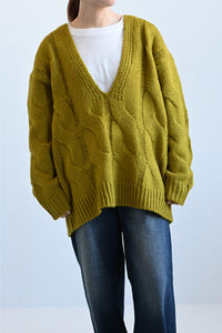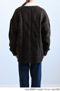 ざっくり編み立てた太ケーブルが存在感を放つ大人のためのVネックニット。