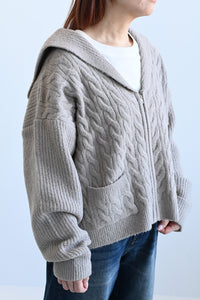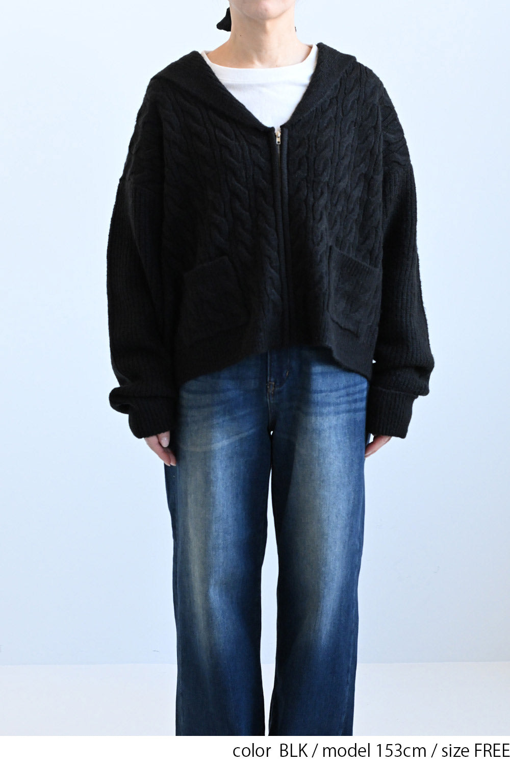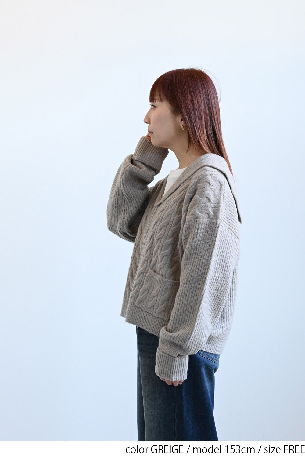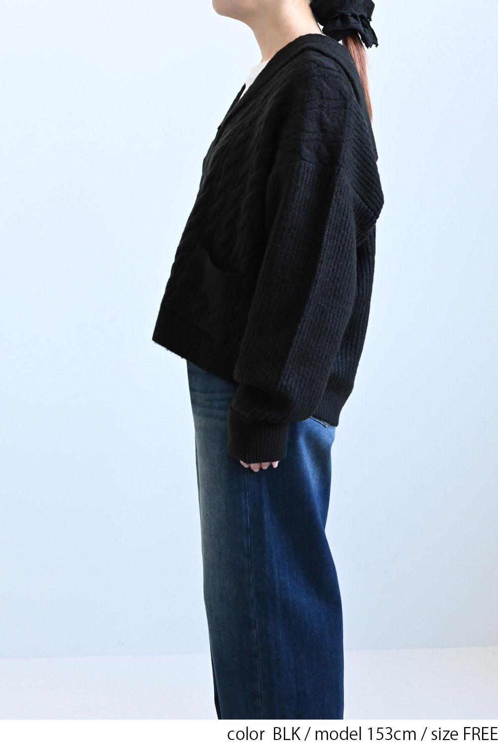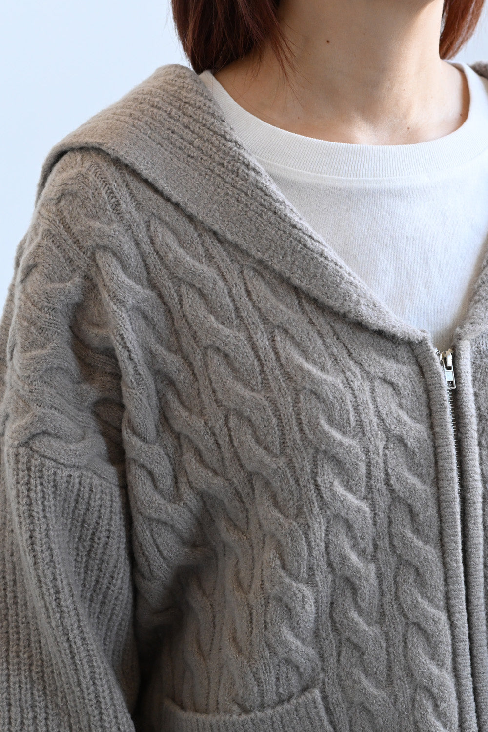 フロント部分にはケーブル編みを施し、シンプルな中にも立体感と表情をプラス。